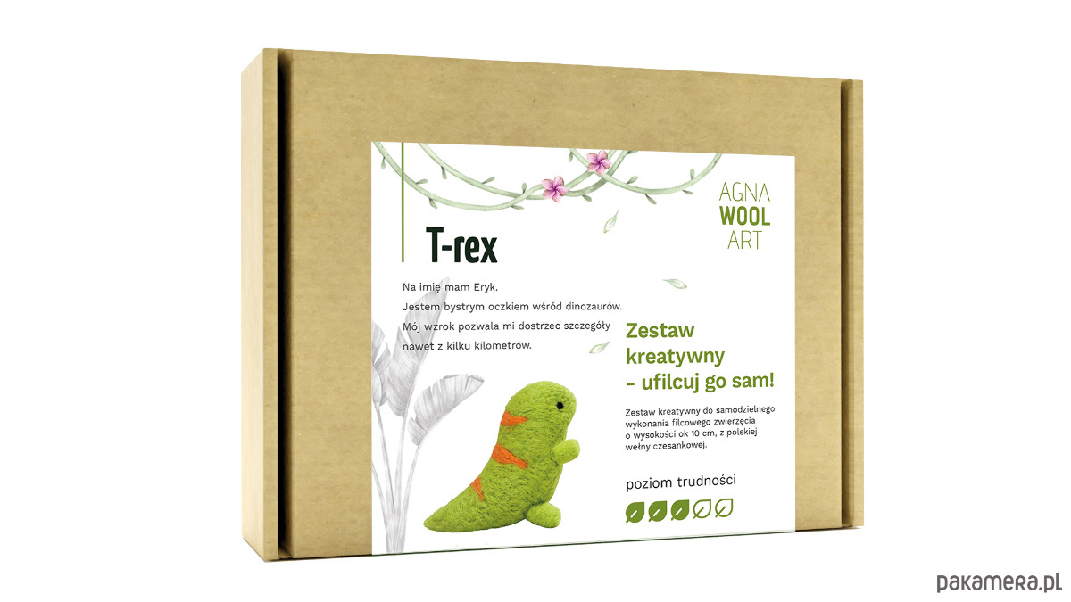 T-Rex, osiągający nawet 12 metrów długości, był jednym z najpotężniejszych mięsożerców, a teraz możesz odtworzyć jego imponującą sylwetkę dzięki temu zestawowi. Zawiera on wszystkie niezbędne elementy – wełnę, gąbkę do filcowania, trzy igły oraz instrukcję krok po kroku. Twój własnoręcznie wykonany tyranozaur może ozdobić półkę, stać się maskotką lub oryginalnym brelokiem. Całość zapakowana jest w eleganckie pudełko, co sprawia, że zestaw „T-Rex” jest także doskonałym pomysłem na prezent dla fanów dinozaurów i rękodzieła.