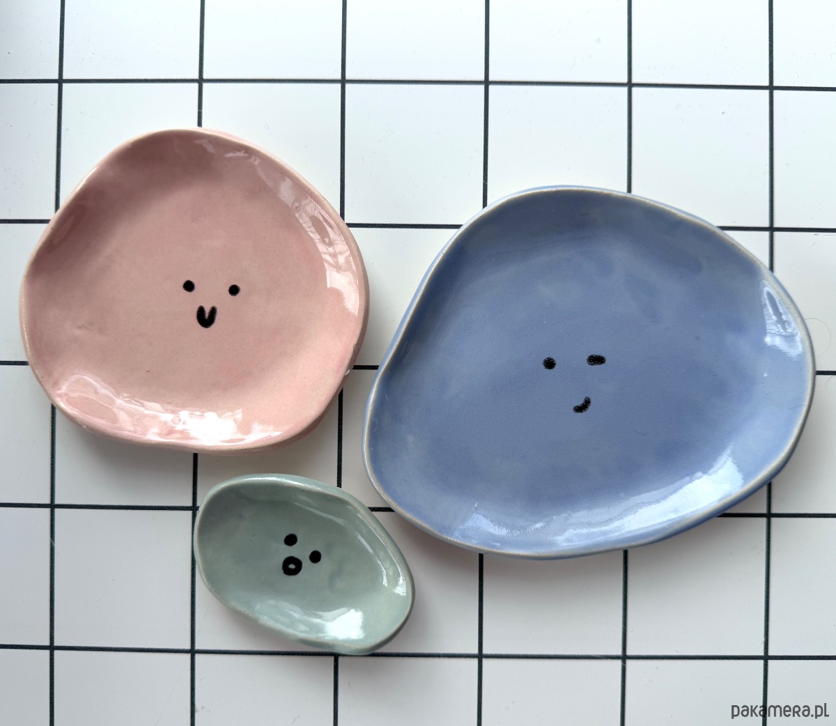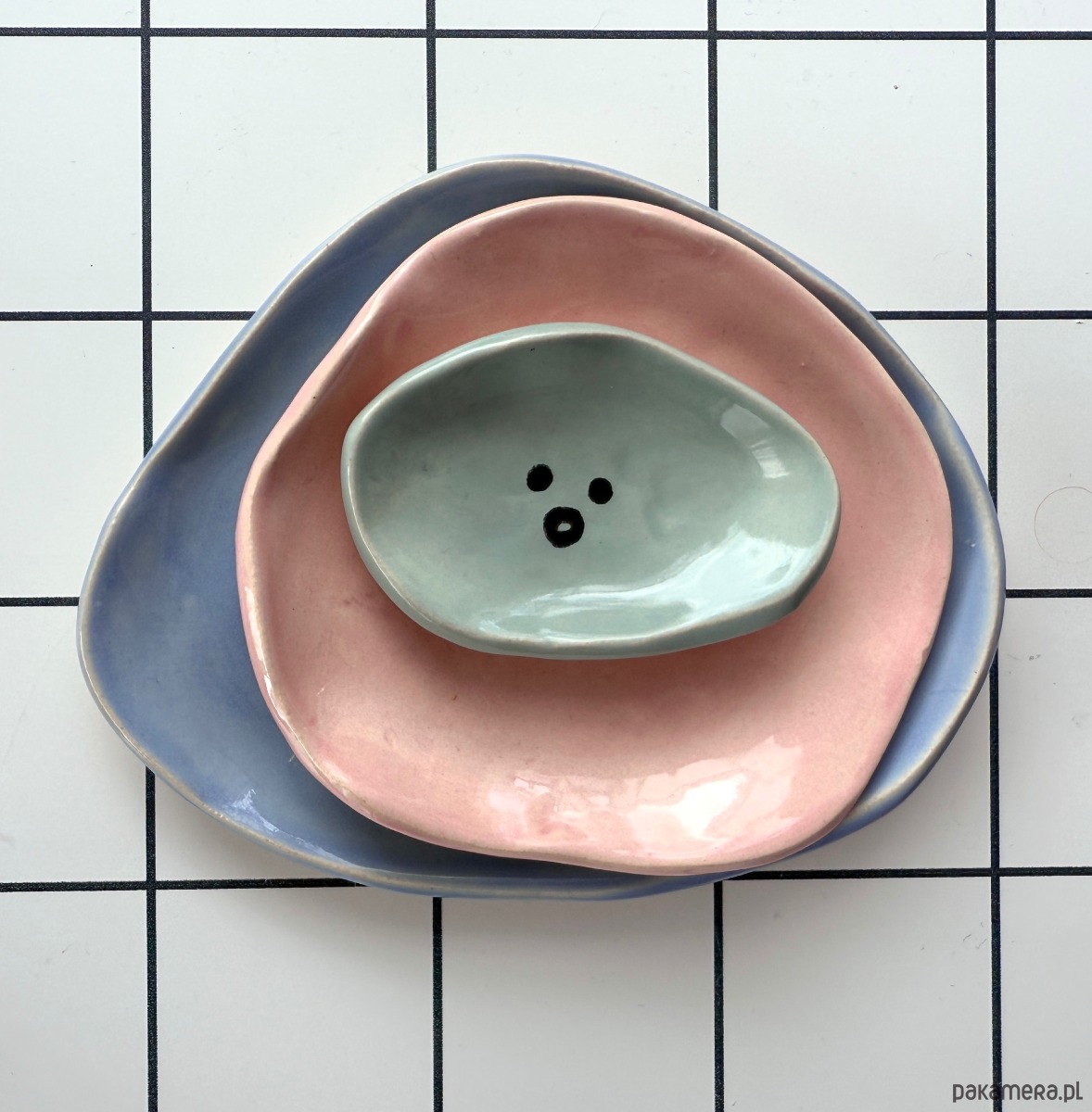 Ręcznie wykonane talerzyki, które tworzą wspaniały zestaw składający się z 3 talerzyków. Mają wiele zastosowań, mogą służyć jako talerzyki na przekąski, podstawki na biżuterię czy kadzidełko, a największy talerzyk może służyć jako talerz na deser, spokojnie zmieści się na nim kawałek ciasta :)