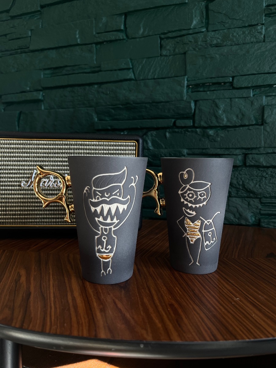 Kubki wykonane są z barwionego porcelitu, szkliwione od wewnątrz. Wypalane w temp. 1230'C. Uchwyty pokryte złotem do zdobienia ceramiki.