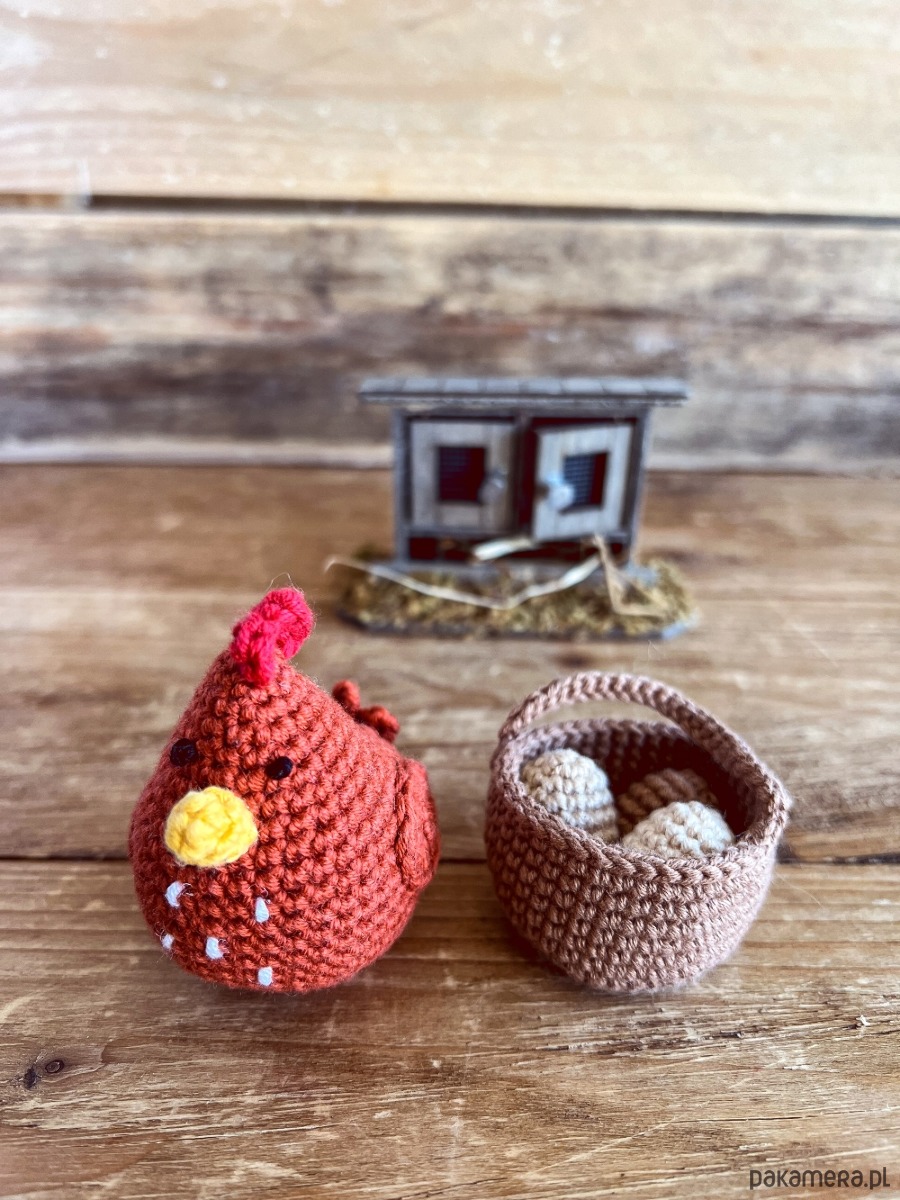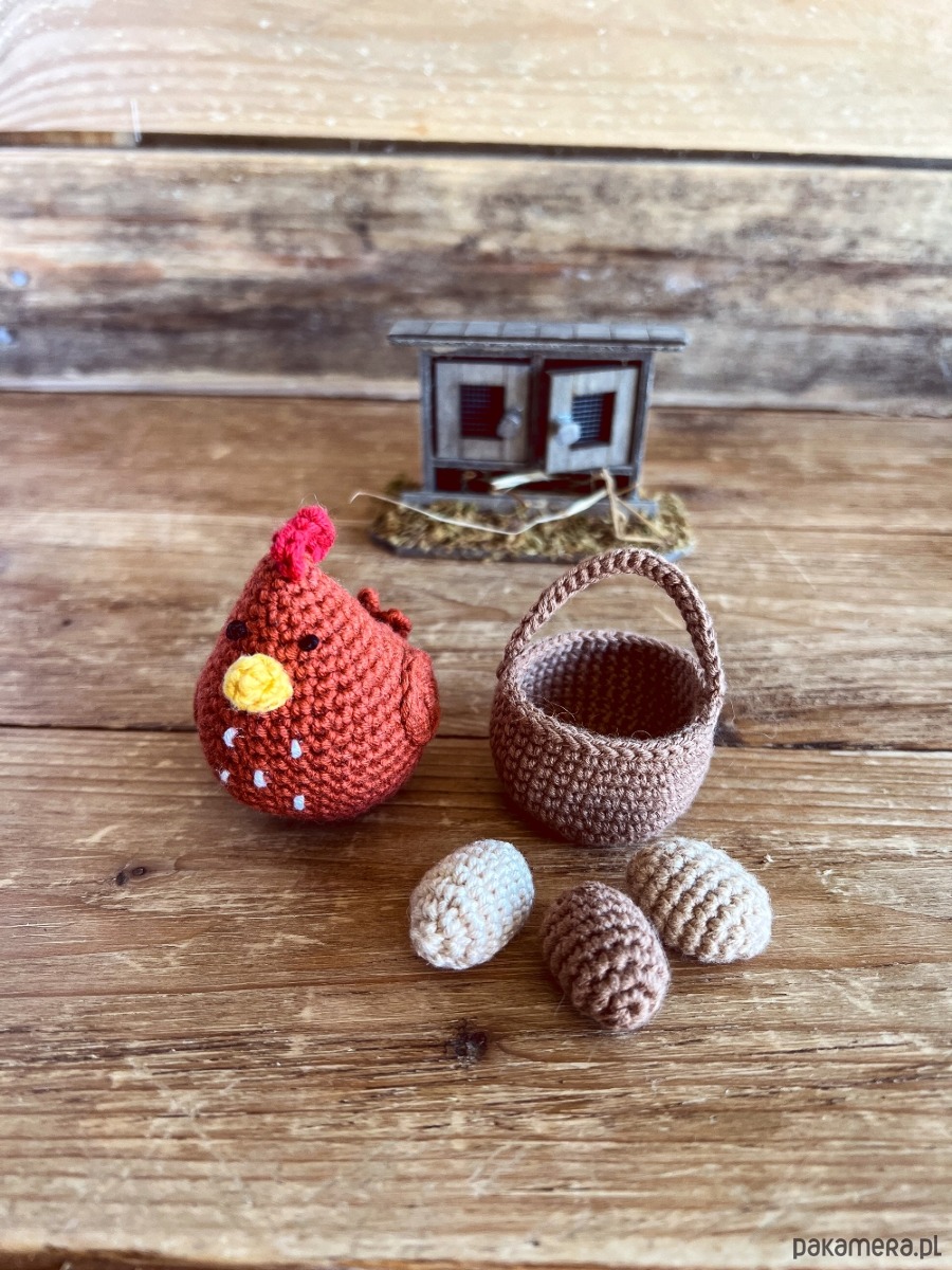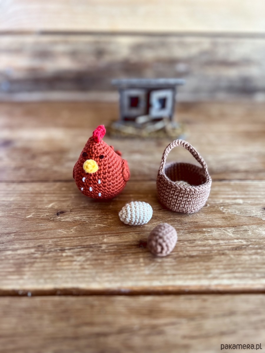 Centralną postacią zestawu jest urocza, kurka zrobiona na szydełku, która wraz z trzema jajeczkami w koszyku tworzy ujmującą kompozycję idealną na Święta Wielkanocne.