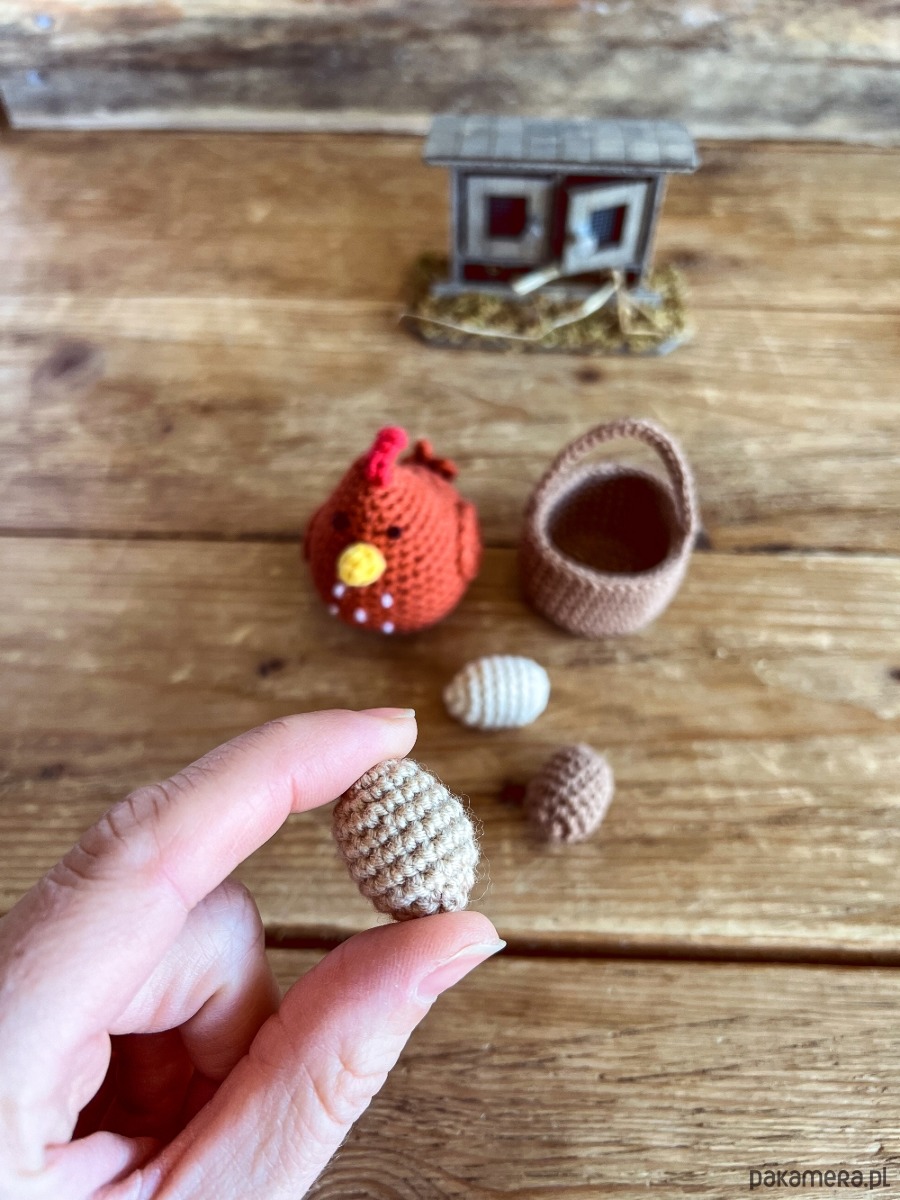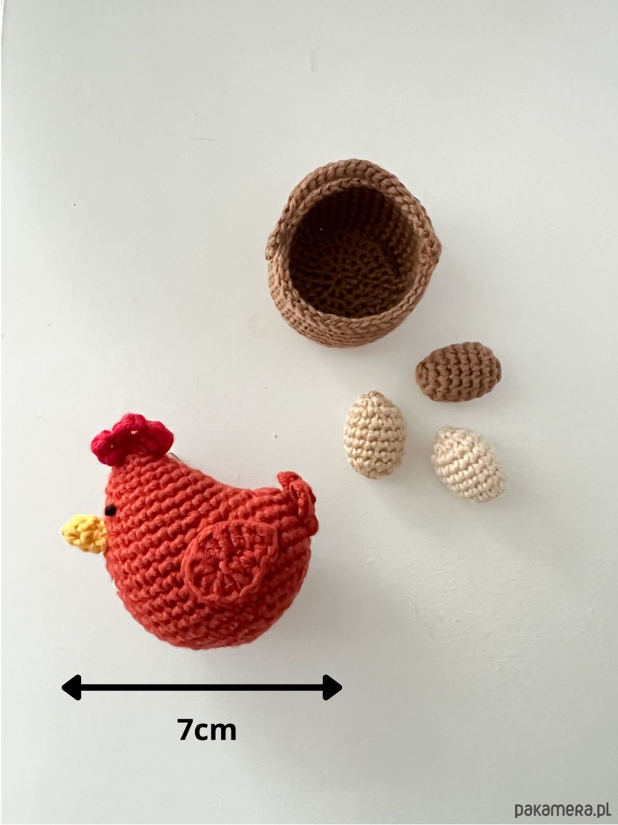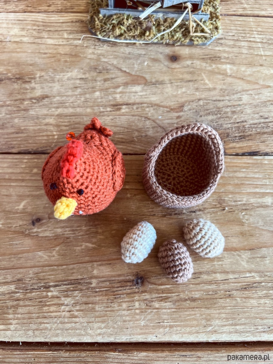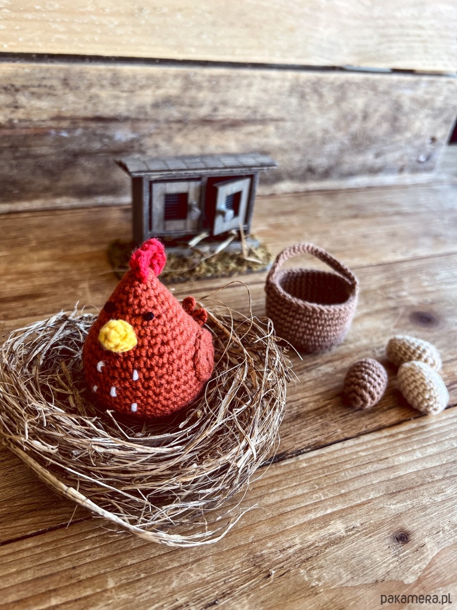 Centralną postacią zestawu jest urocza, kurka zrobiona na szydełku, która wraz z trzema jajeczkami w koszyku tworzy ujmującą kompozycję idealną na Święta Wielkanocne.
