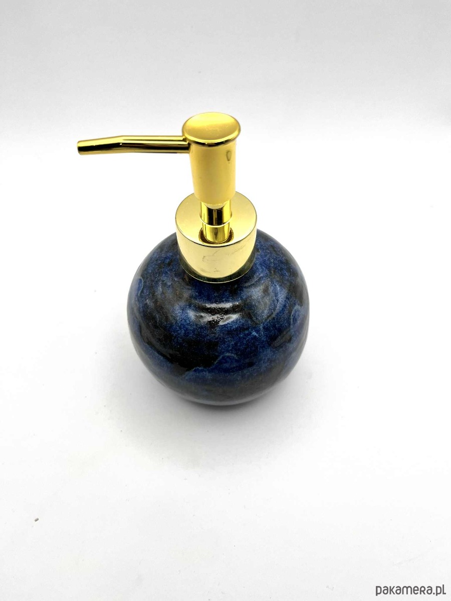 Zestaw pokryty jest szkliwem w pięknym, głębokim odcieniu niebieskiego z subtelnymi przejściami kolorystycznymi, które nadają mu naturalny, organiczny charakter. Dzięki temu każdy egzemplarz jest jedyny w swoim rodzaju. Dozownik wyposażony jest w elegancką pompkę – do wyboru: złota, srebrna, czarna lub miedziana, co pozwala dopasować zestaw do stylu Twojej łazienki.