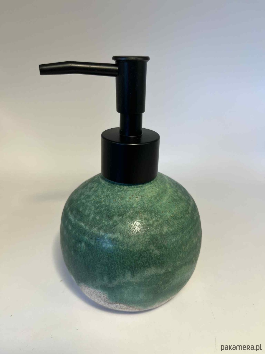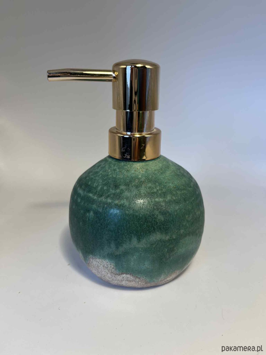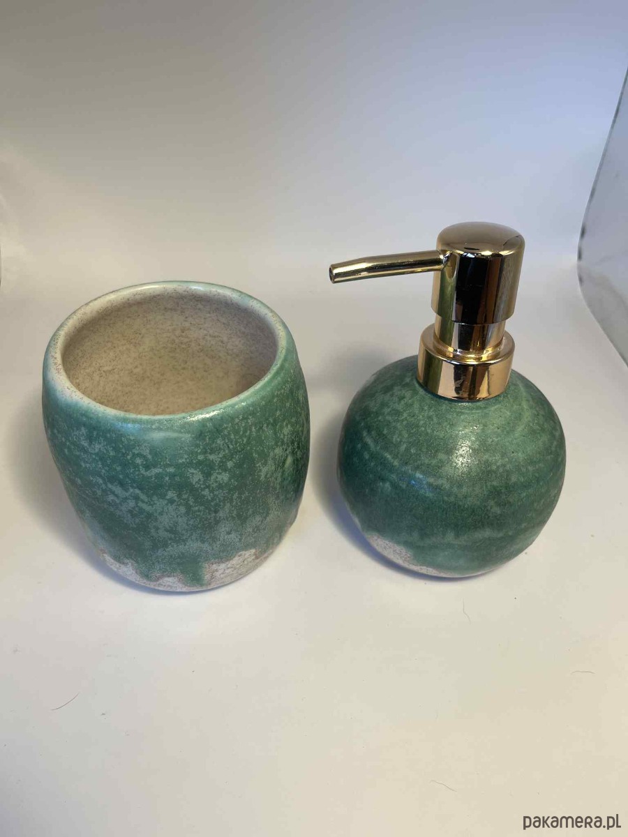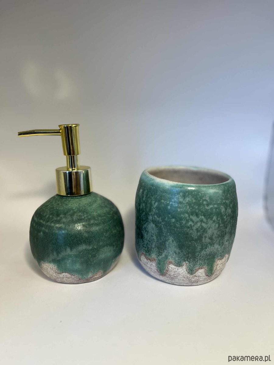 Zestaw pokryty jest szkliwem w pięknym, głębokim odcieniu zieleni z subtelnymi przejściami kolorystycznymi, które nadają mu naturalny, organiczny charakter. Dzięki temu każdy egzemplarz jest jedyny w swoim rodzaju. Dozownik wyposażony jest w elegancką pompkę – do wyboru: złota, srebrna, czarna lub miedziana, co pozwala dopasować zestaw do stylu Twojej łazienki.