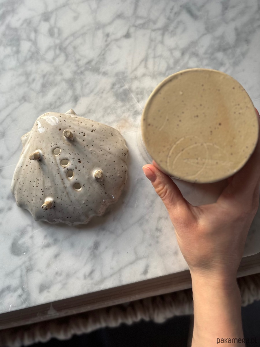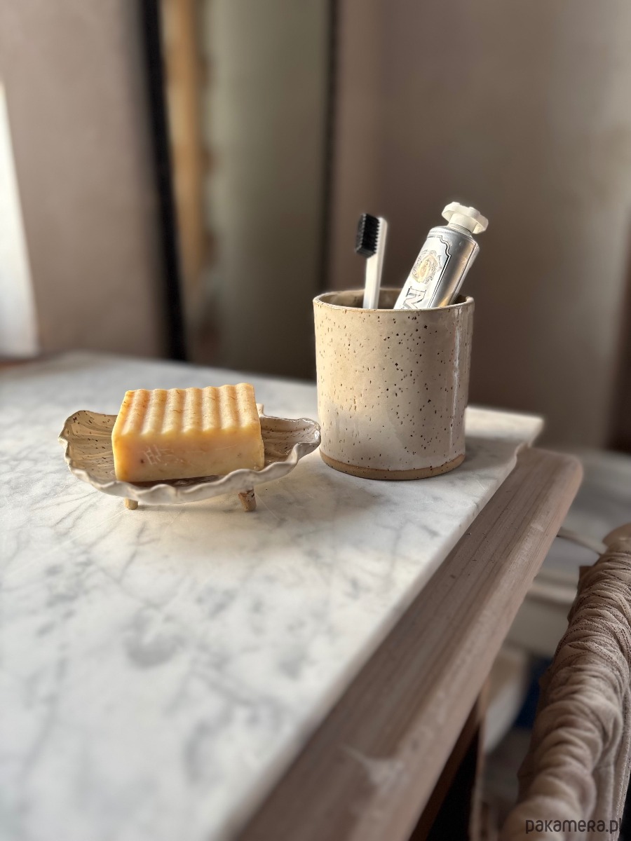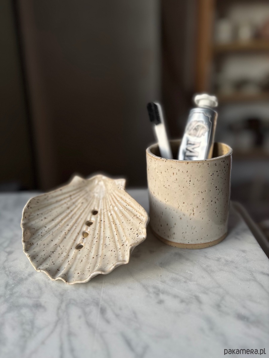 - Ręcznie stworzony ceramiczny zestaw łazienkowy z mydelniczką muszlą, na nóżkach, z dziurkami oraz odpływem, co gwarantuje wysoki komfort użytkowania.