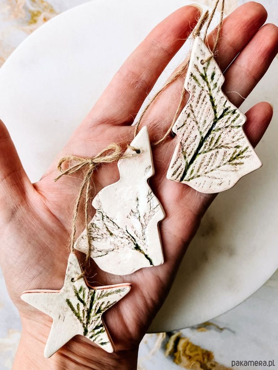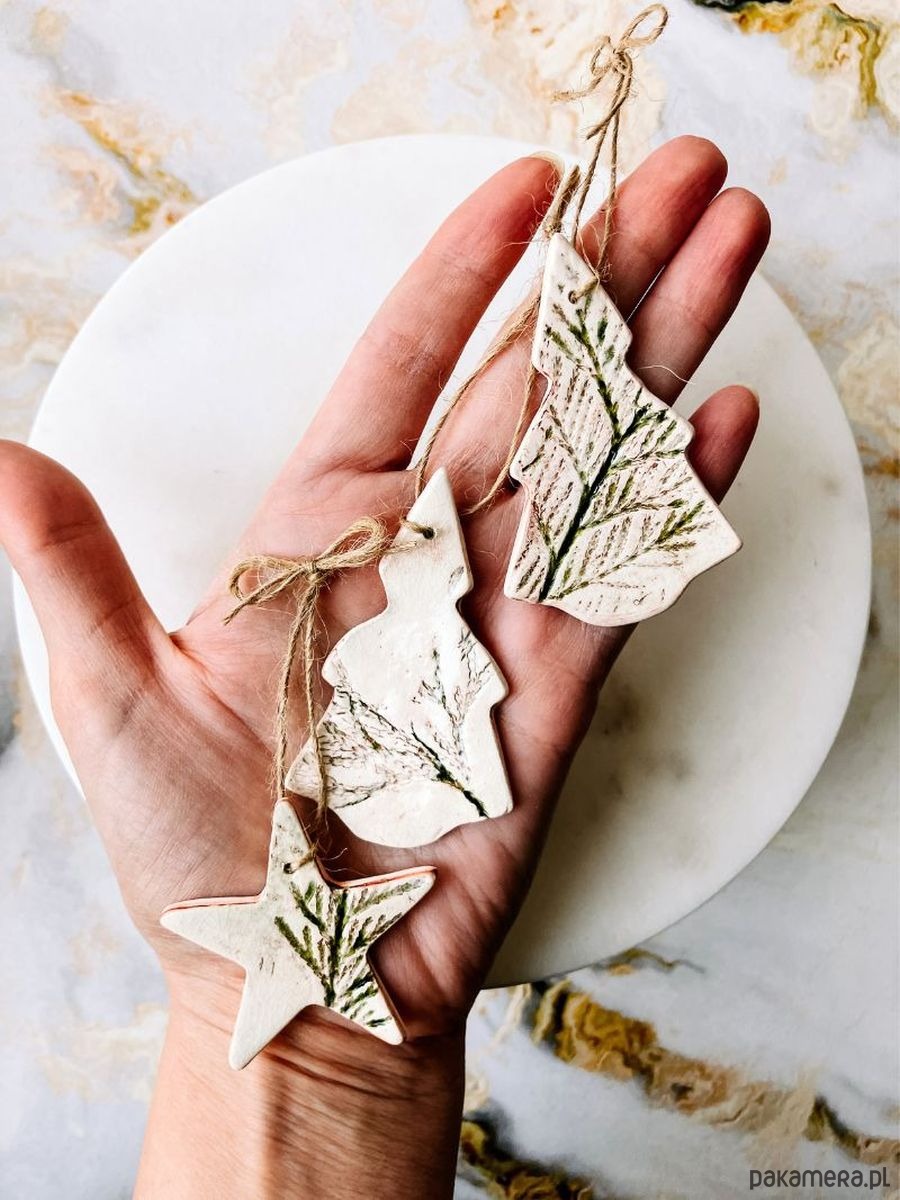 Ręcznie wykonane zawieszki w bieli, z delikatnymi zielonymi odciskami roślin, nie są identyczne — każda nosi swój własny ślad dłoni i natury. Razem tworzą zgrany trio, które nie potrzebuje blasku i przesady, by przyciągać spojrzenia.