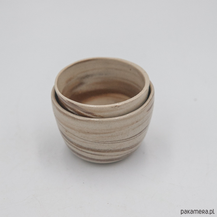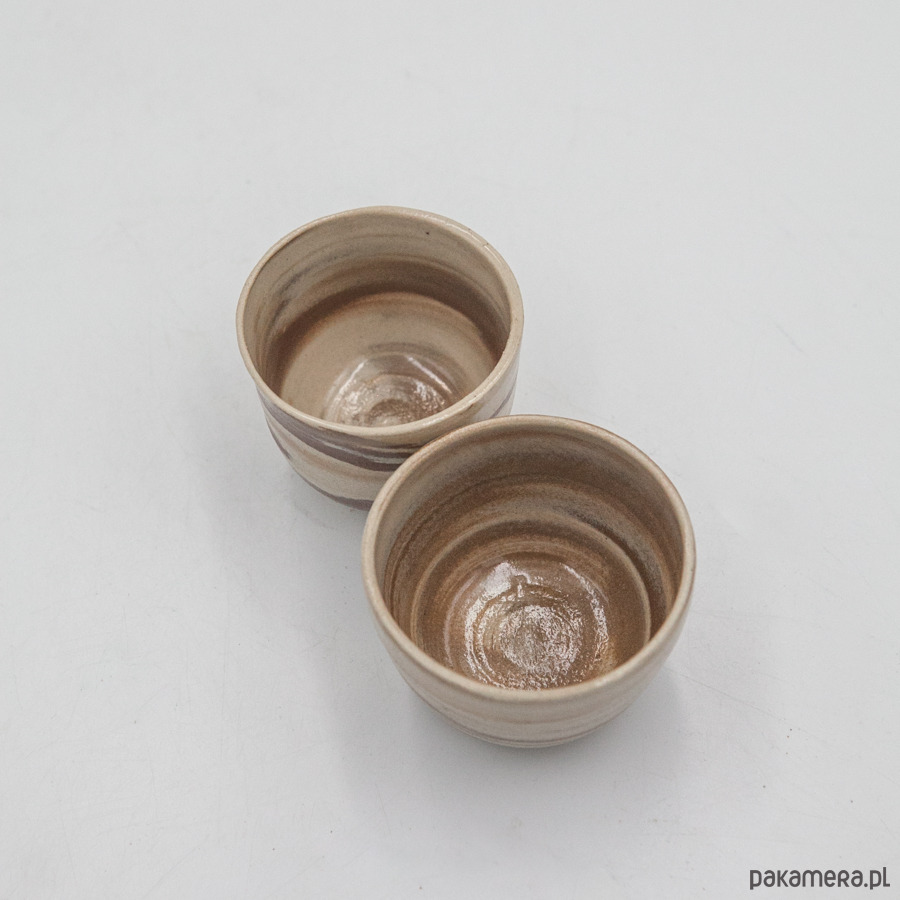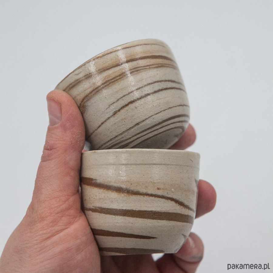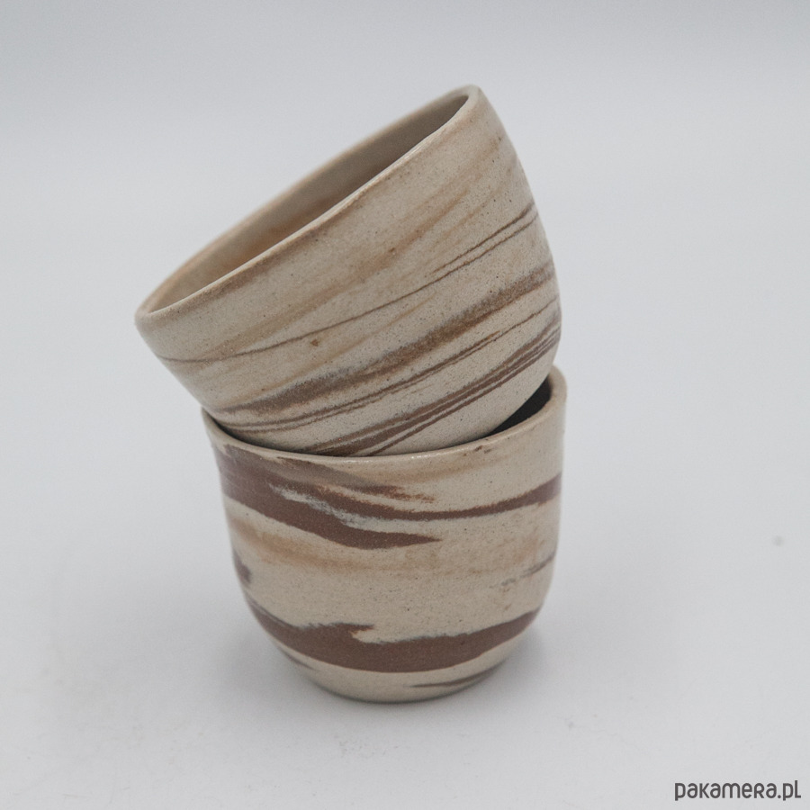 Dwie małe czarki na espresso w stylu nerikomi (glina w różnych kolorach), pokryte szkliwem transparentnym wewnątrz i na zewnątrz.