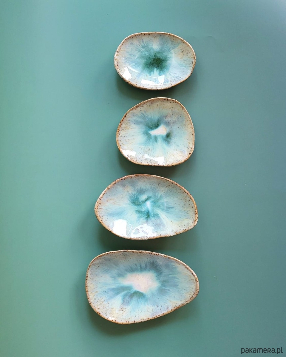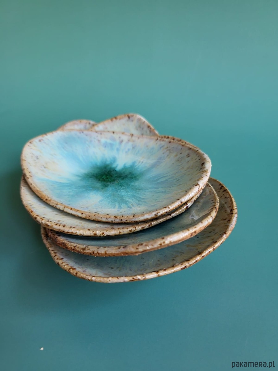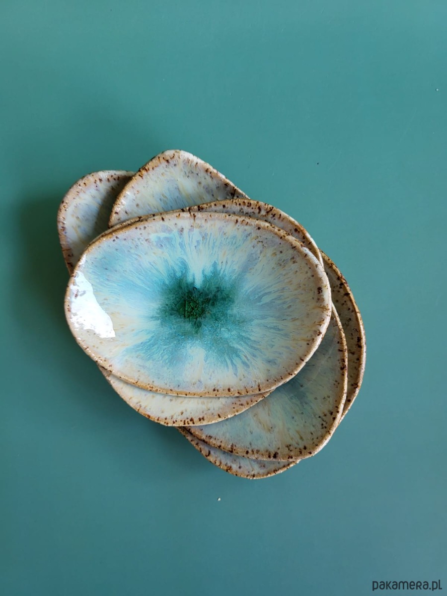 Ręcznie wykonane paterki ceramiczne w pięknym, turkusowo-morskim odcieniu z delikatnymi beżowymi rantami. Każda z nich jest niepowtarzalna – formowana i szkliwiona ręcznie, co nadaje im wyjątkowego charakteru.