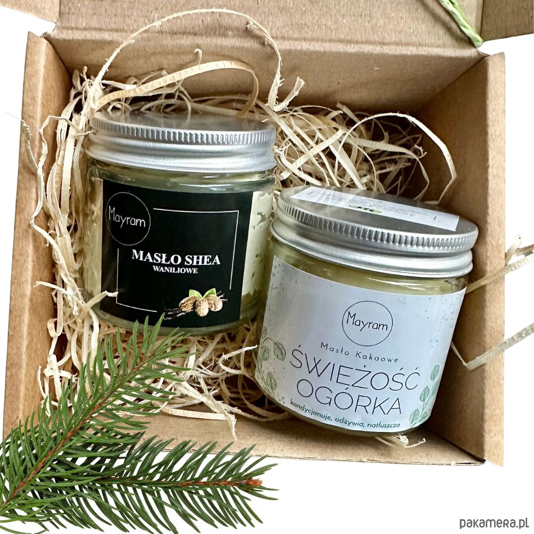 Zestaw zawiera dwa masła jedno o ciepłym zapach wanilii przełamane bergamotką na bazie masła Shea. Drugie masło Świeżość ogórka o rześkim zapach, na bazie masła kakaowego. Masła idealnie się uzupełniają.