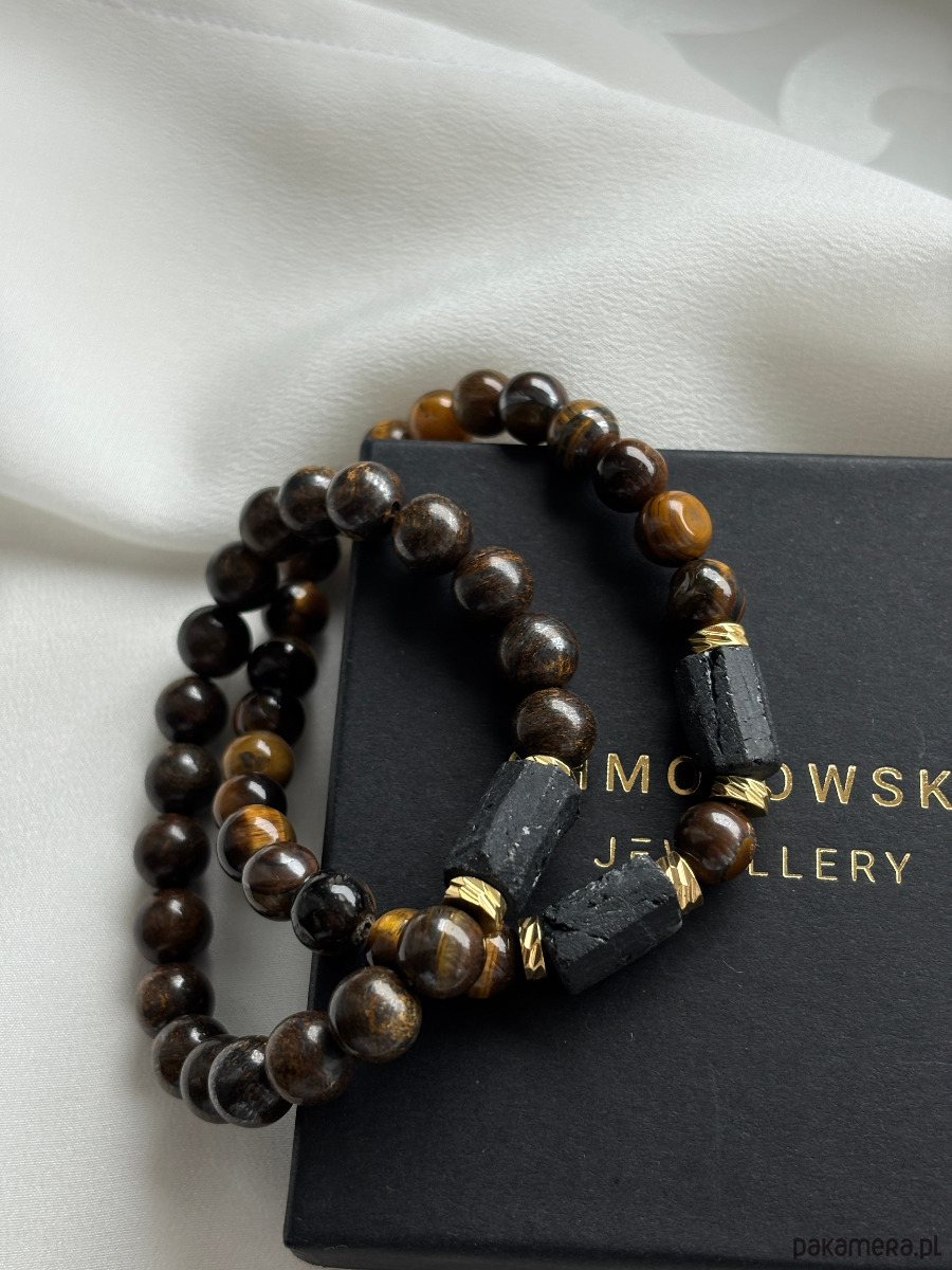 Bransoletki wykonane są na gumce z użyciem kamieni tygrysiego oka, turmalinu czarnego, bronzytu i przekładek pozłacanych.