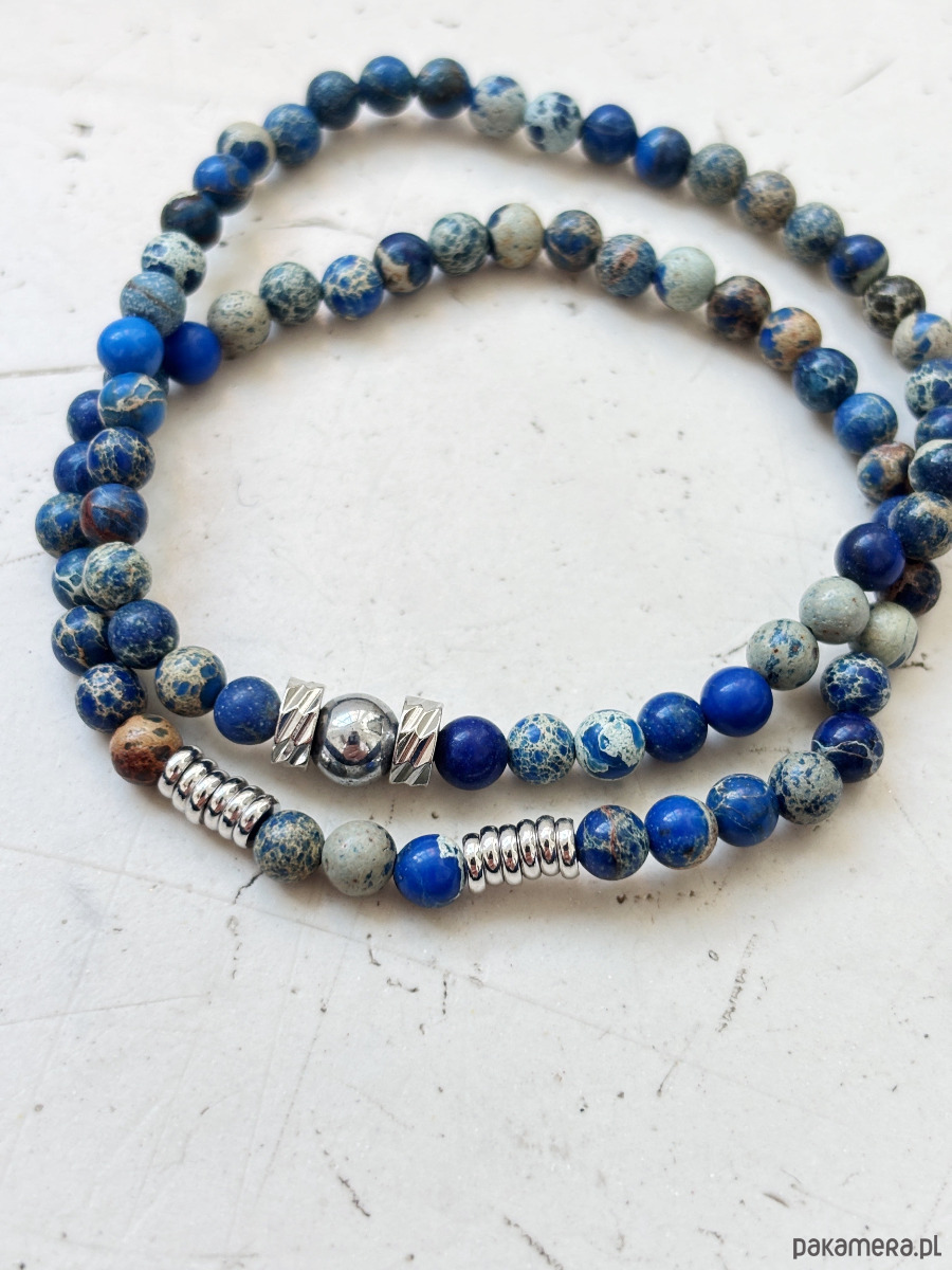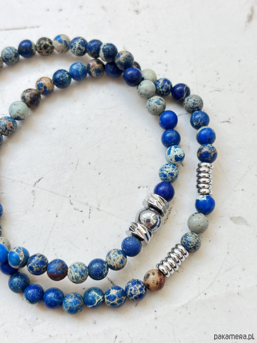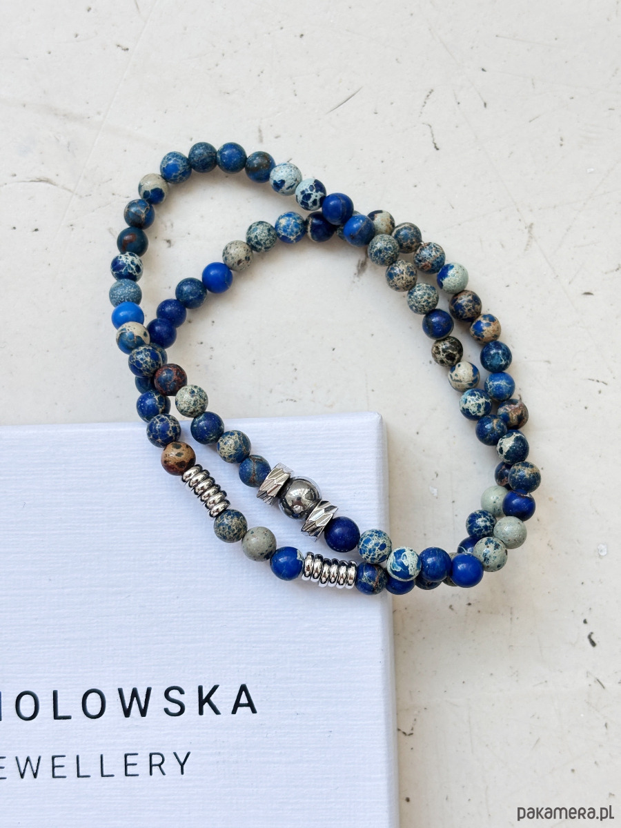 Bransoletka składa się z jaspisu niebieskiego,hematytu oraz przekładki w kolorze srebrnym.