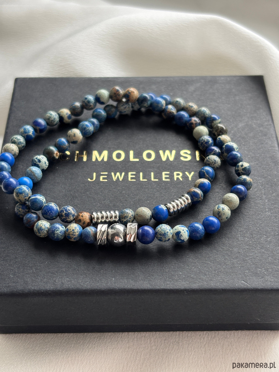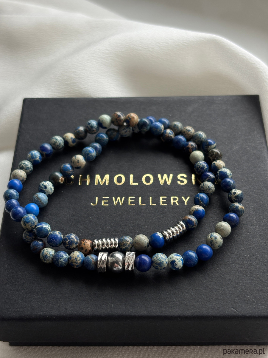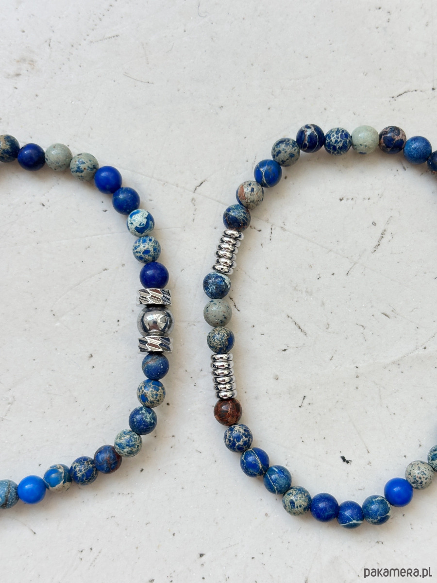 Bransoletka składa się z jaspisu niebieskiego,hematytu oraz przekładki w kolorze srebrnym.