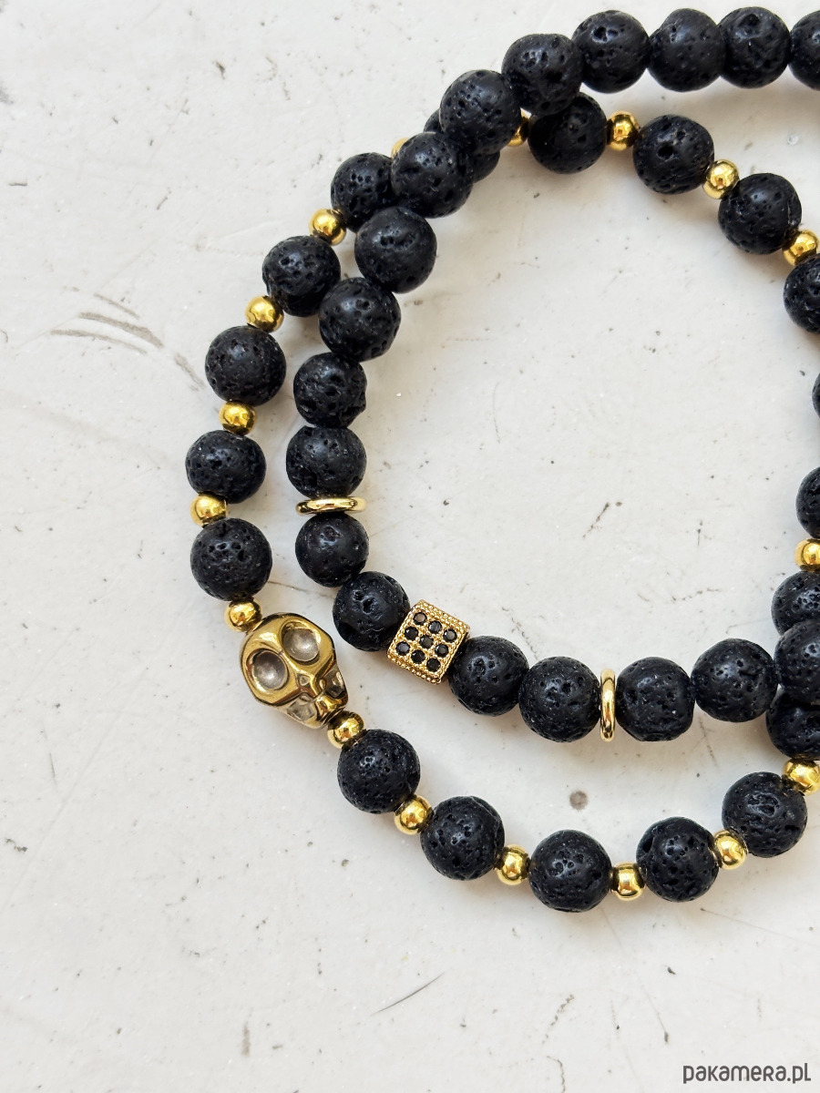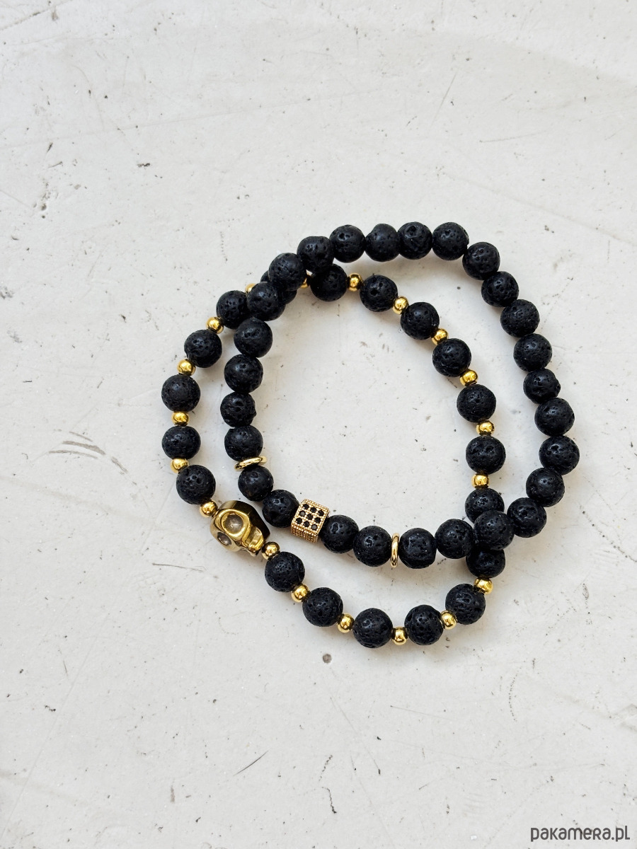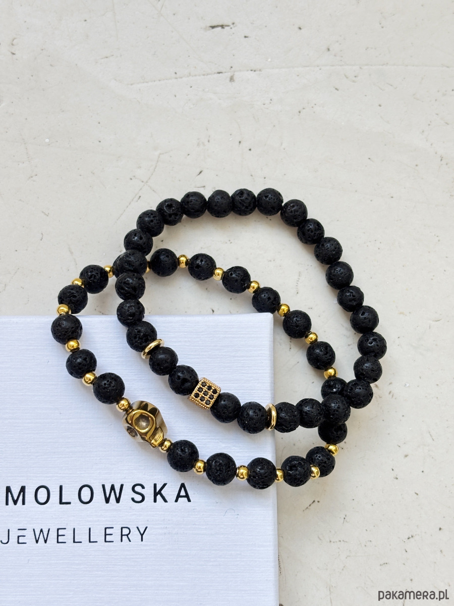 Bransoletki wykonane są na gumce jubilerskiej z użyciem Lawy Wulkanicznej i Hematytu.