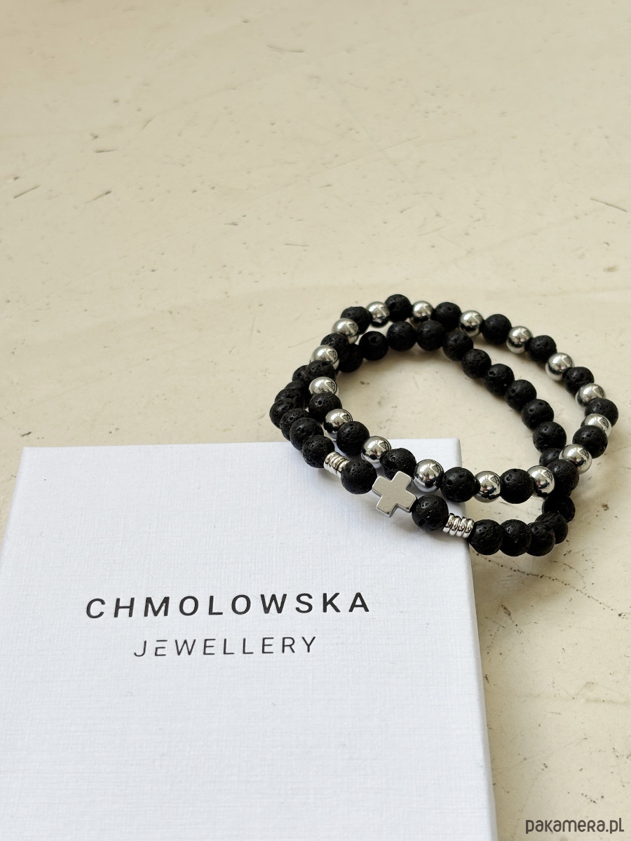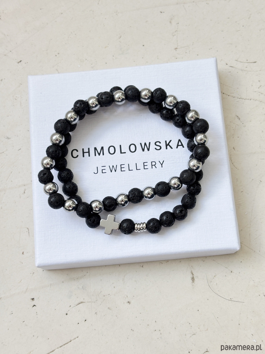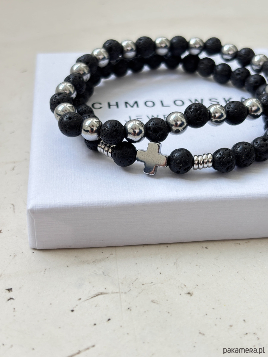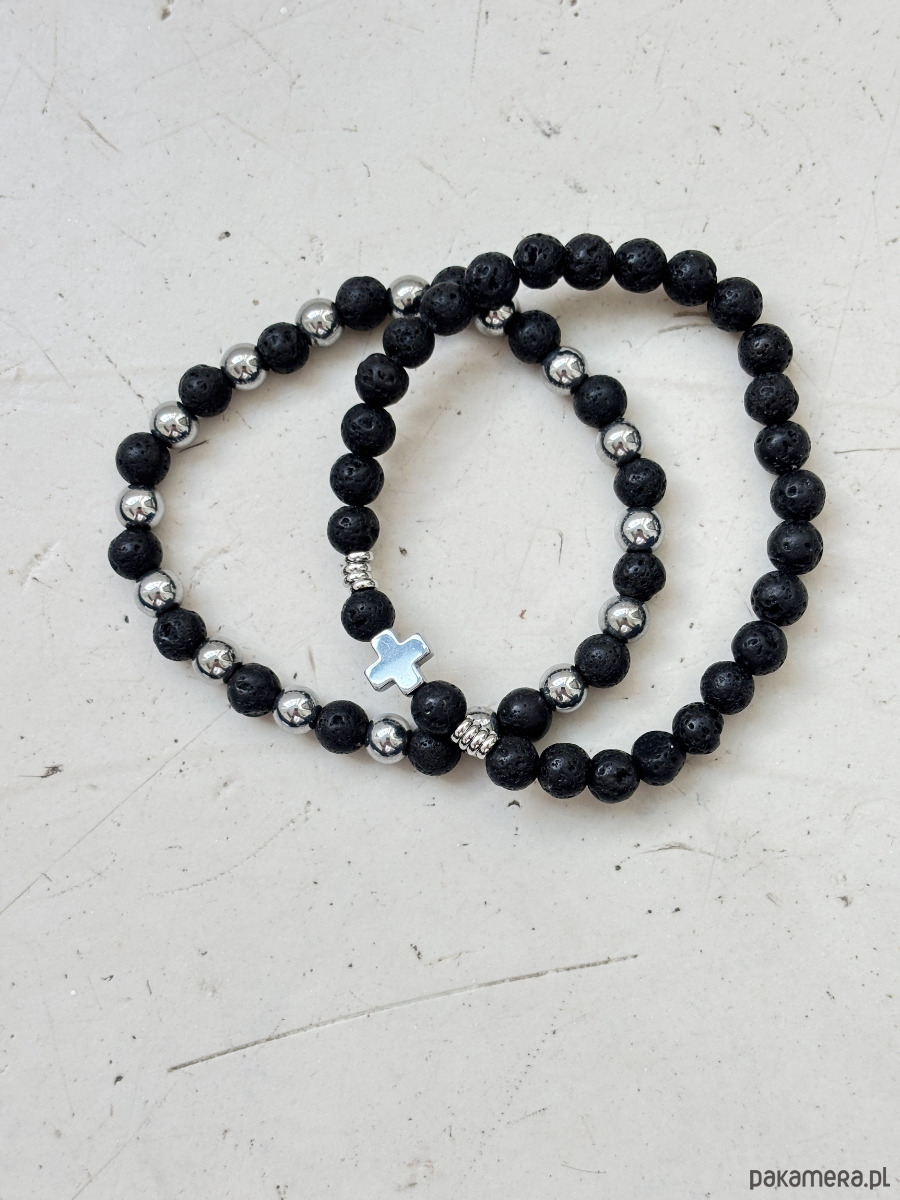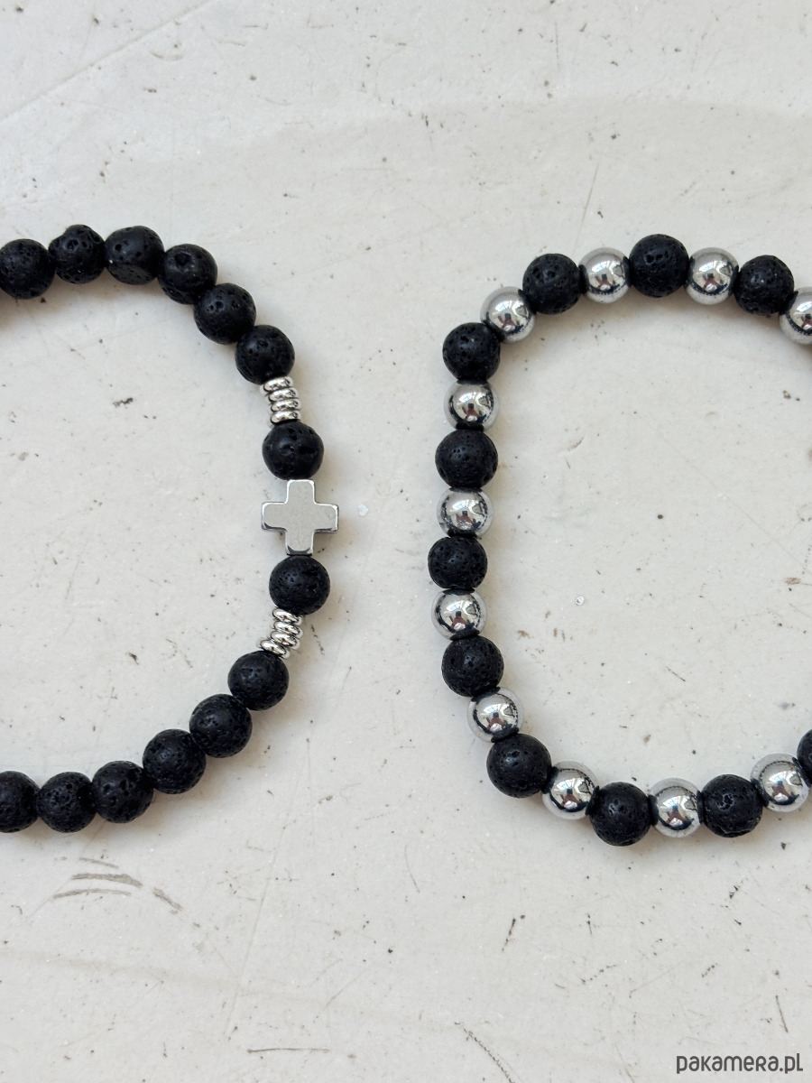 Bransoletki wykonane są na gumce jubilerskiej z użyciem lawy i hematytu.