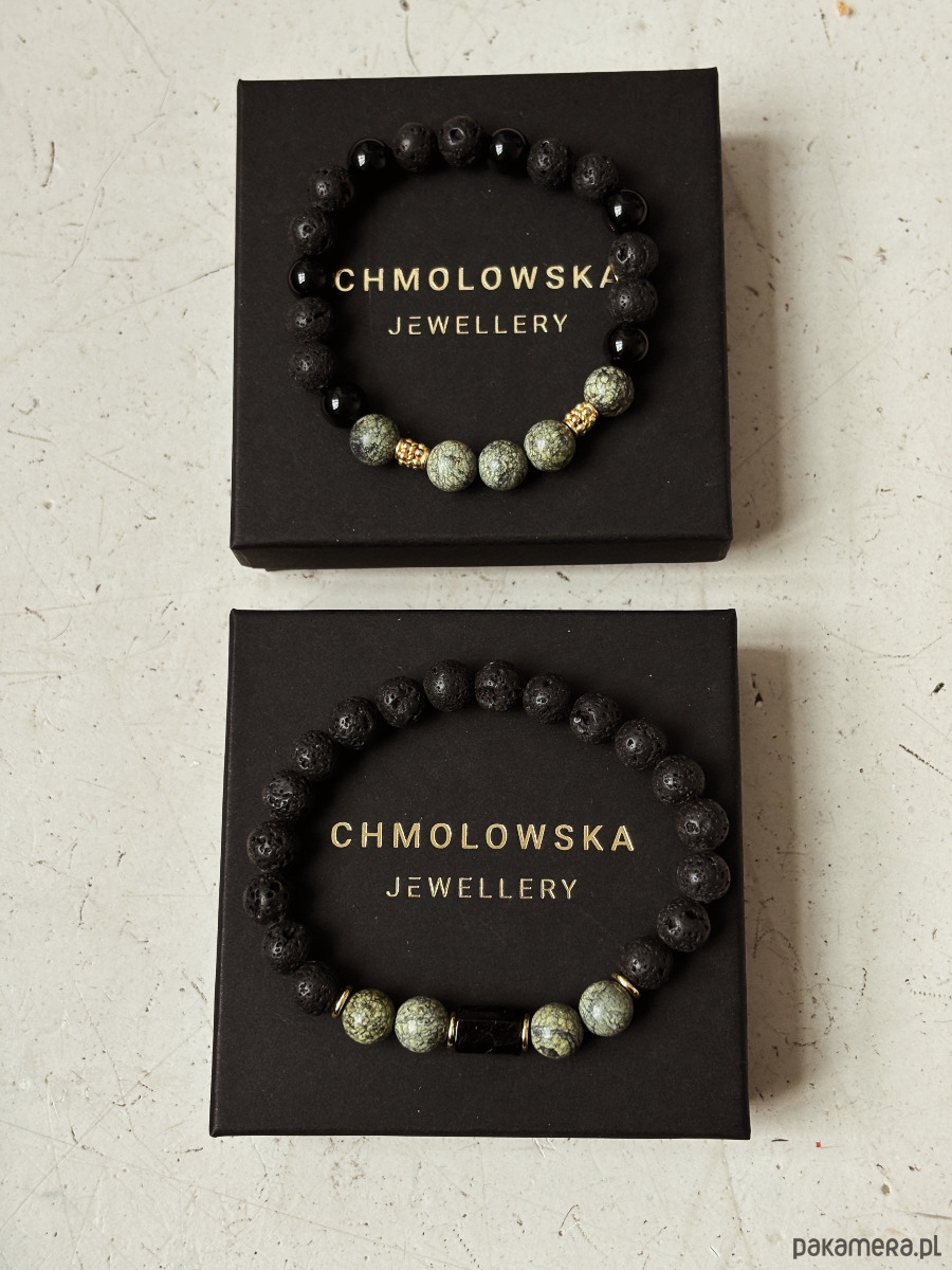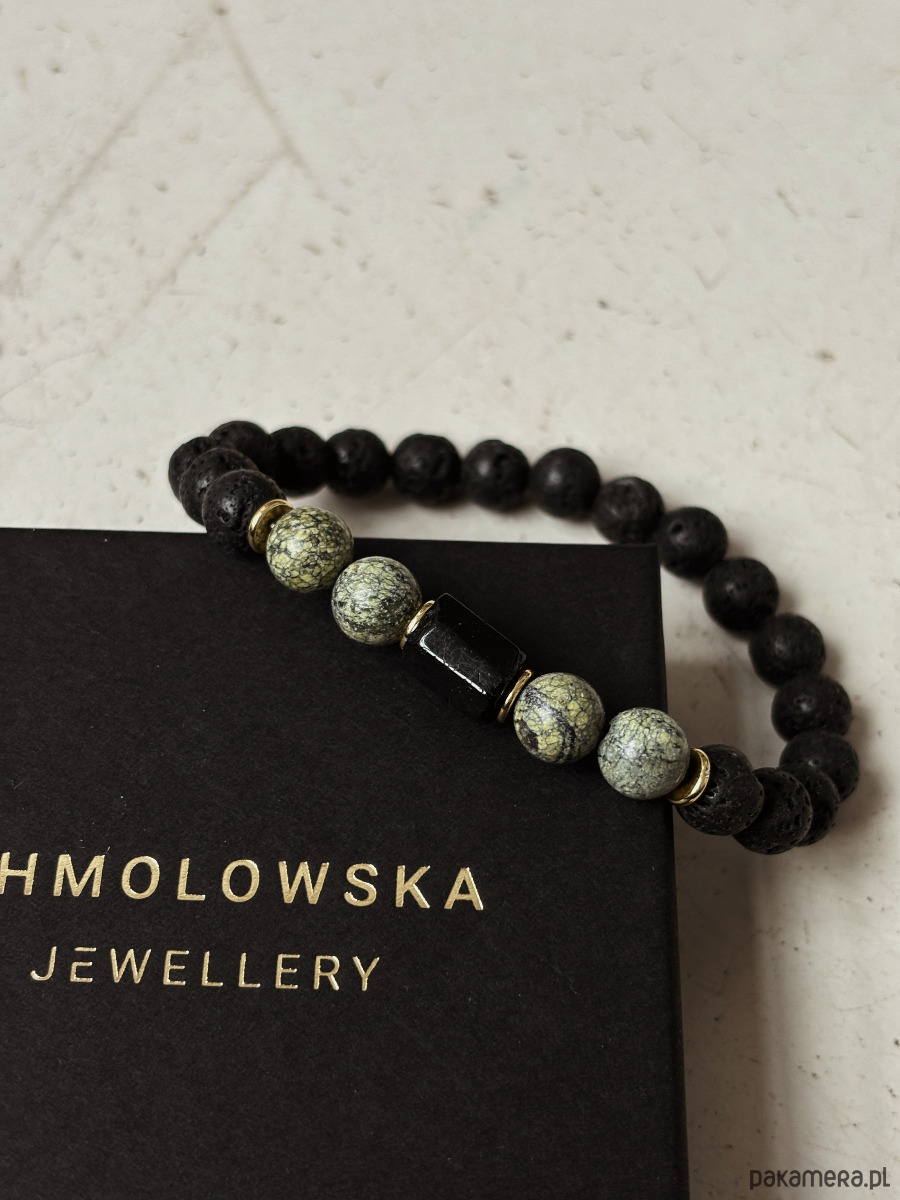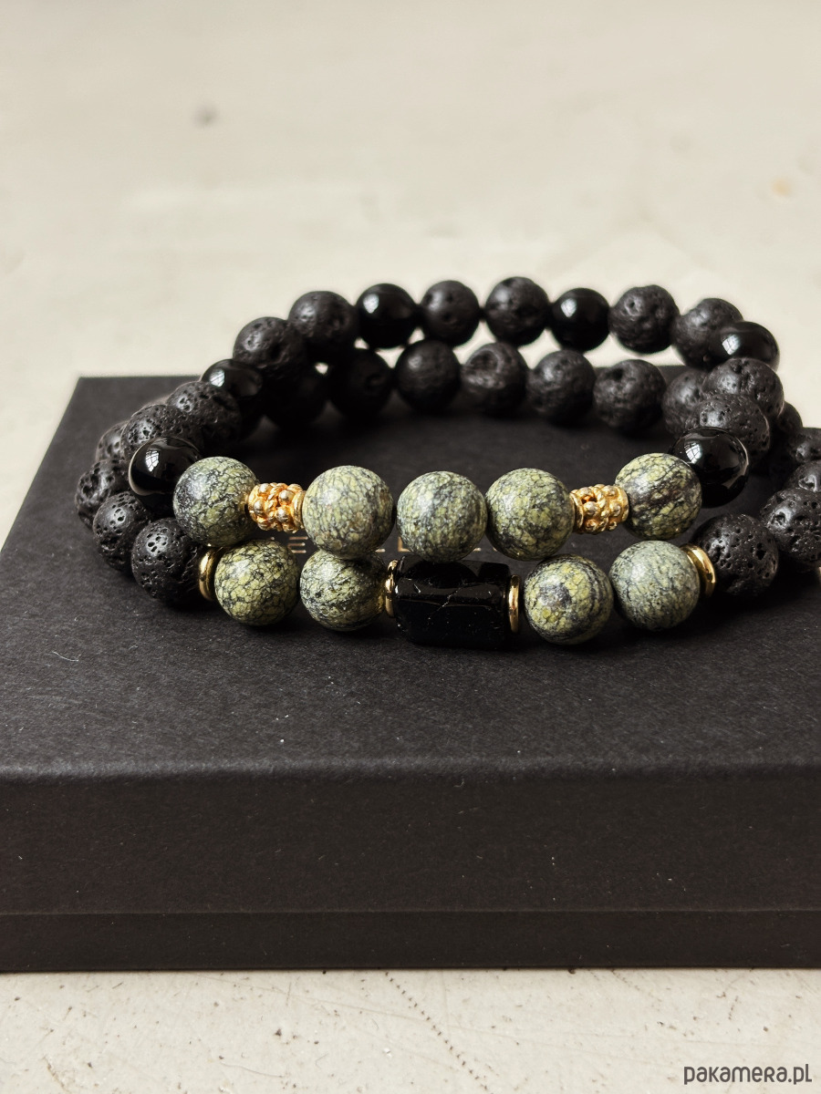 Bransoletki wykonane są na gumce jubilerskiej z kamieni Lawy Wulkanicznej, Serpentynitu, Turmalinu Czarnego i Onyksu.