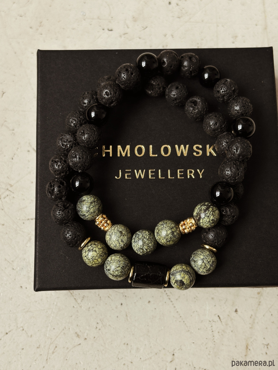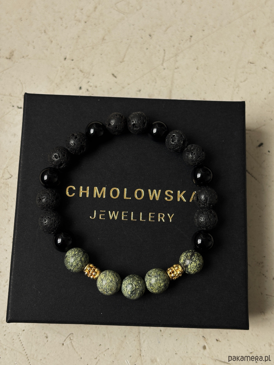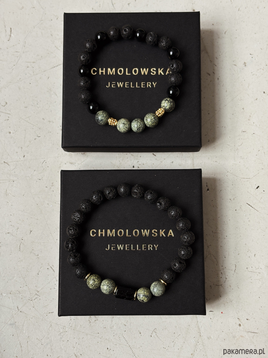 Bransoletki wykonane są na gumce jubilerskiej z kamieni Lawy Wulkanicznej, Serpentynitu, Turmalinu Czarnego i Onyksu.