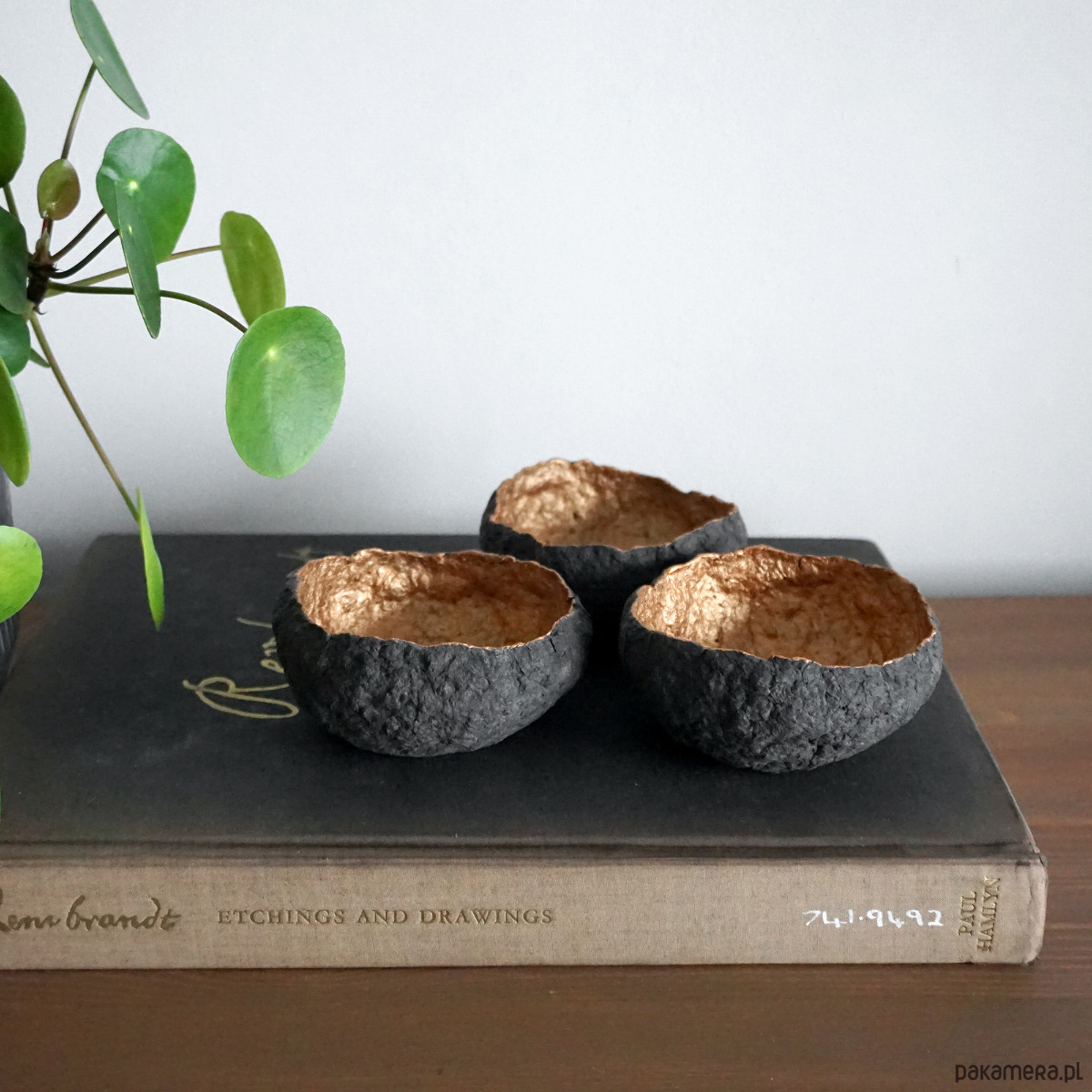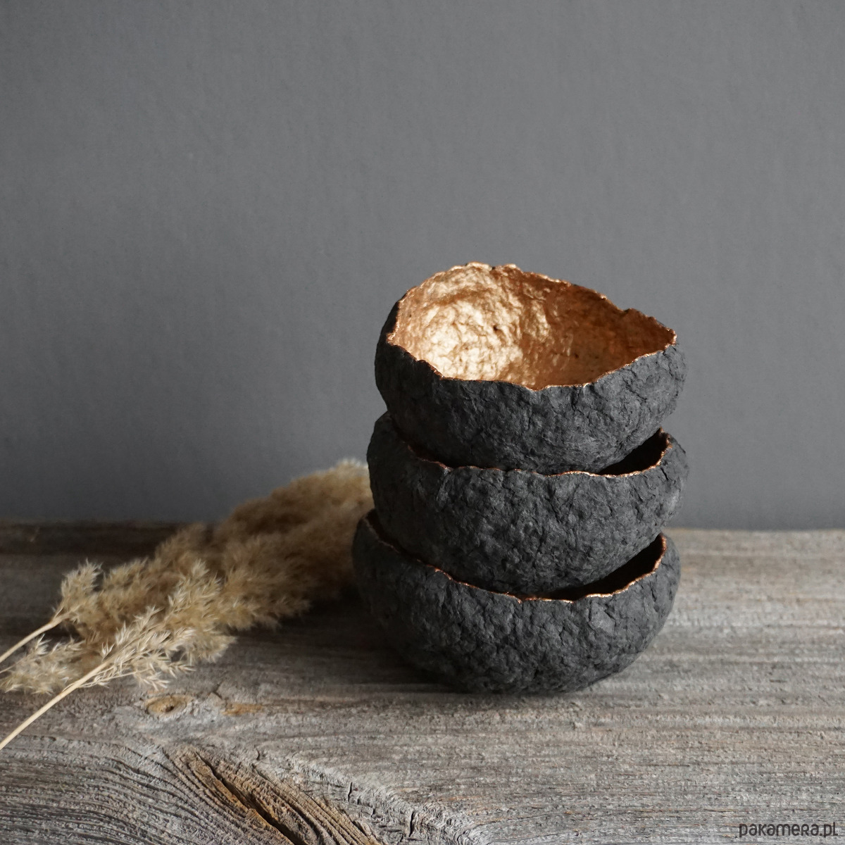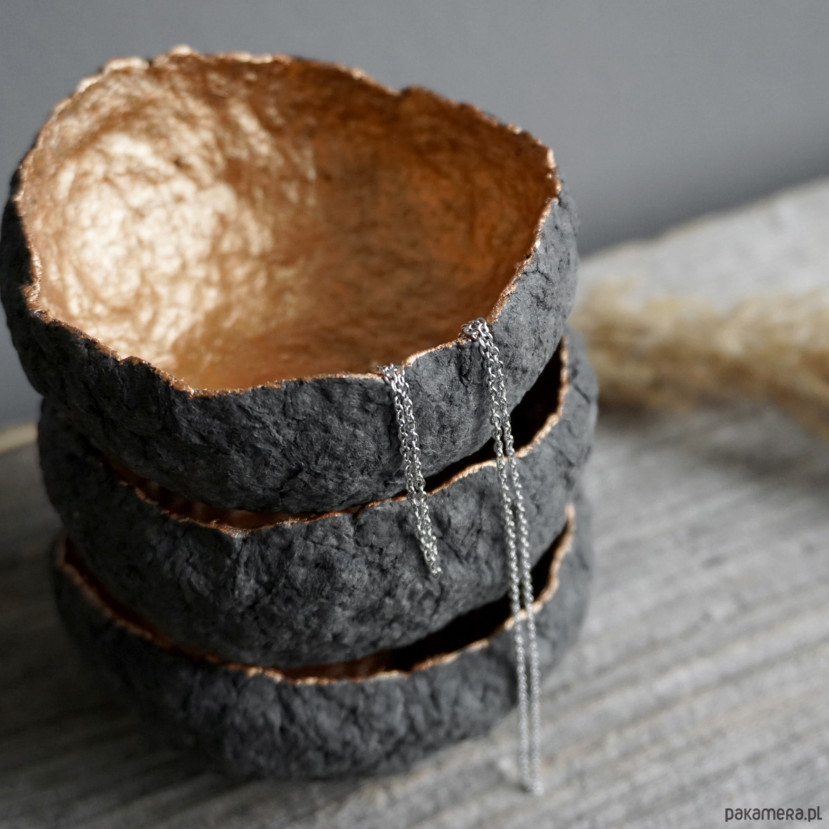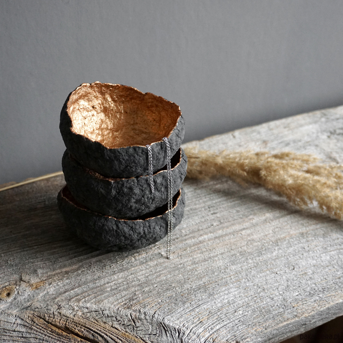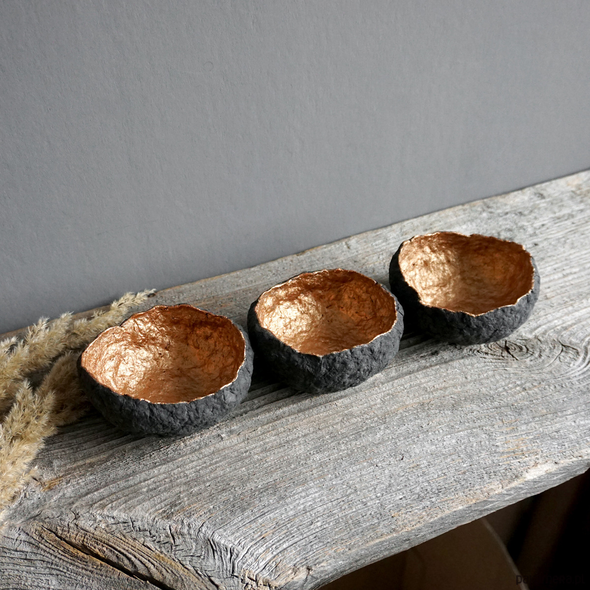 Zestaw trzech dekoracyjnych miseczek na biżuterię wykonanych ręcznie z masy papierowej (paper mache).