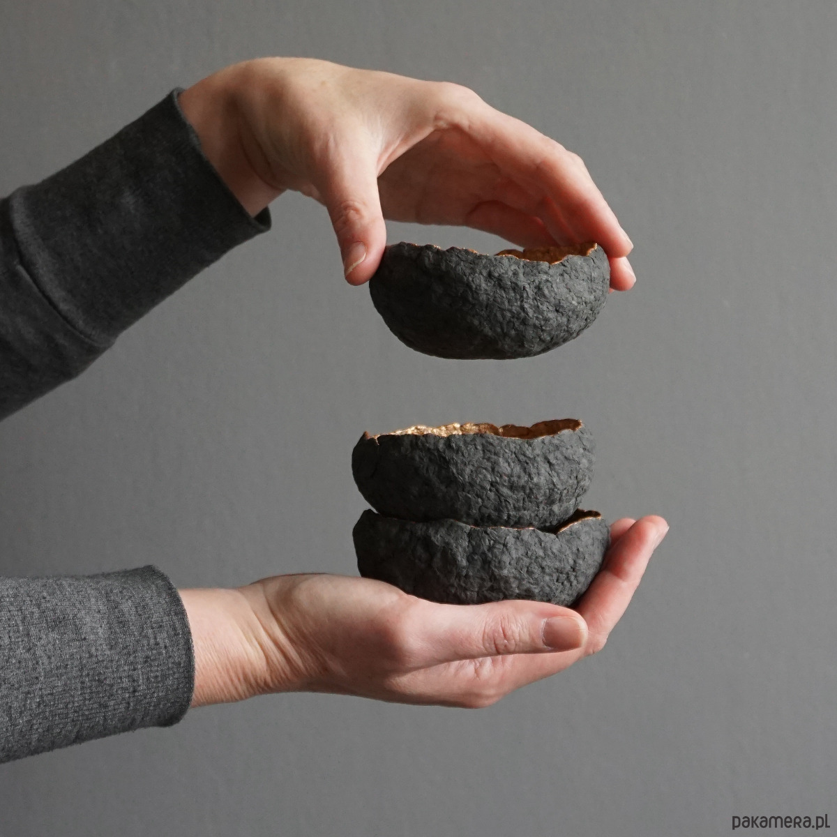Miseczki mają surową, chropowatą powierzchnię, która tworzy się naturalnie i lekko nieregularny kształt.