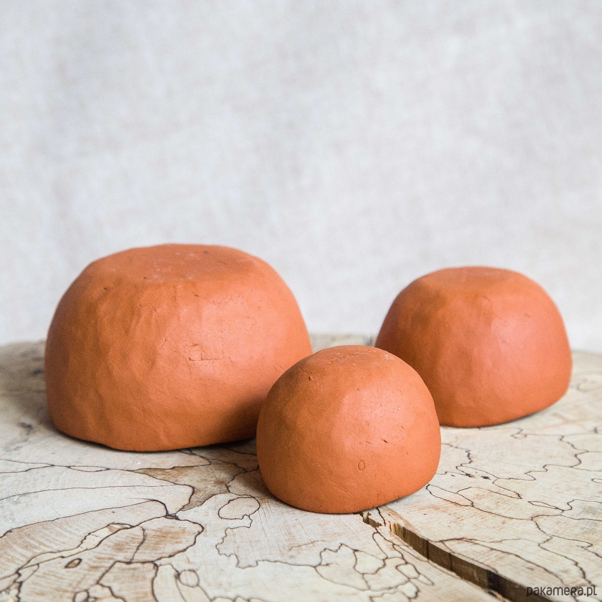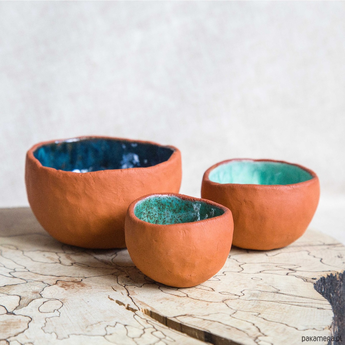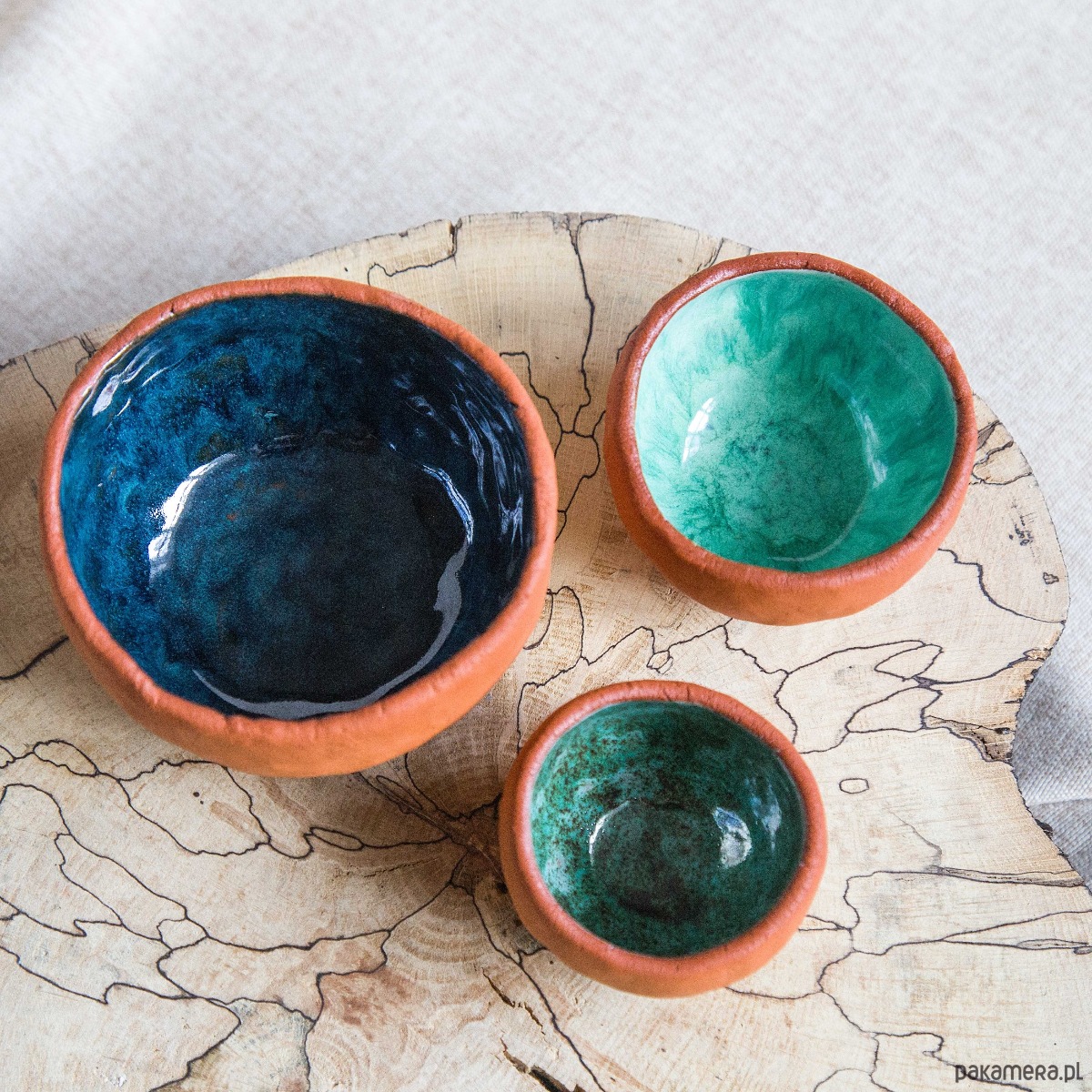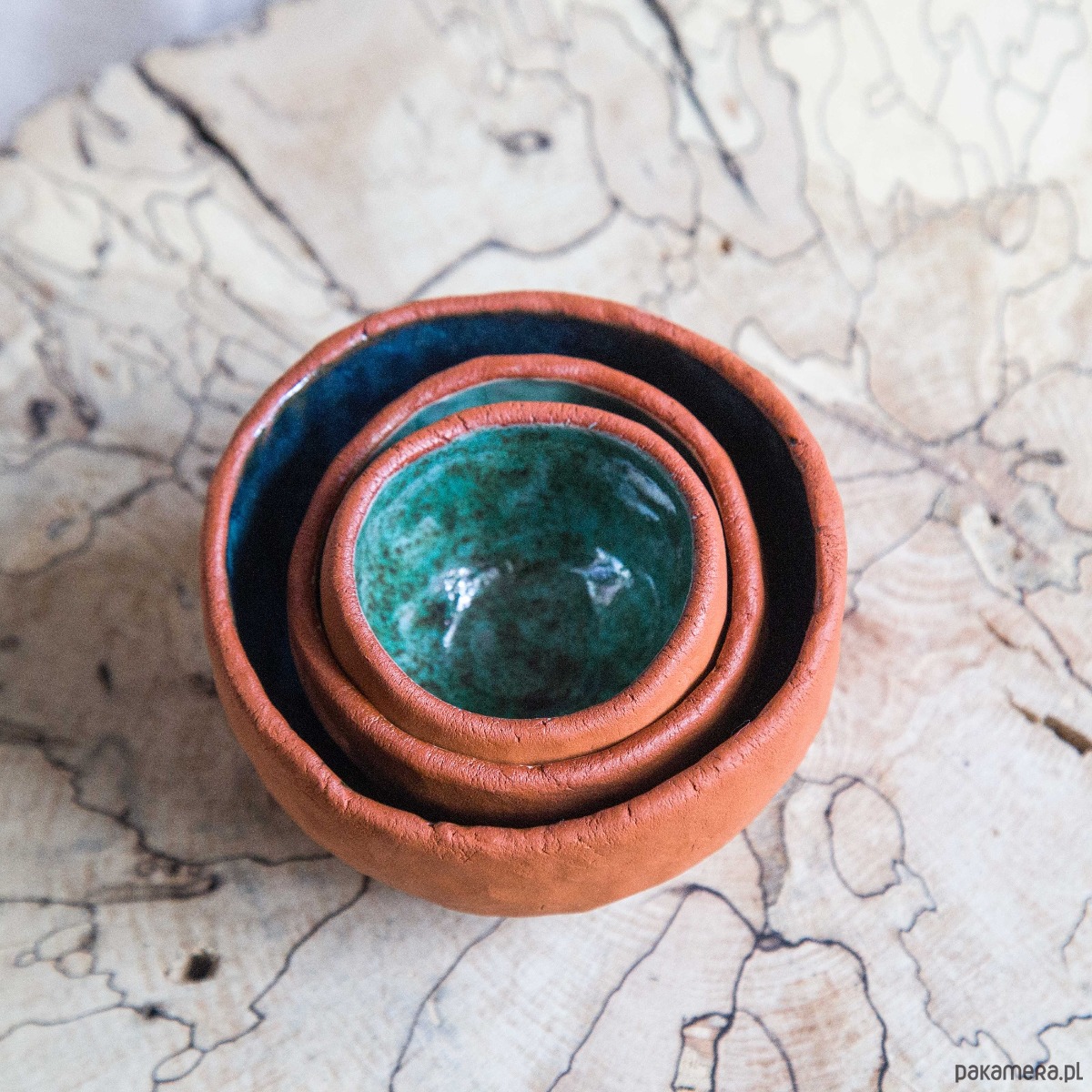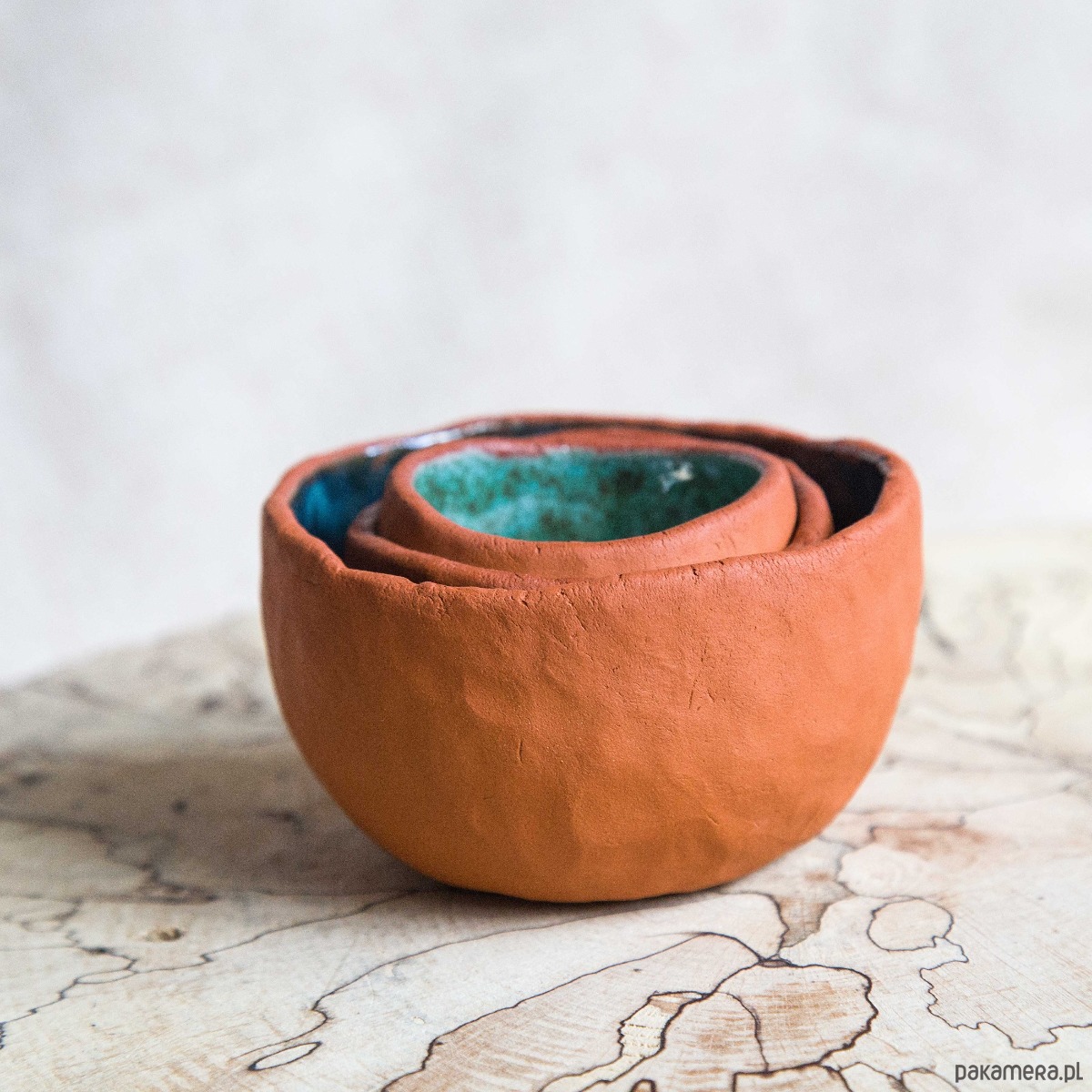 zestaw 3 miseczek ręcznie lepionych z czerwonej gliny.