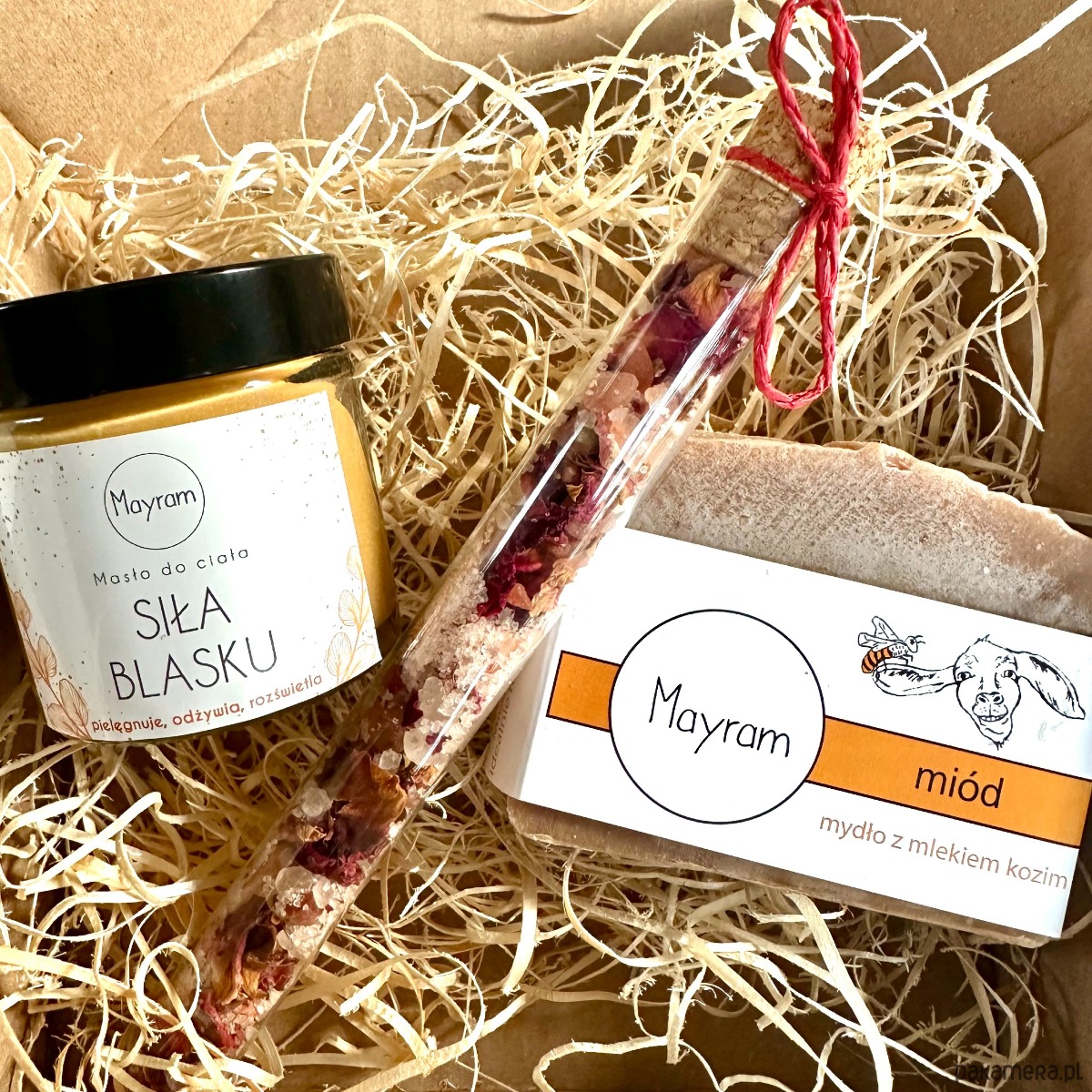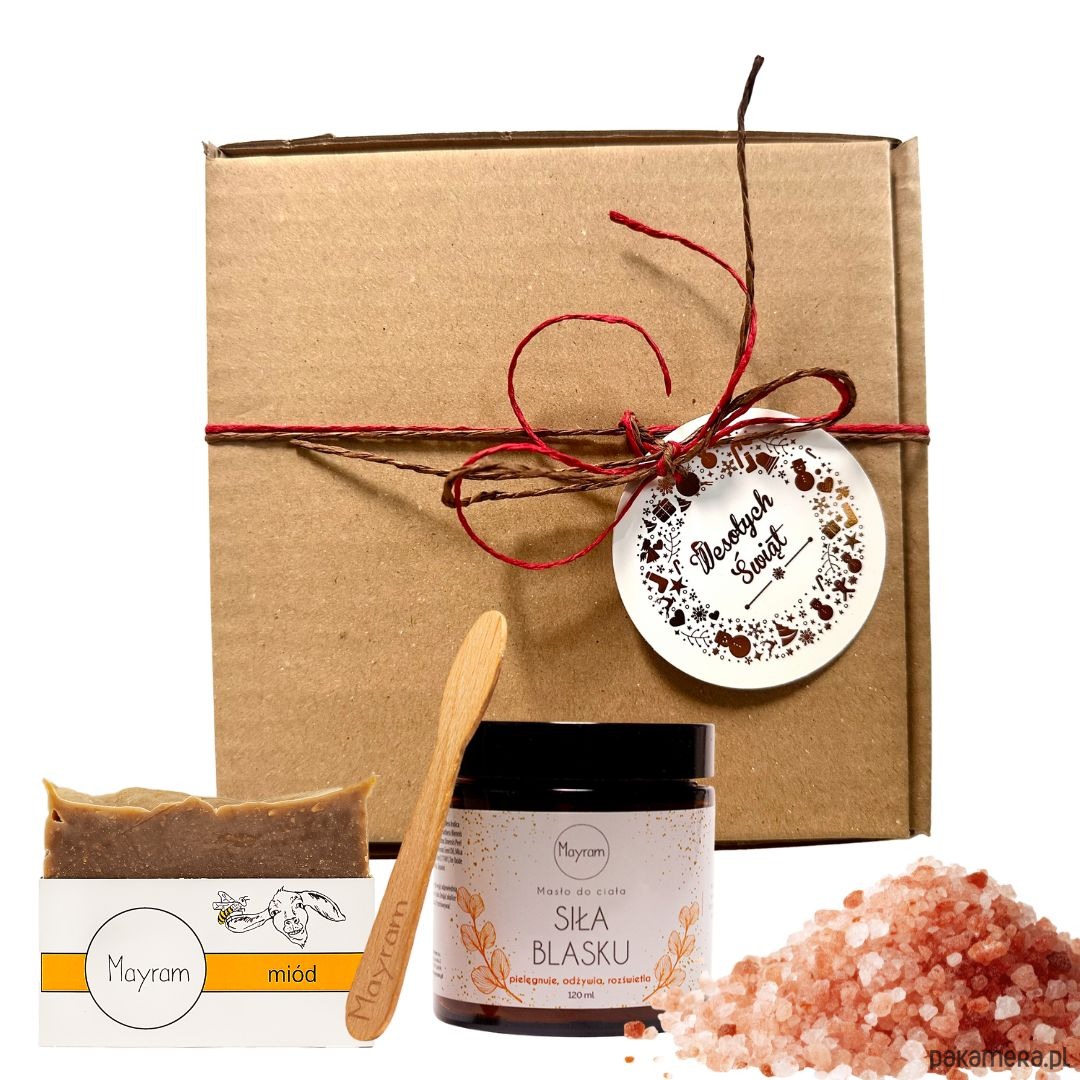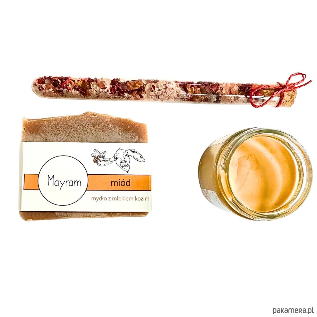 Zestaw skomponowany z myślą o prezencie dla osoby lubiącej różne zapachy bądź osoby, której preferencje zapachowe nie są nam bliżej znane. Zestaw łączy w sobie słodki zapach mydła Miód, kwiatowy zapach soli kąpielowej Na bogato oraz cytrusowy zapach masła do ciała Siła blasku.