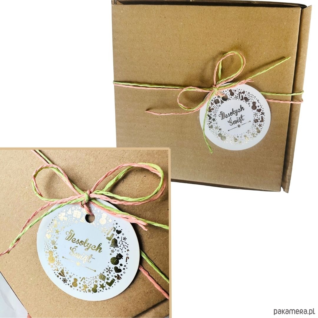 Zestaw zapakowany w tekturowe pudełko przewiązane kolorowymi sznureczkami z białą przywieszką ze złotym napisem: Wesołych świąt, która nadaje opakowaniu elegancji.