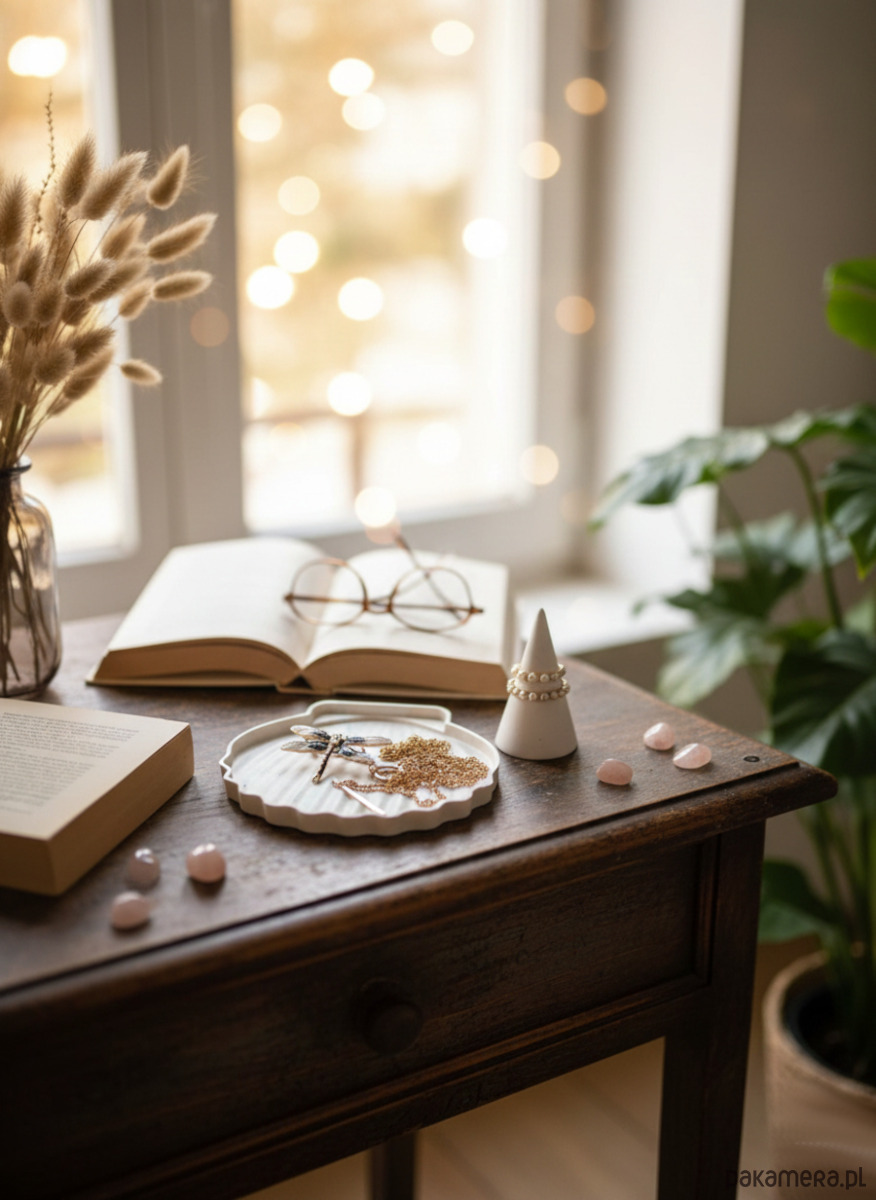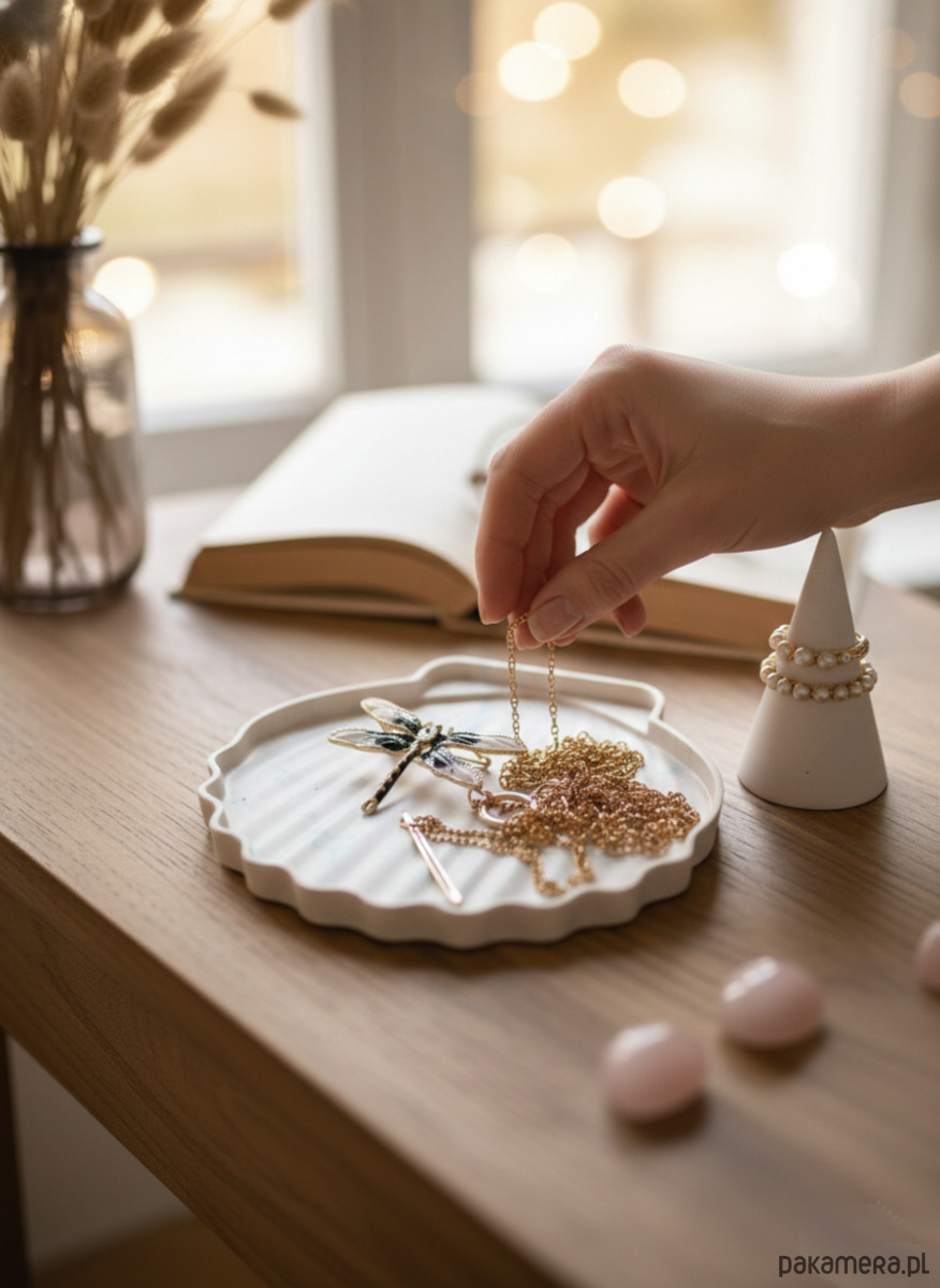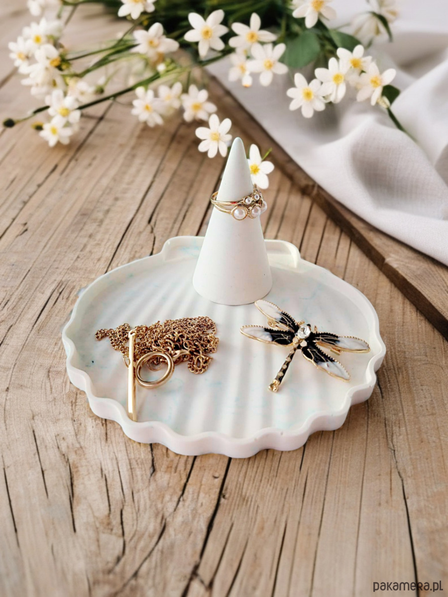 Nasz wyjątkowy zestaw na biżuterię to doskonały prezent dla kobiet w każdym wieku. Składa się z eleganckiej muszli i praktycznego stożka, wykonanych z wysokiej jakości gipsu polimerowego. Odcienie ecru z delikatnym błękitem dodają nuty subtelności i klasy. Idealne miejsce na przechowywanie pierścionków, biżuterii, które chcesz zachować w stylowym otoczeniu. Podaruj wyjątkowy prezent z naszym zestawem na biżuterię – symbol elegancji i funkcjonalności.