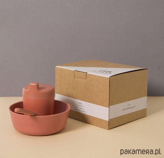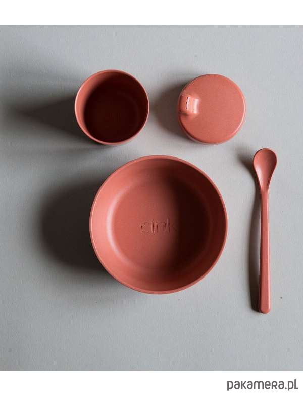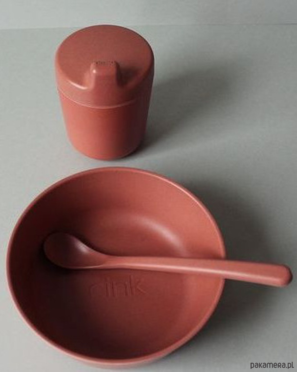 Zestaw bambusowych naczyń w kolorze CEGŁA: miska, kubek ze zdejmowaną nakładką niekapkiem oraz łyżeczką. Całość zapakowana w estetyczne pudełko, może być idealnym prezentem.