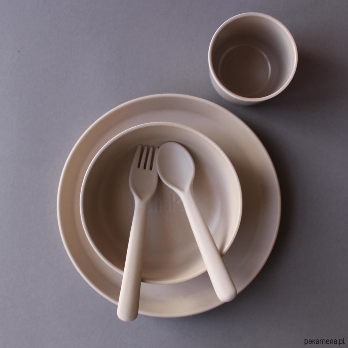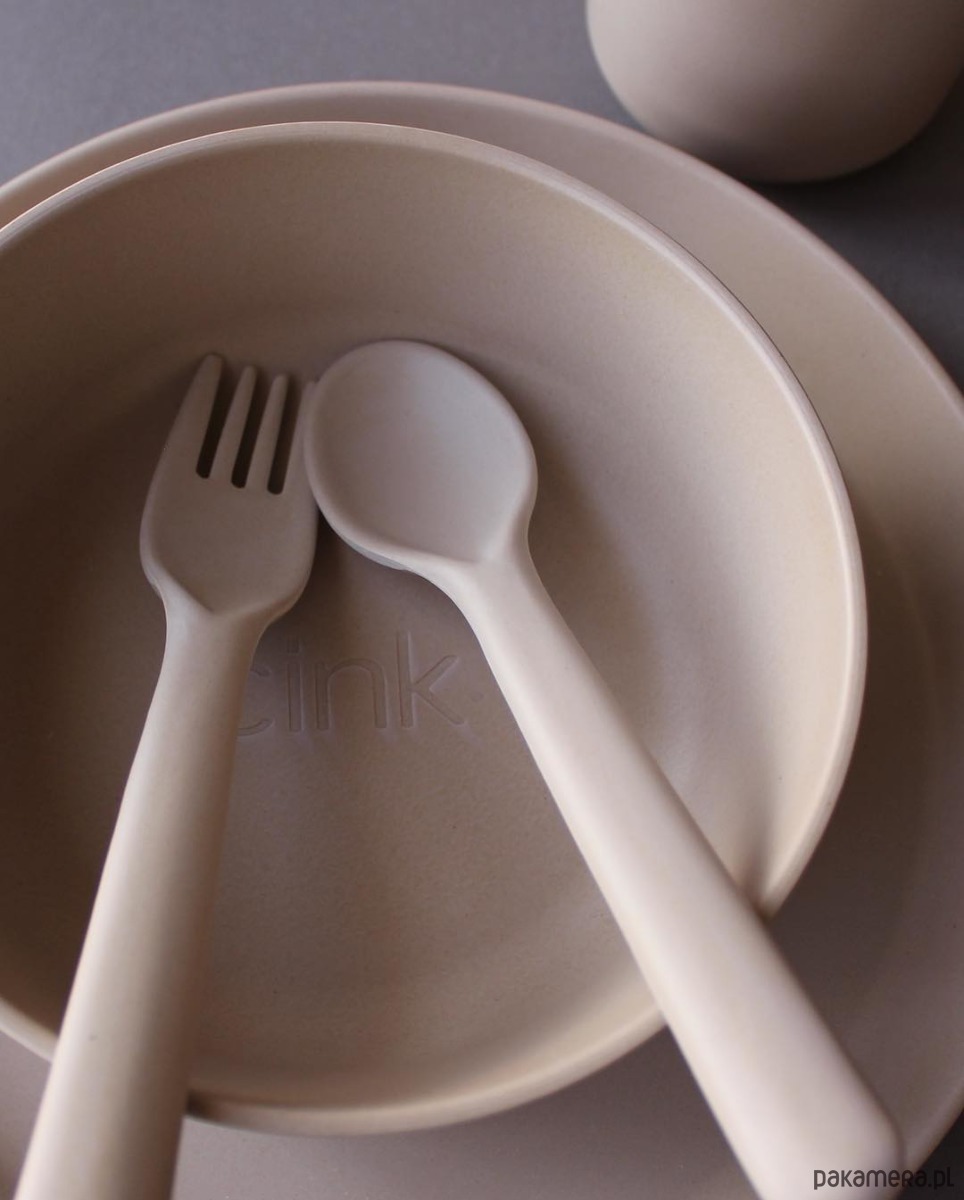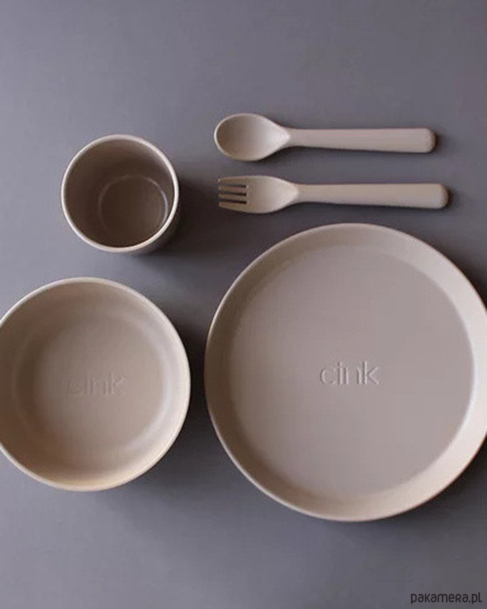 Zestaw bambusowych naczyń marki Cink dla starszego dziecka (od lat 3) w kolorze: MGŁA. W zestawie jest talerz, miseczka, kubek, łyżeczka i widelec. W zestawie dla starszaków nie ma pokrywki do kubka ale jeśli jest potrzebna można ją dokupić w naszym sklepie.