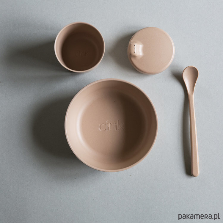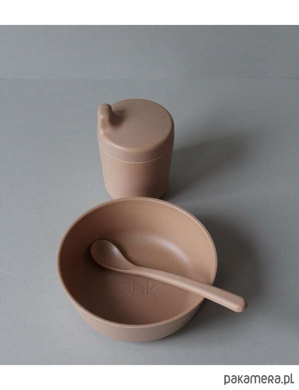 Zestaw bambusowych naczyń w kolorze ZBOŻE: miska, kubek ze zdejmowaną nakładką niekapkiem oraz łyżeczką. Całość zapakowana w estetyczne pudełko, może być idealnym prezentem.