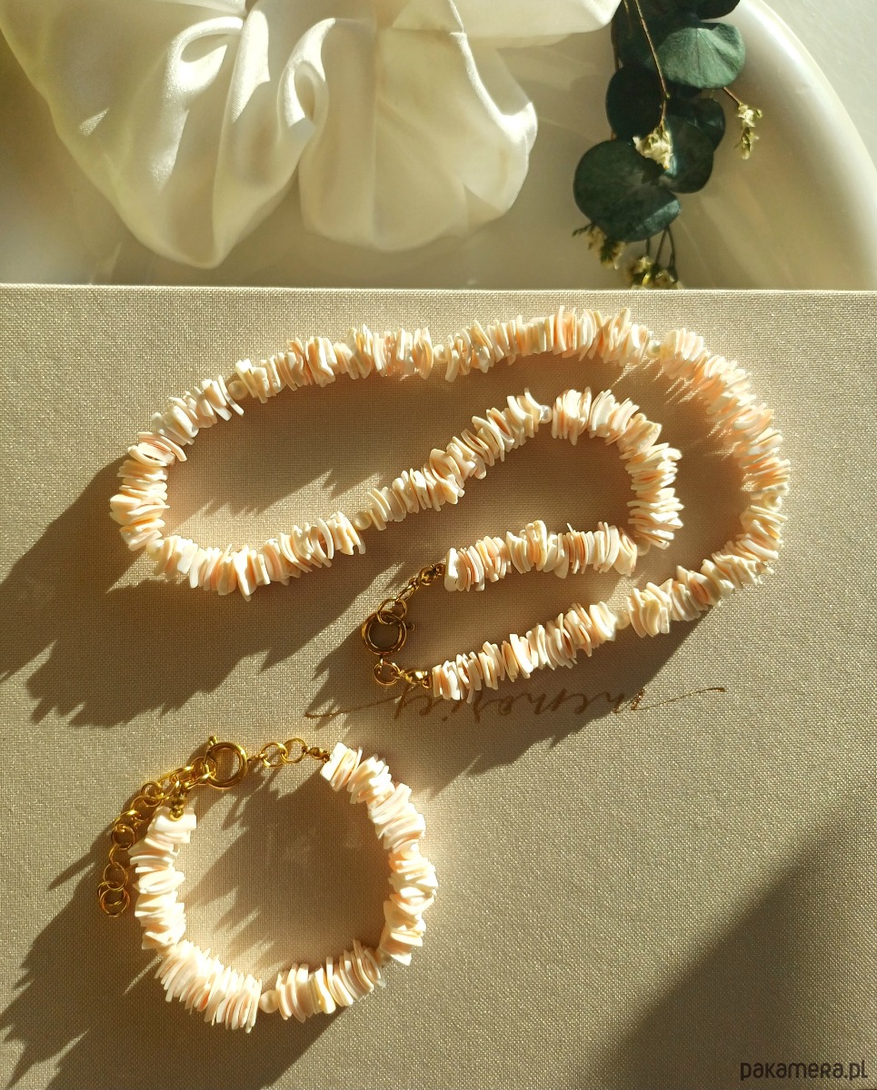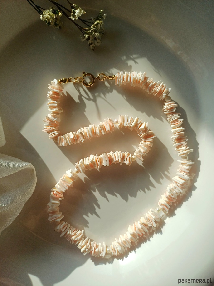Zestaw naszyjnik i bransoletka, muszla, perła naturalna
