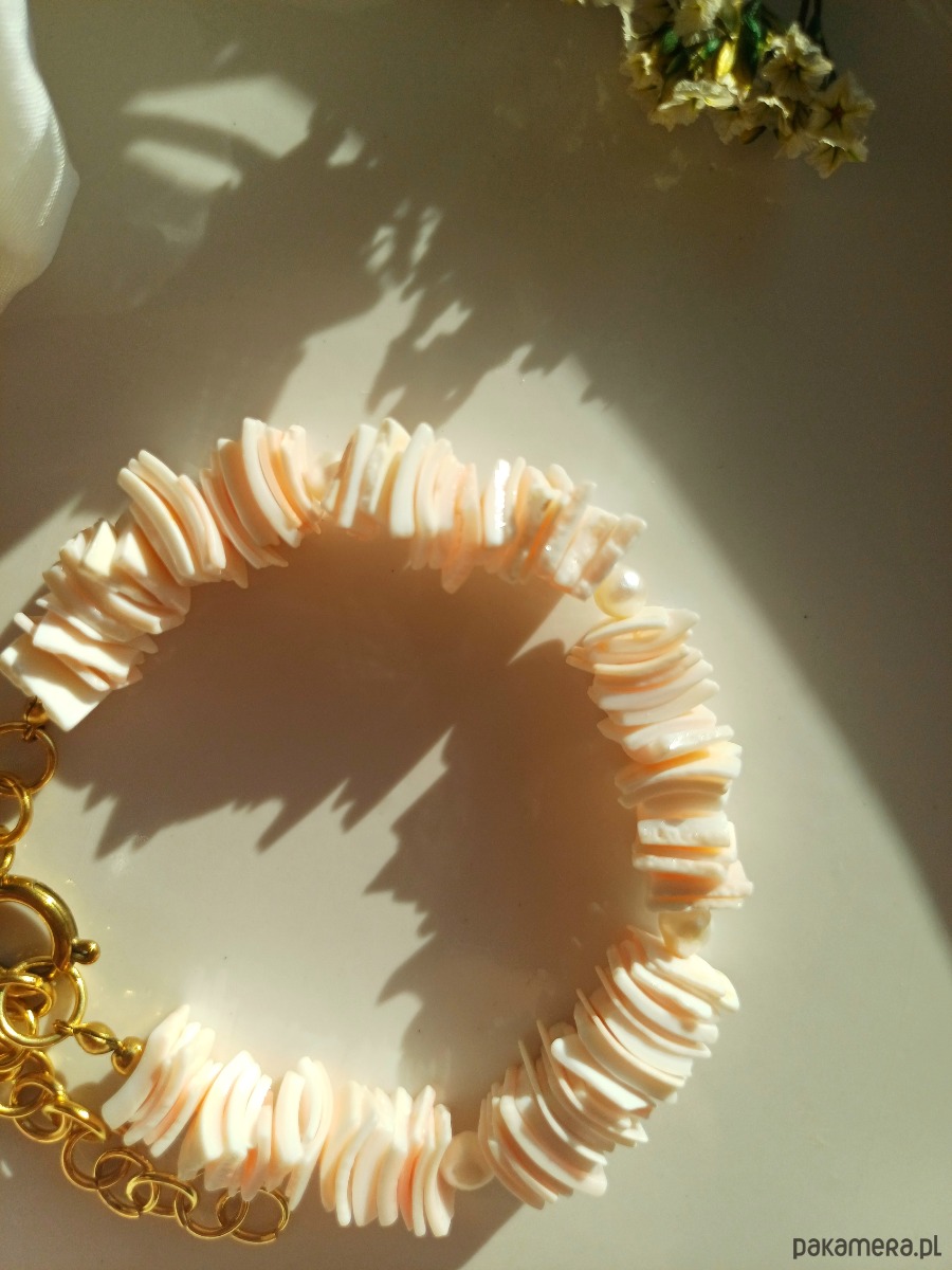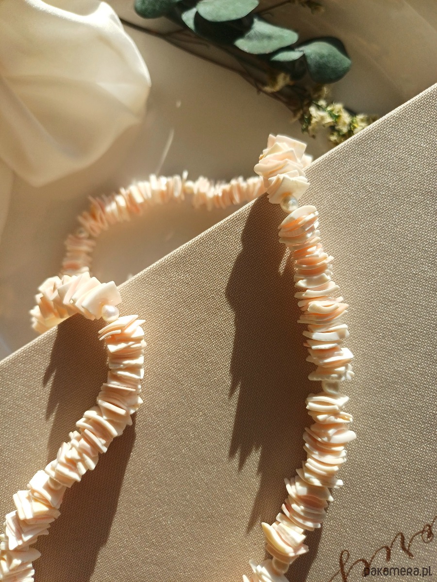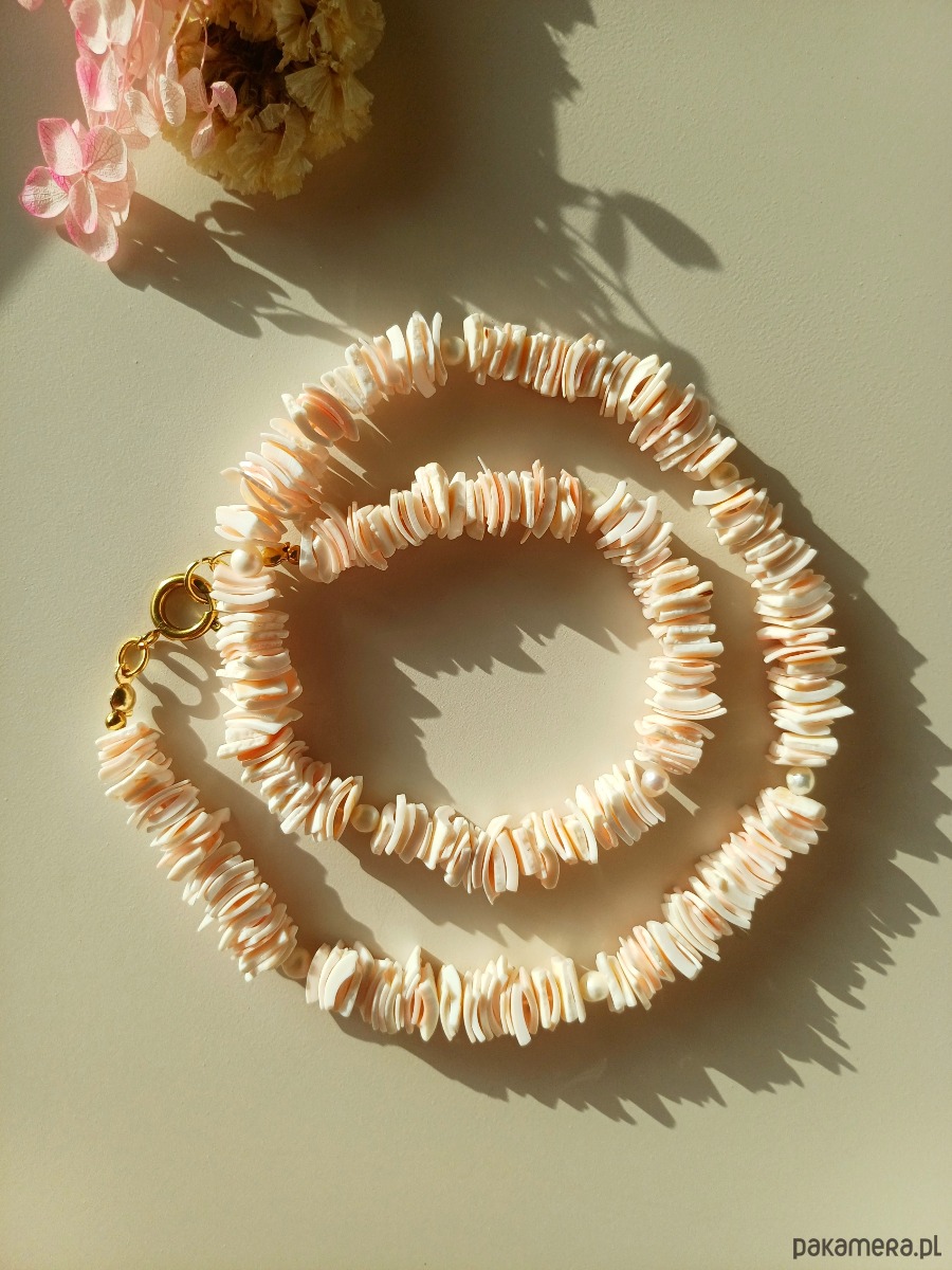 Elementy naszyjnika / bransoletki : koraliki z muszli : 9 mm , perły naturalne słodkowodne : 4 mm, , wygodne zapięcie typu federing : stal szlachetna .