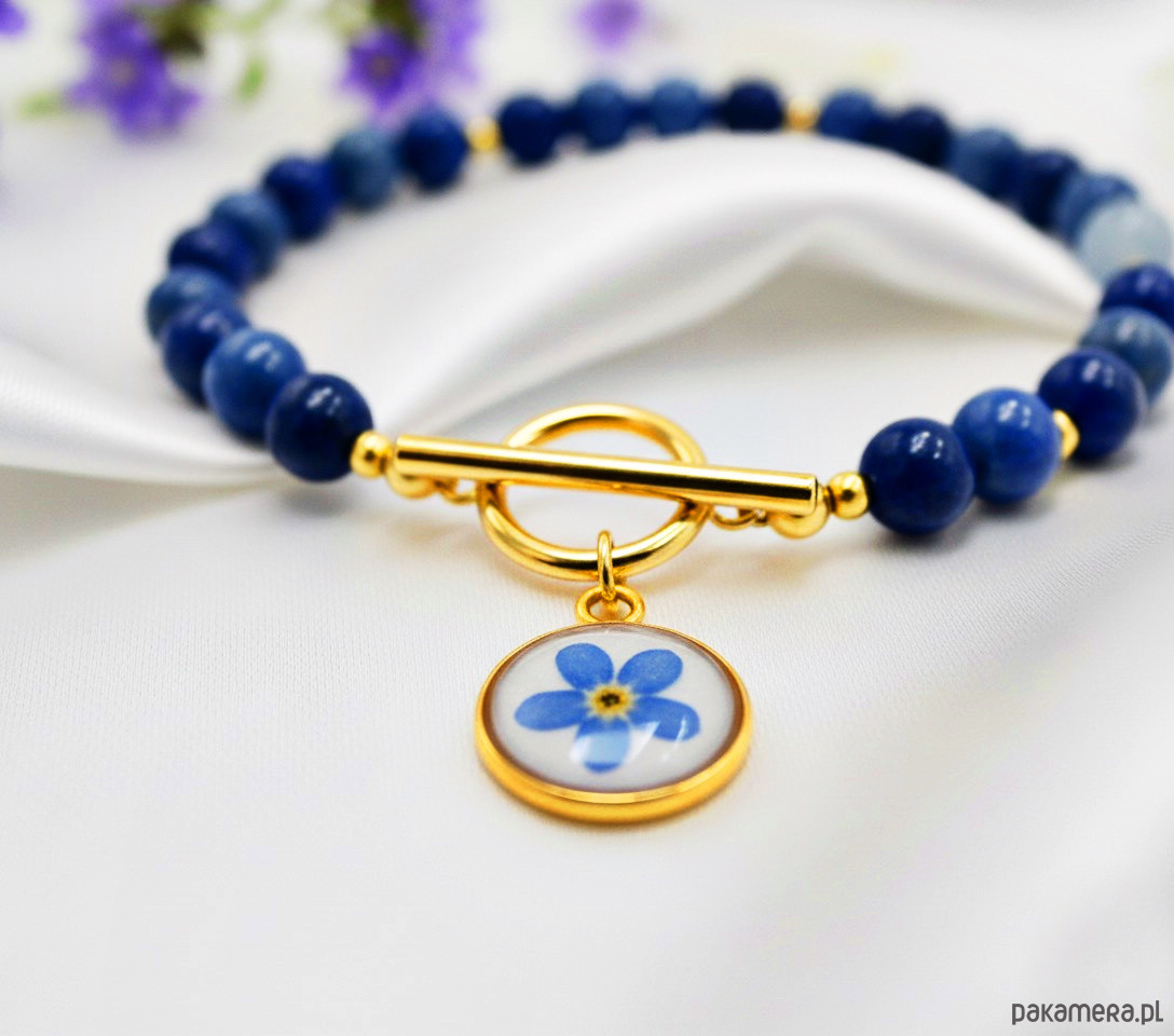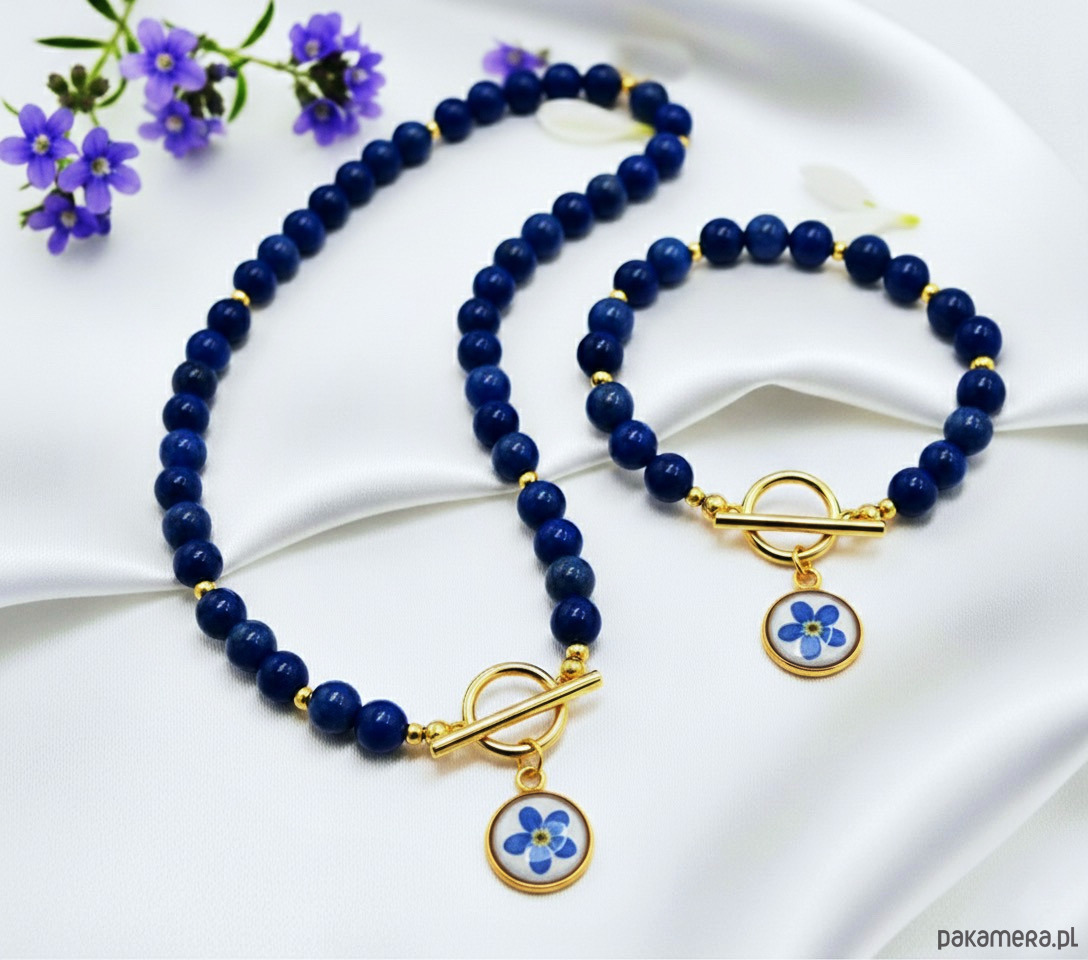 Piękna bransoletka i naszyjnik z niezapominajką i lapis lazuli.