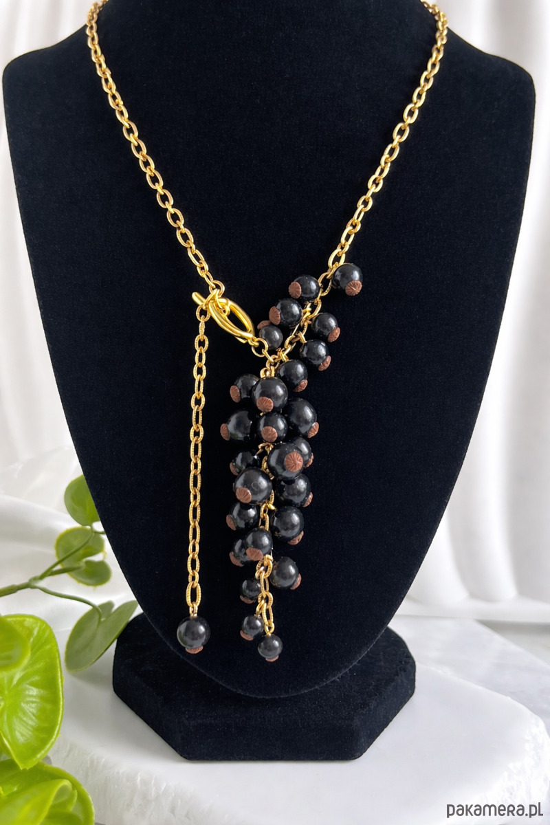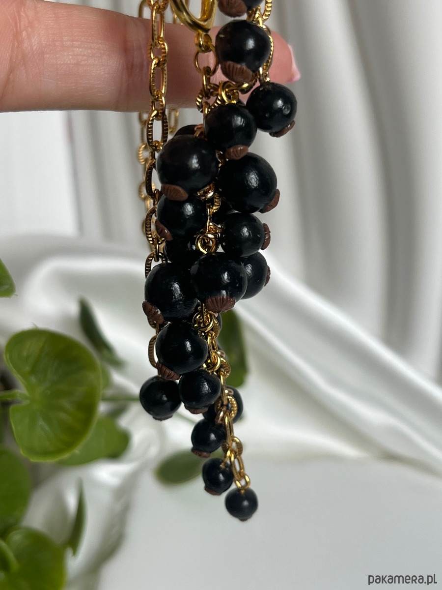 • Kolczyki grona: Bogate kiście czarnej porzeczki zawieszone na eleganckich, złotych biglach. Idealnie dopełniają stylizację, dodając jej blasku i charakteru.