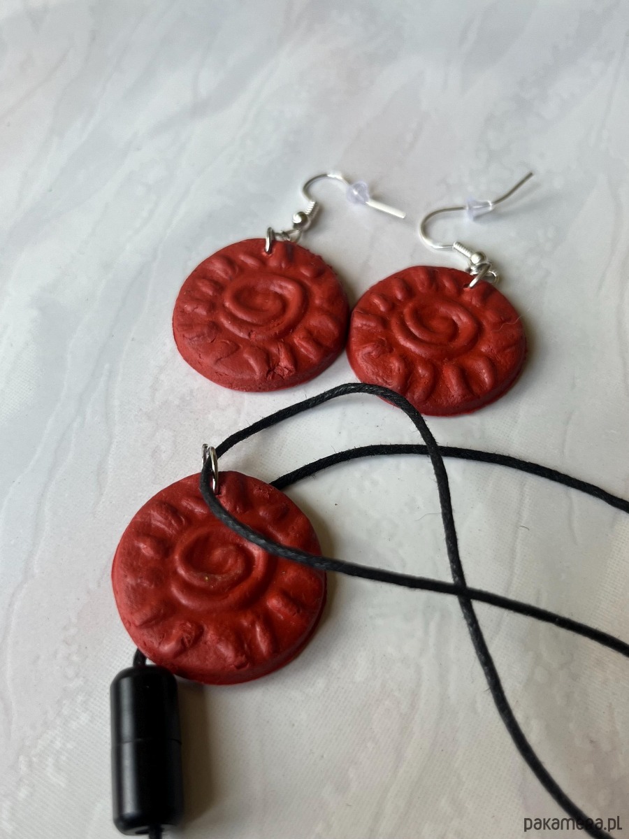 biżuteria ręcznie robiona, kolczyki, wisiorek, zestaw biżuterii, czerwony kolor, wzór spirali, unikatowa biżuteria