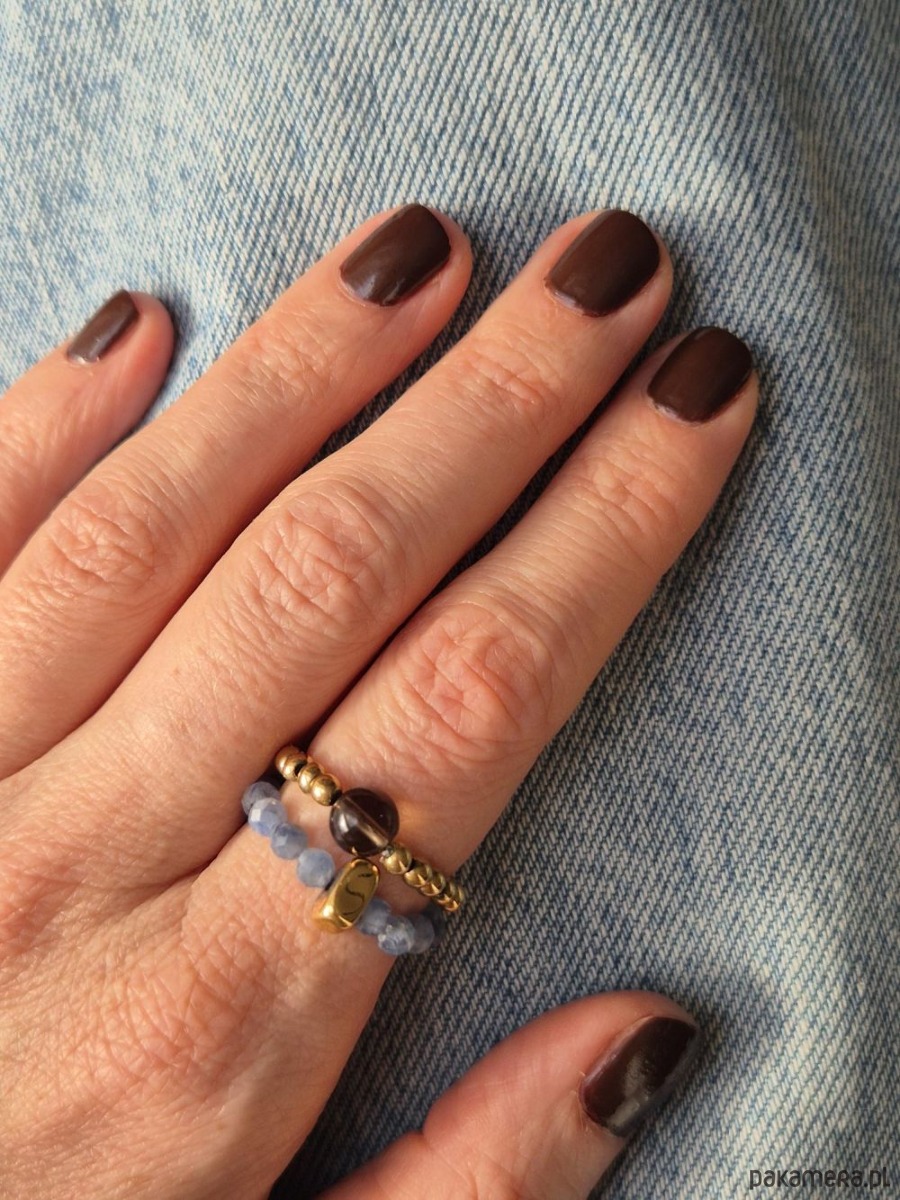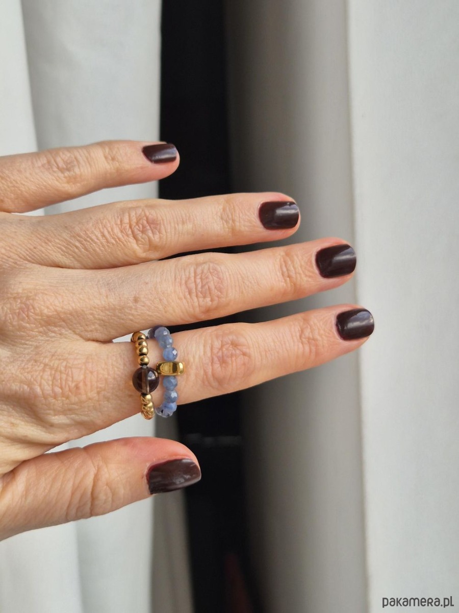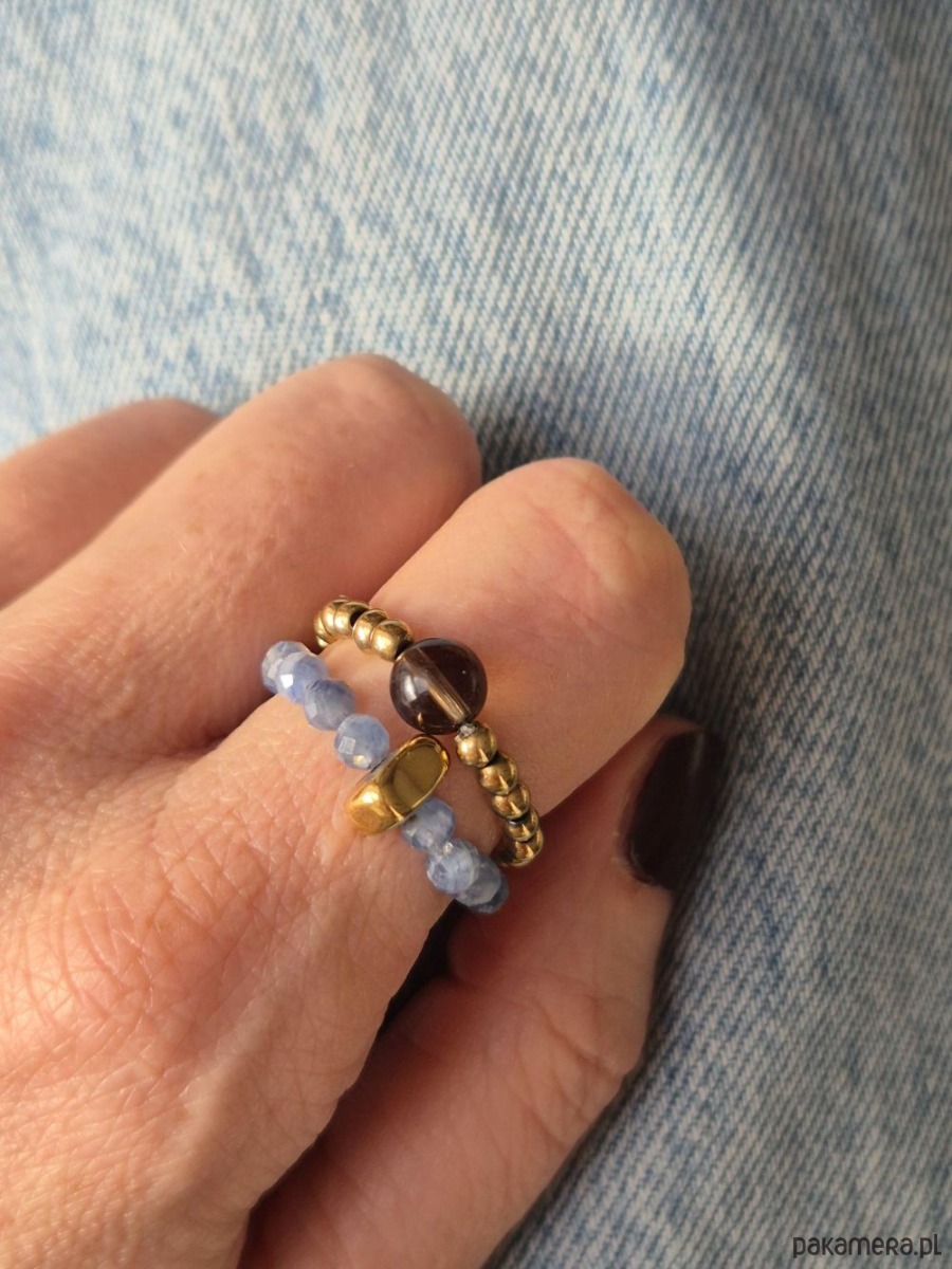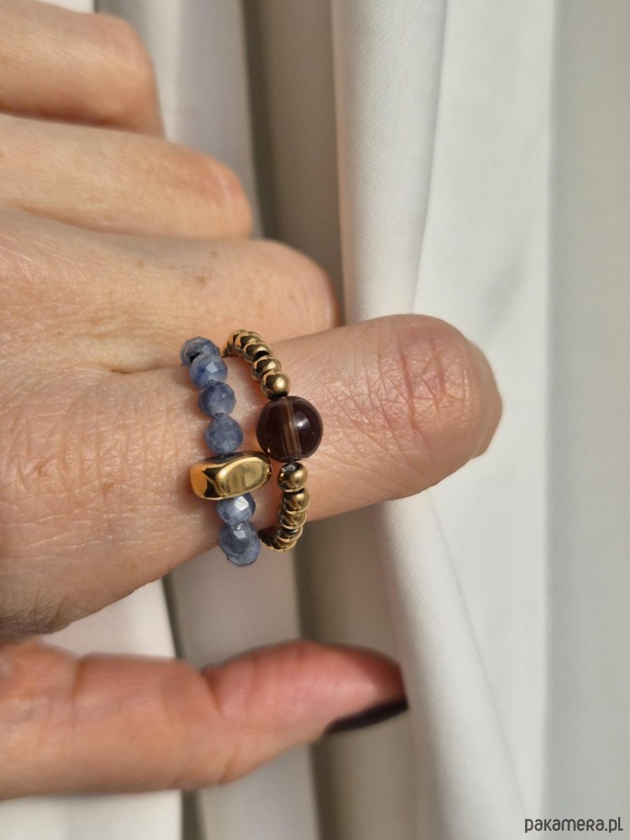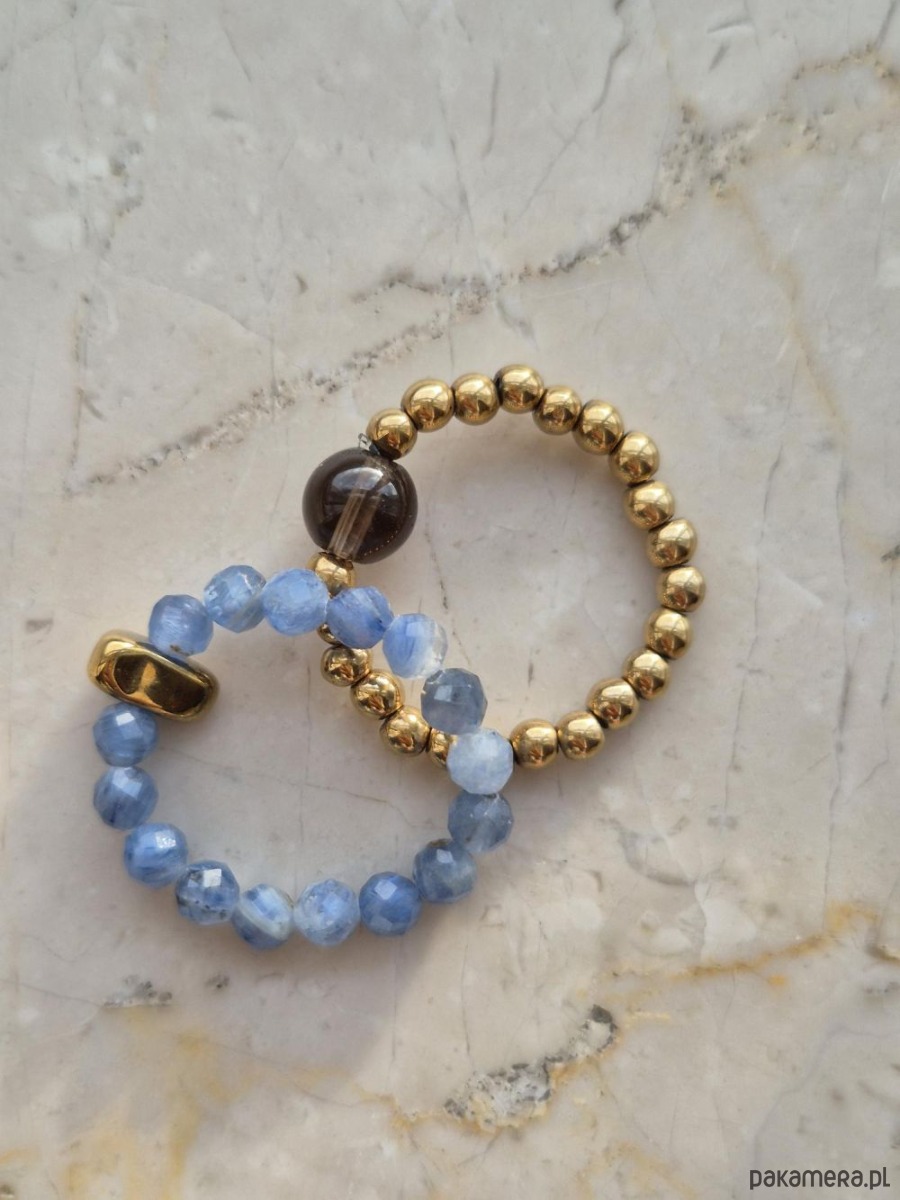 Delikatny zestaw pierścionków w odcieniach nieba i złota. Ręcznie wykonany komplet łączy chłodny blask szafirów z eleganckim połyskiem złotych hematytów, a całość dopełnia drobna ozdoba z kwarcu dymnego, dodająca kompozycji subtelnej głębi.