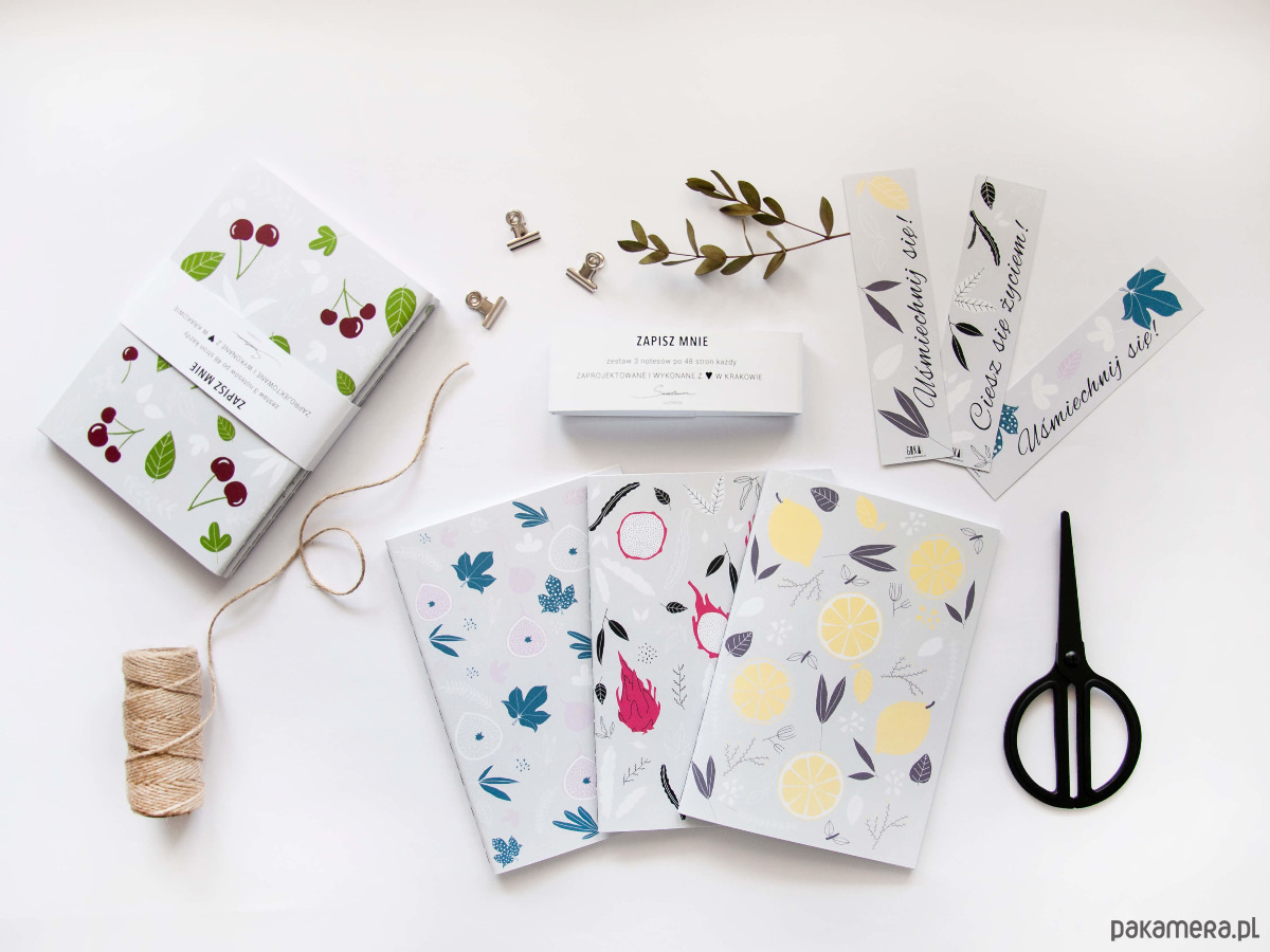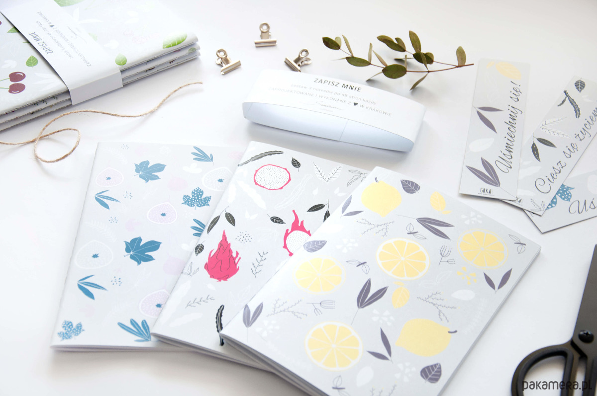 Ręcznie wykonany designerski zestaw zeszytów/notesów w formacie A5 z autorskim motywem owocowym.