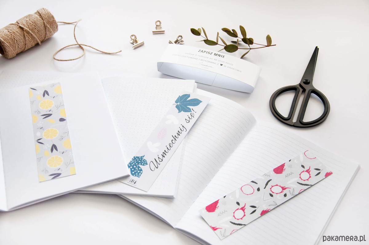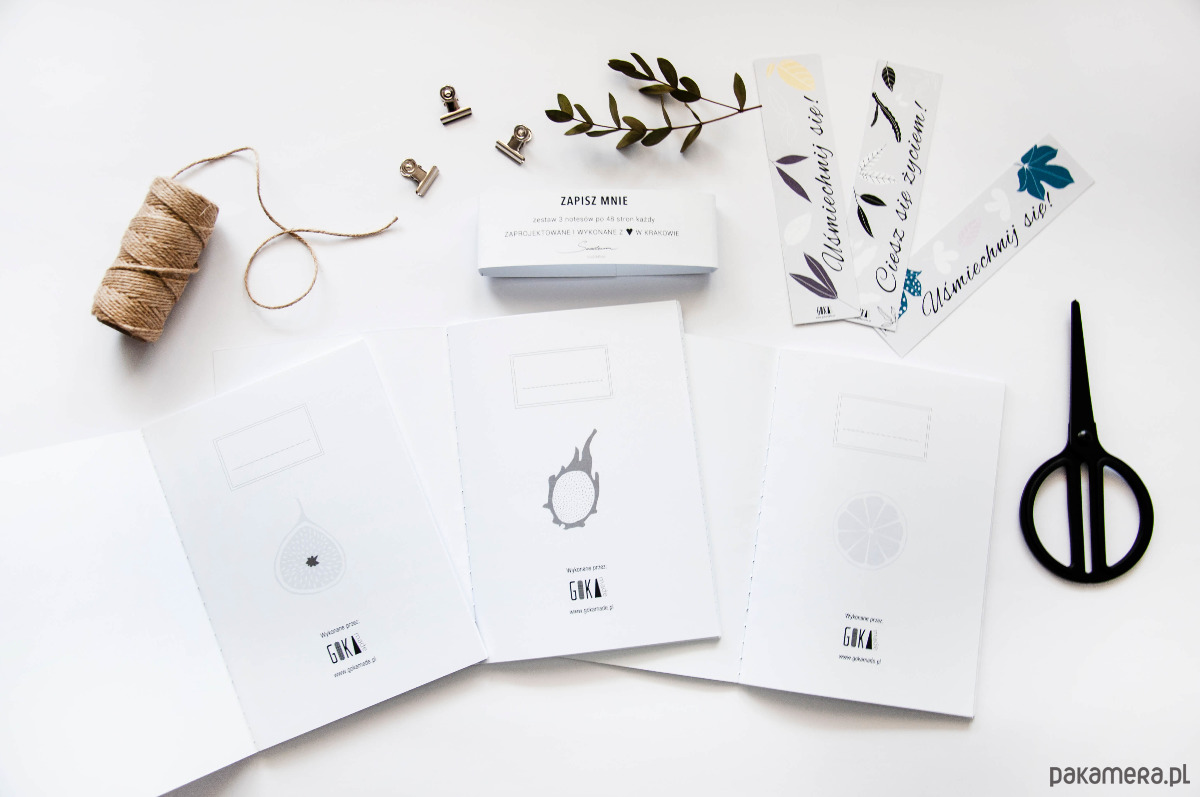 Zestaw obejmuje 3 zeszyty ręcznie szyte na grzbiecie wraz z 3 zakładkami.