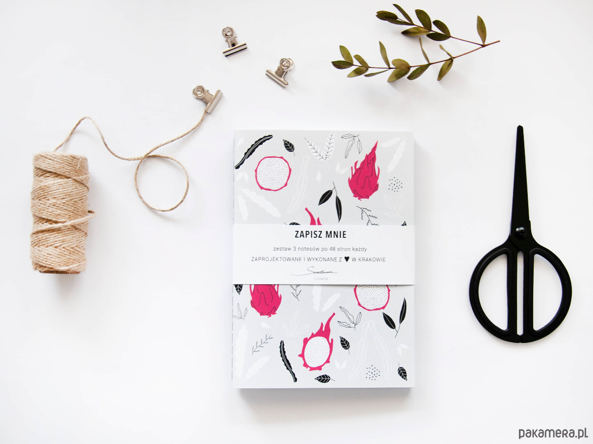Kupujesz zestaw owocowych notatników, w którego skład wchodzą: cytryna, pitaja, figa