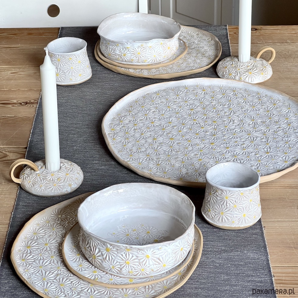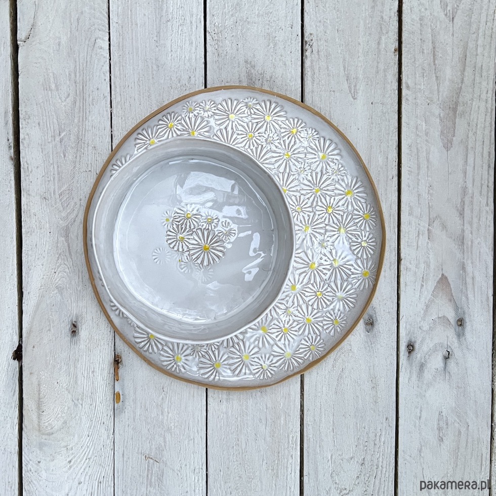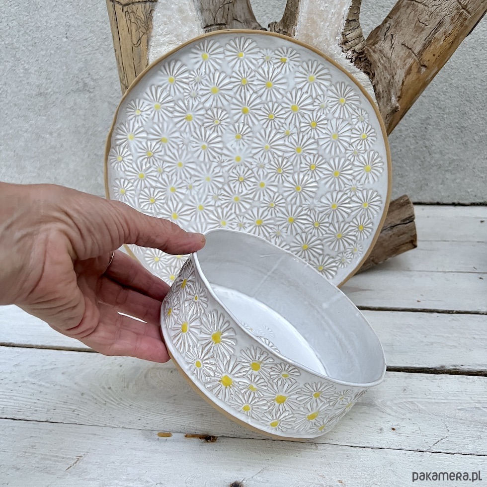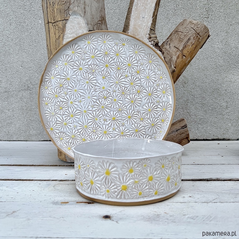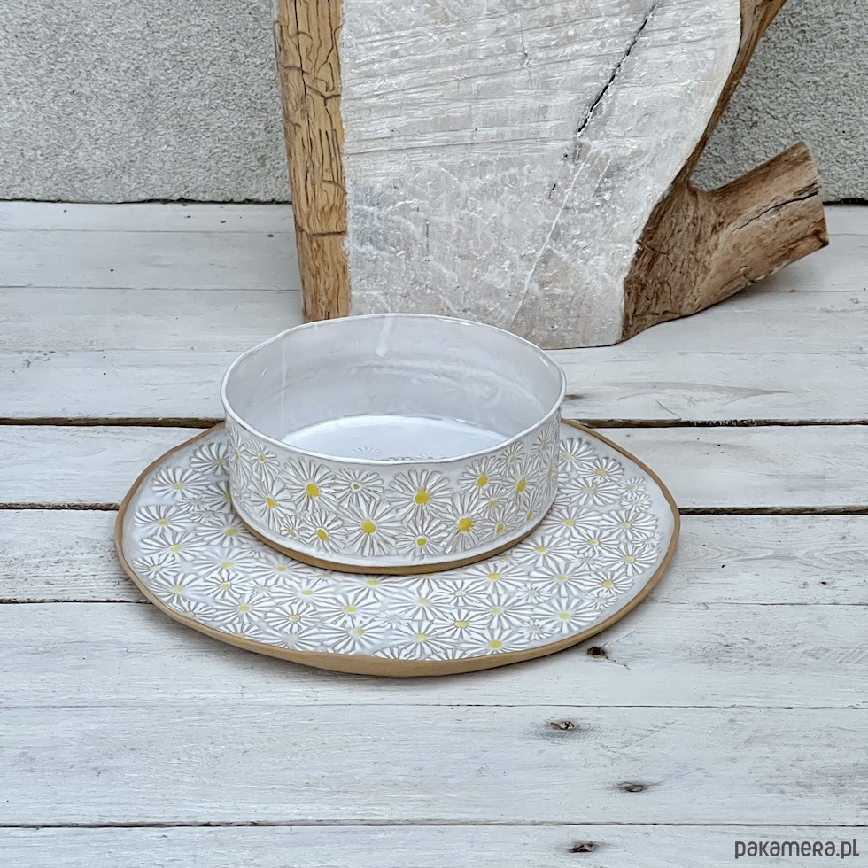 Ręcznie wykonany, ceramiczny zestaw obiadowy z wytłoczonym motywem stokrotek. Zastaw nadaje się do serwowania gorących i zimnych dań. Talerz ma średnicę około 23 cm, a miska pojemność około 400 ml.