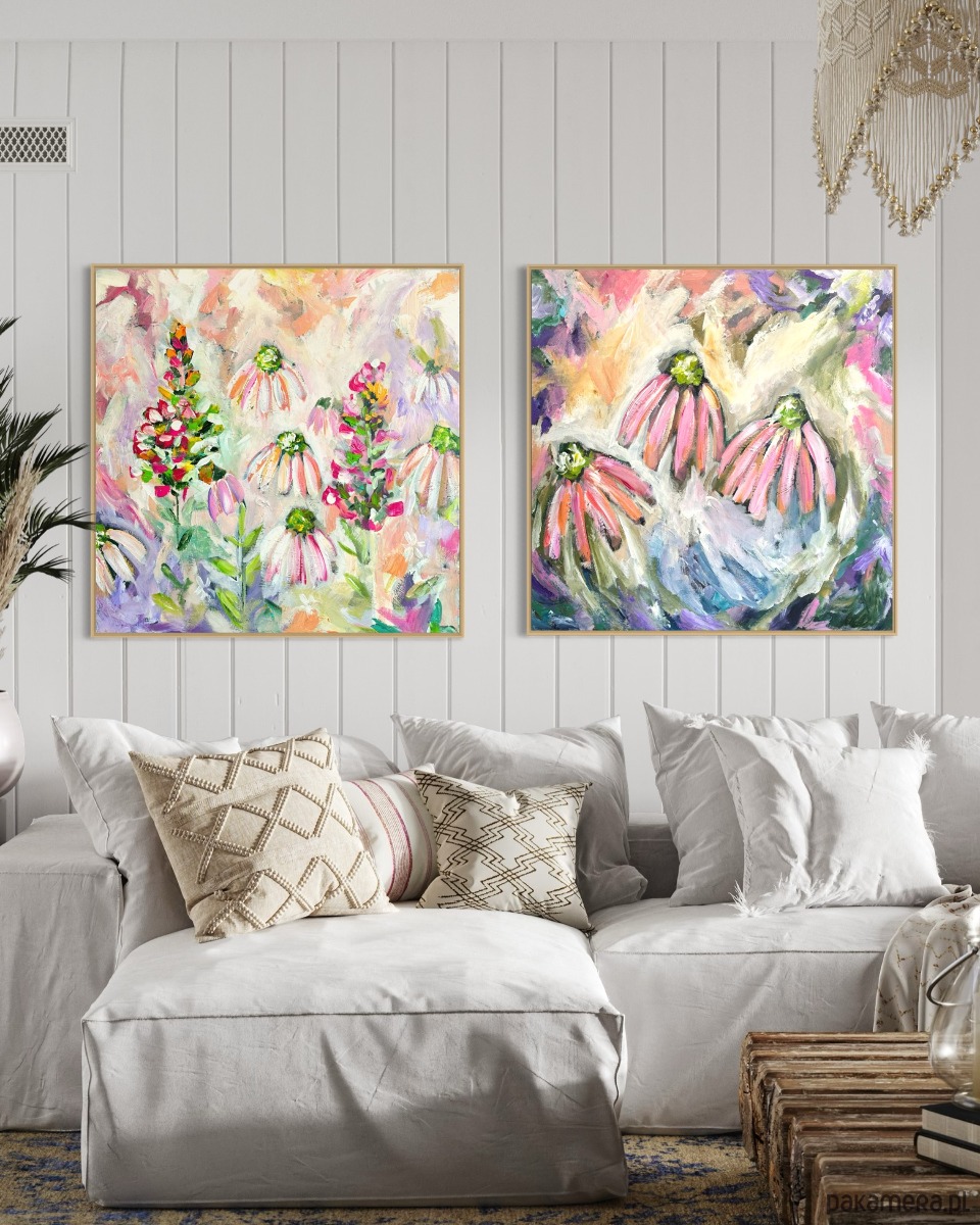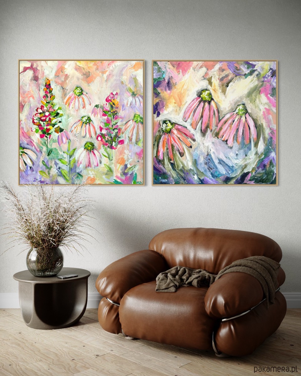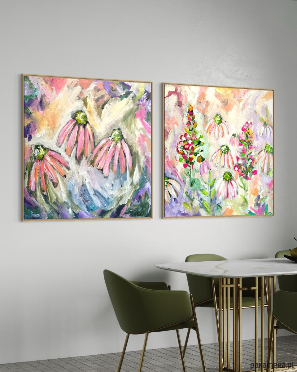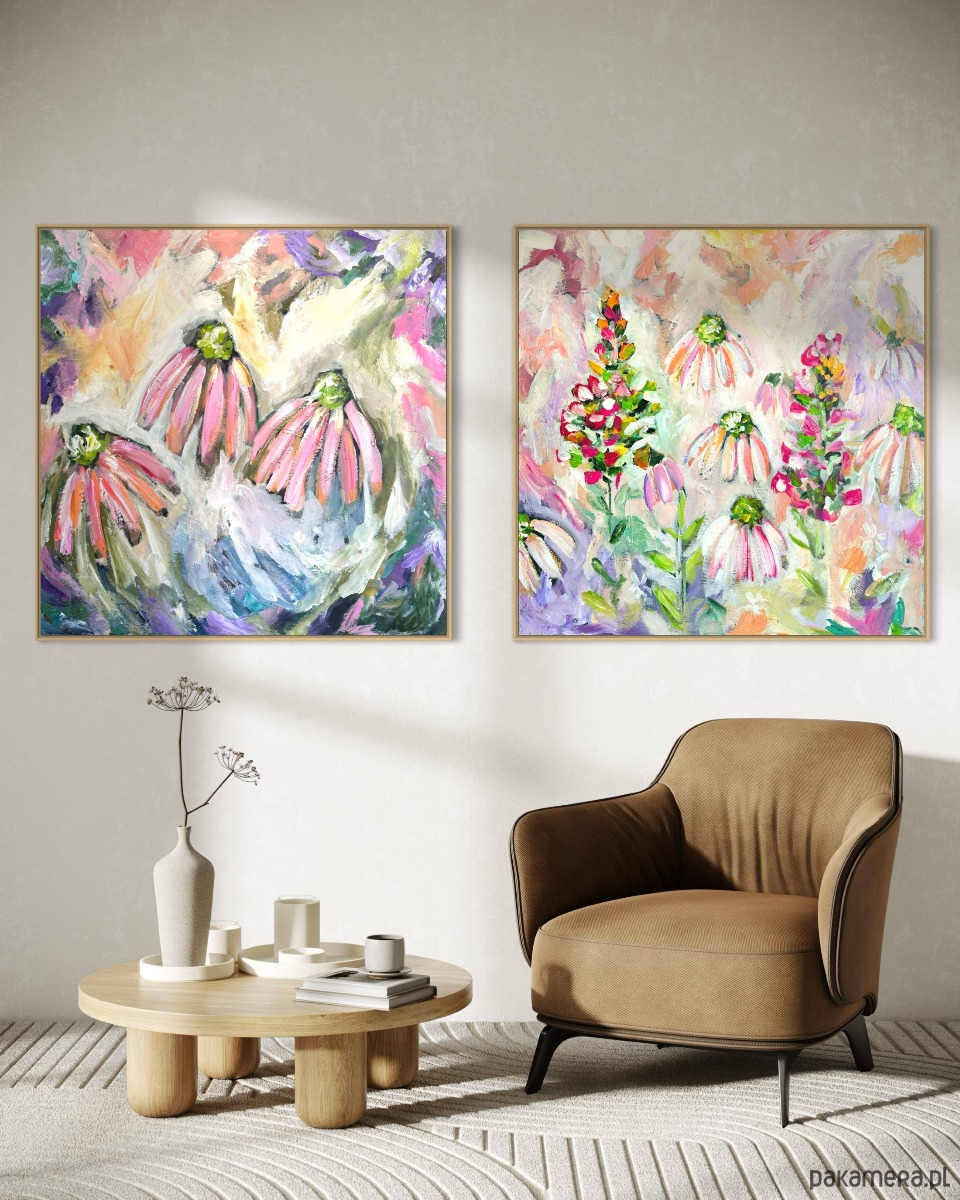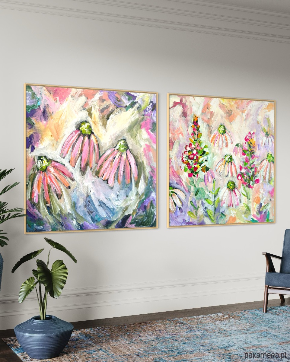 Ręcznie malowany autorski i niepowtarzalny zestaw obrazów abstrakcyjnych na płótnie, wykonany farbami akrylowymi. Płótno naciągnięte na drewnianą ramę (blejtram). Obrazy sygnowane z tyłu. Sprzedawane bez ramy zewnętrznej – widoczna na zdjęciach rama ma charakter poglądowy.