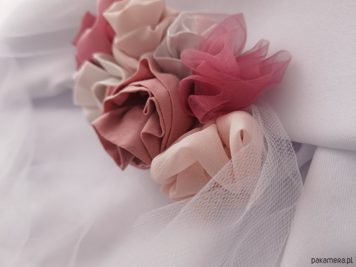 Wykonana z ręcznie zrobionych materiałowych kwiatków. Kwiatki zamontowane na elastycznym pasku tiulowym przez co ozdoba może być zastosowana zarówno jako wianek na głowę jak i np jako przewiązanie do sukienki. Wszystko ręcznie przyszyte (0 kleju) przez co bezpieczne dla skóry nawet niemowlęcej.