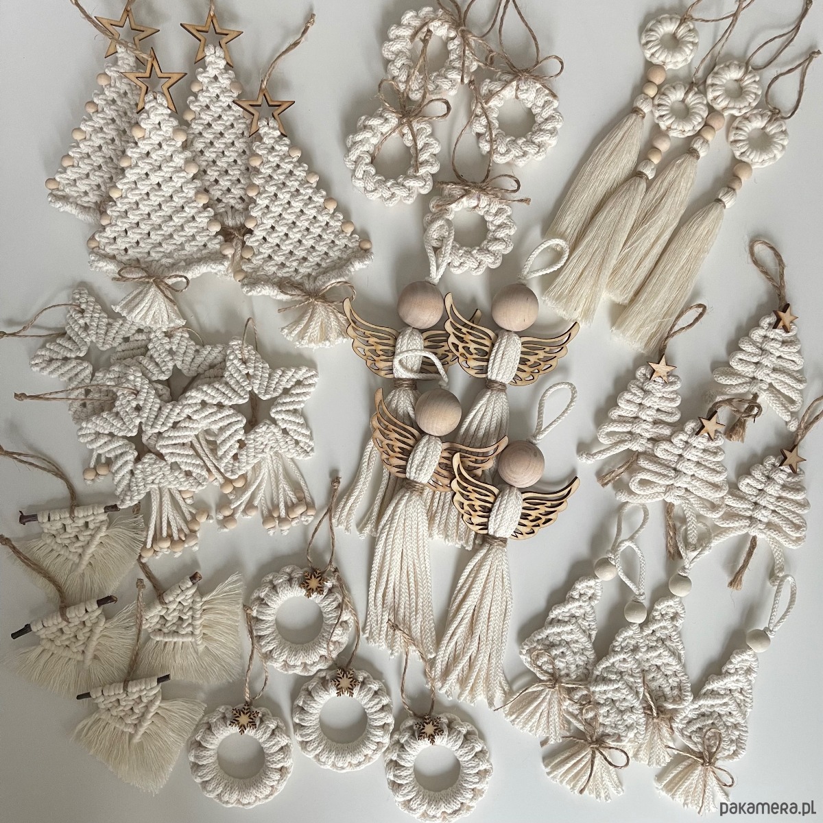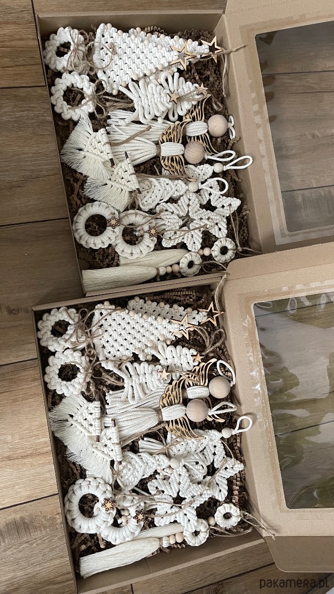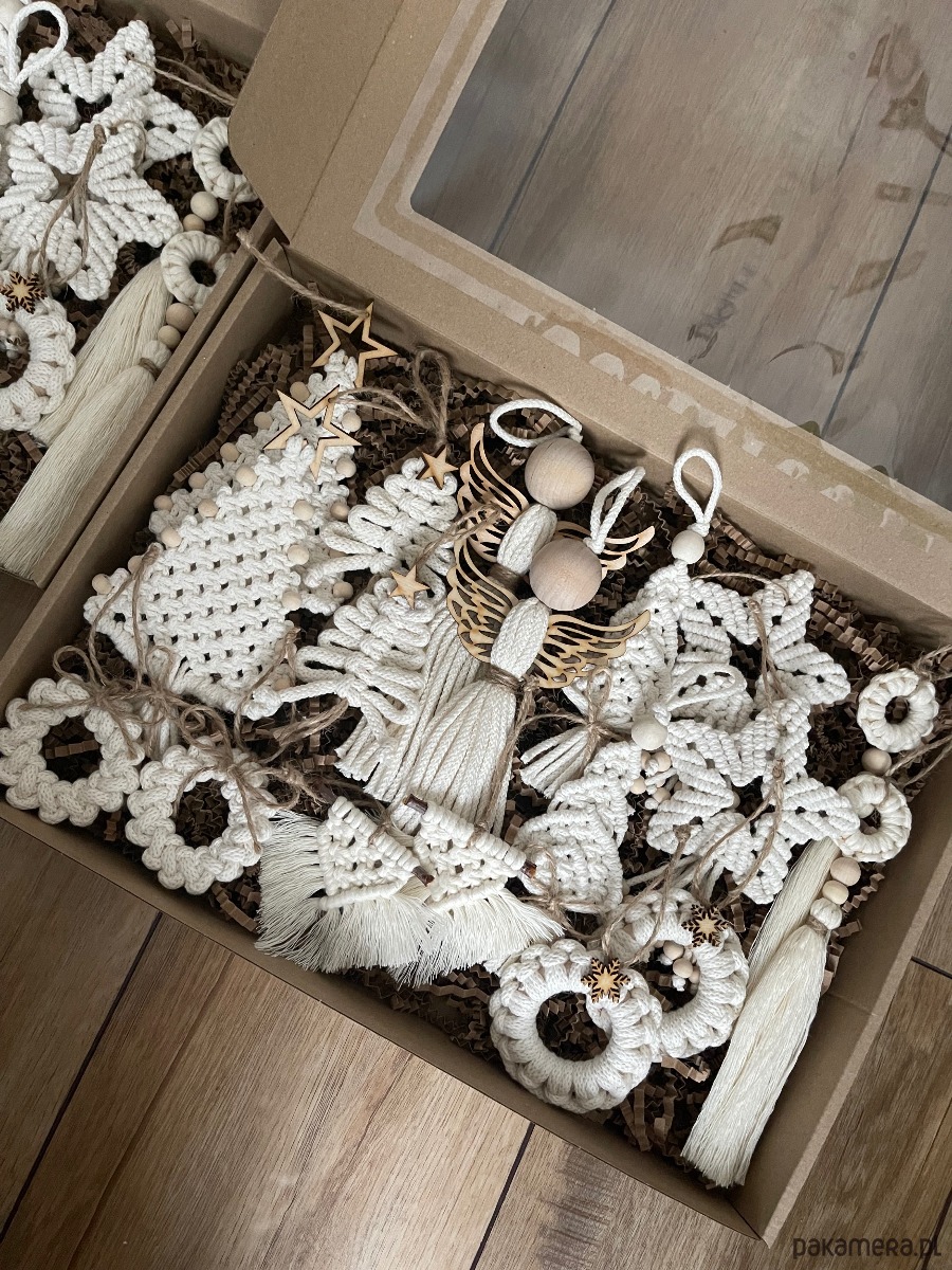 Zestaw oryginalnych ozdób choinkowych wykonanych z dbałością o każdy szczegół. Połączenie sznurka w kolorze naturalnym z drewnianymi elementami. Zapakowane na prezent - gotowe do wręczenia. Zestaw XXL