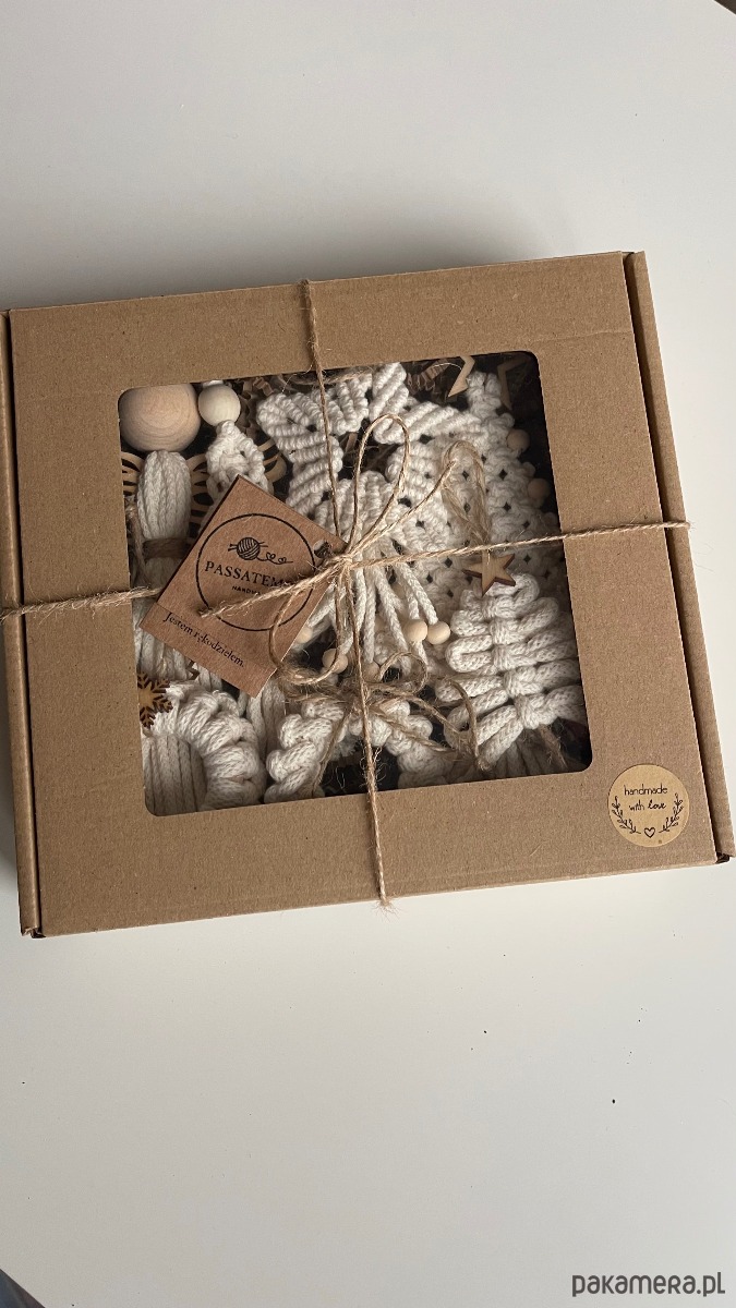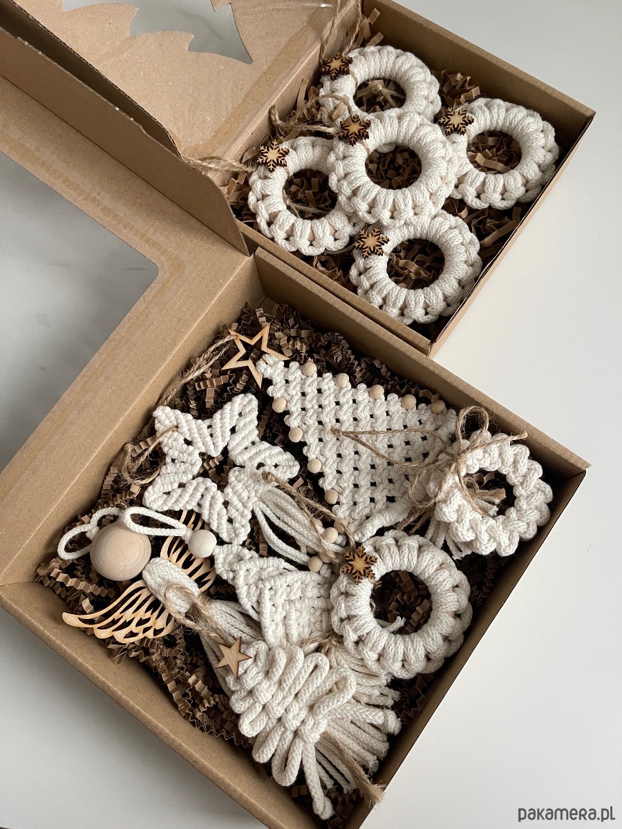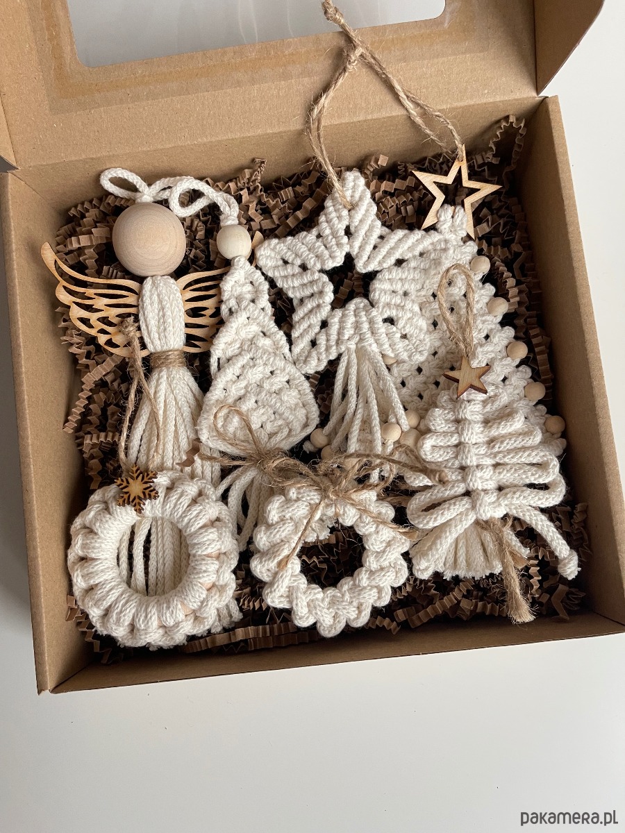 Zestaw oryginalnych ozdób choinkowych wykonanych z dbałością o każdy szczegół. Połączenie sznurka w kolorze naturalnym z drewnianymi elementami. Zapakowane na prezent - gotowe do wręczenia.