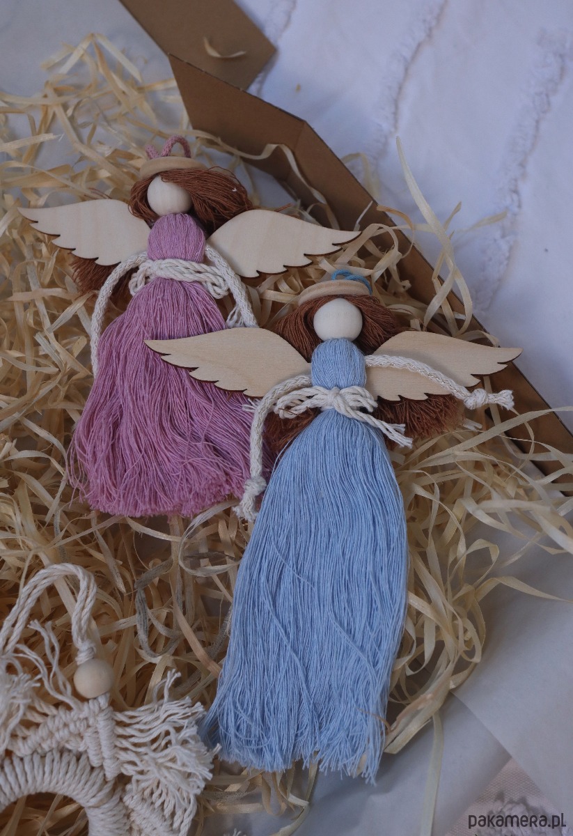 Zestaw 4ch ozdób świątecznych w formie makramowych aniołów, gwiazdki i choinki