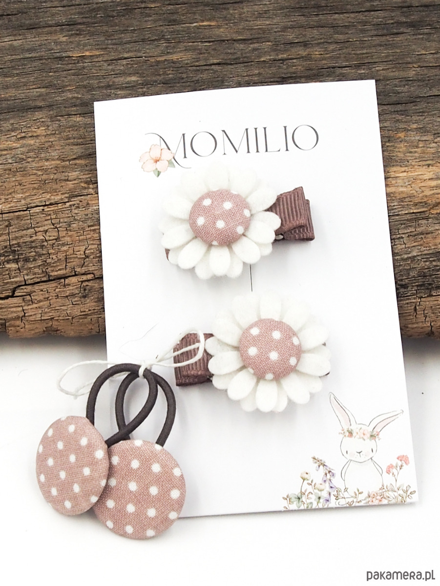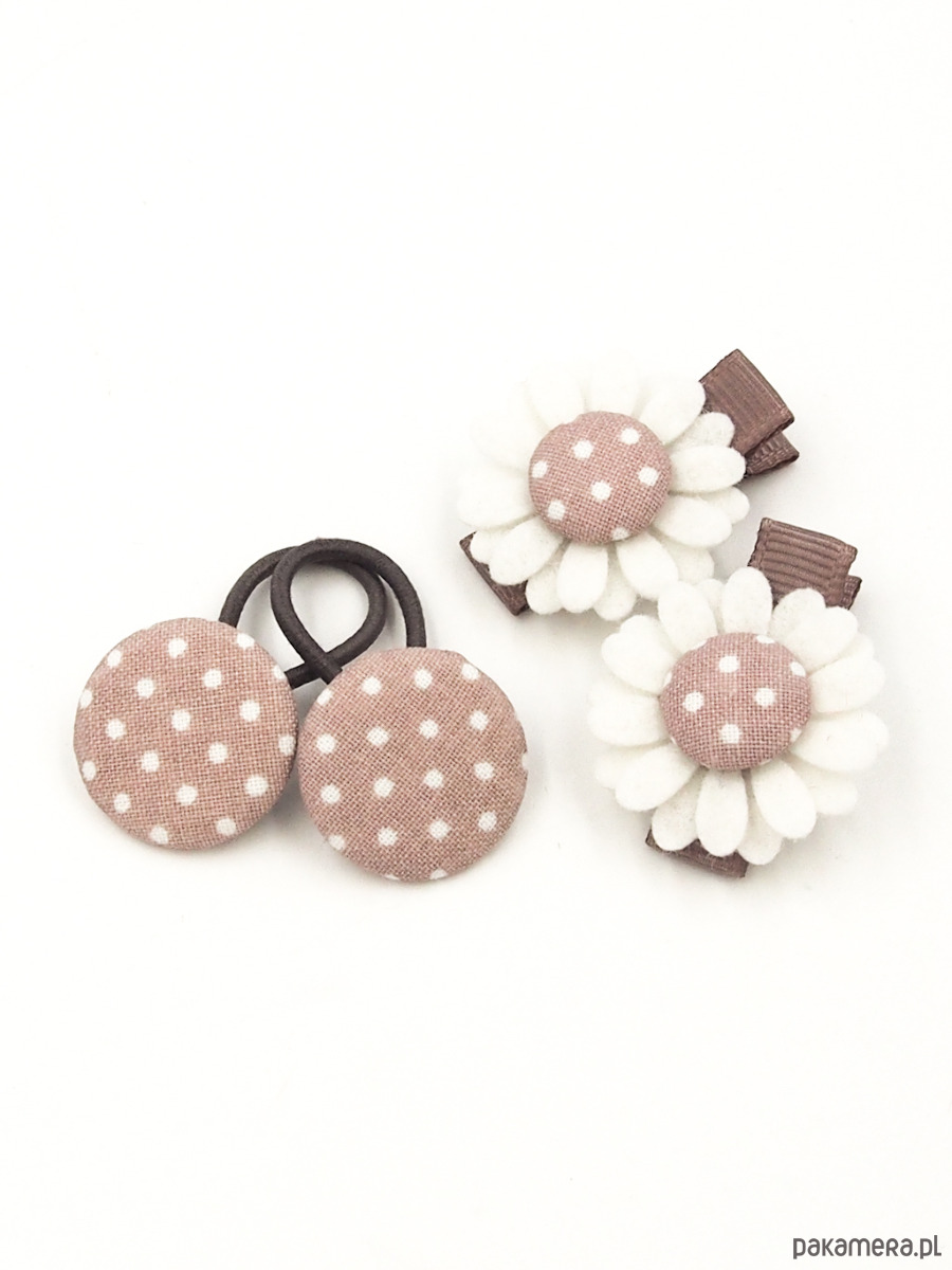 Komplet zawiera dwie gumki do włosów oraz dwie spineczki z filcowym kwiatkiem.