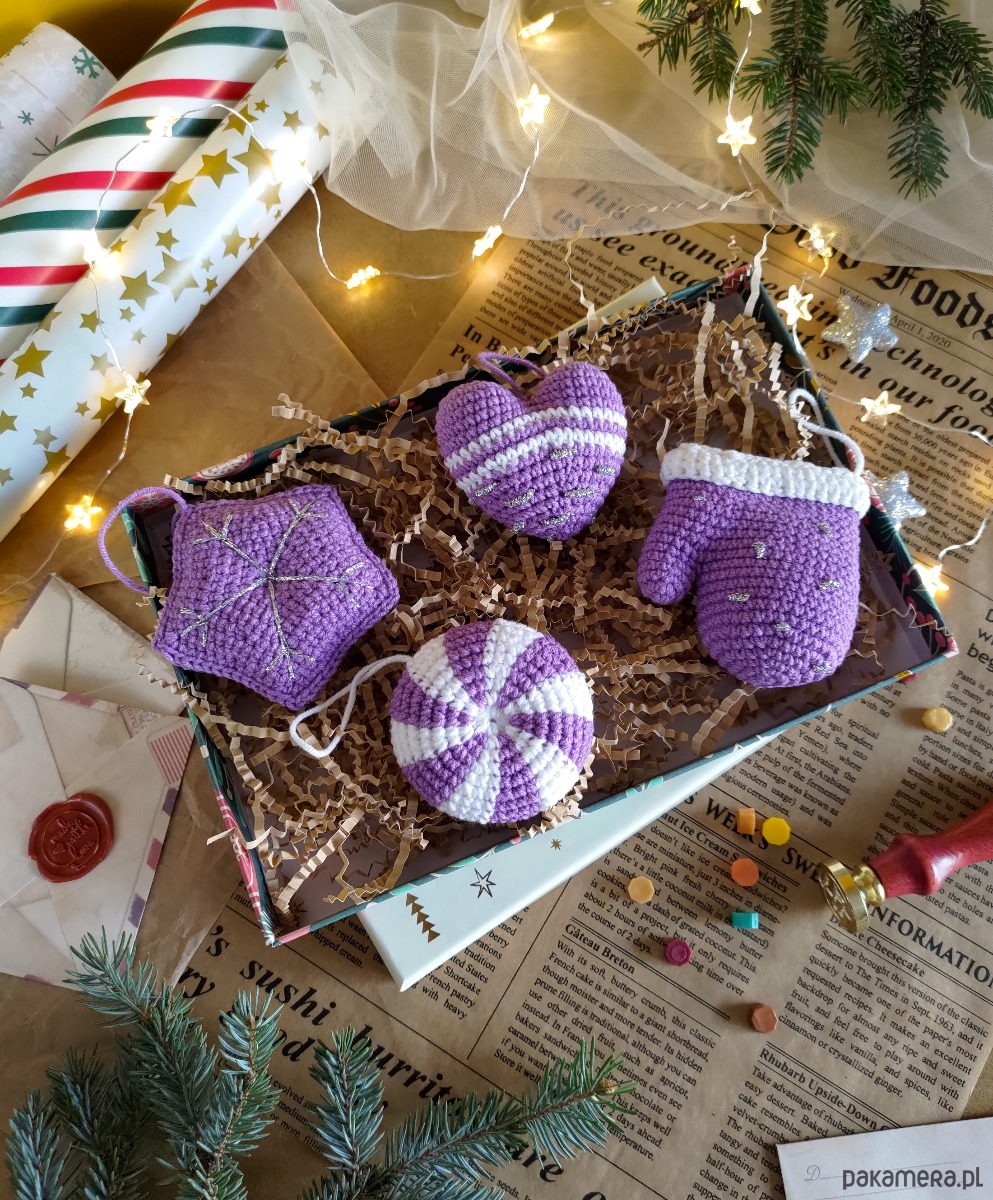 • Zestaw składa się z 4 ozdob świątecznych w kolorystyce biało-fioletowej (wymiary podane bez długości pętli do zawieszenia):