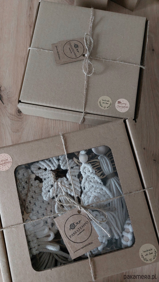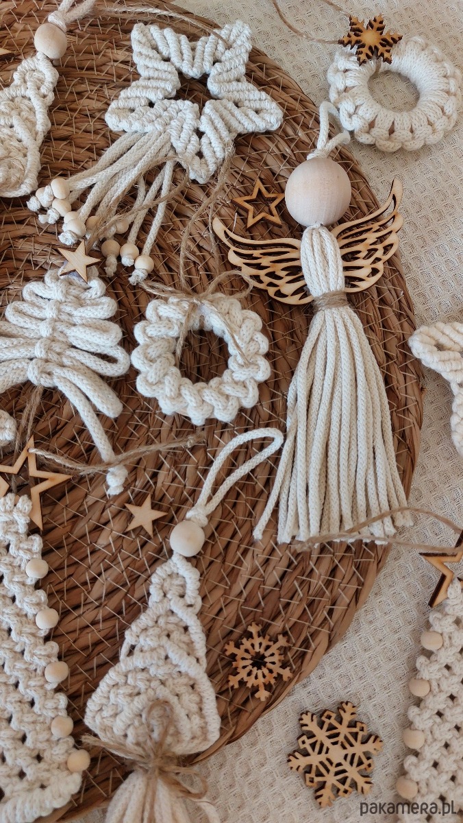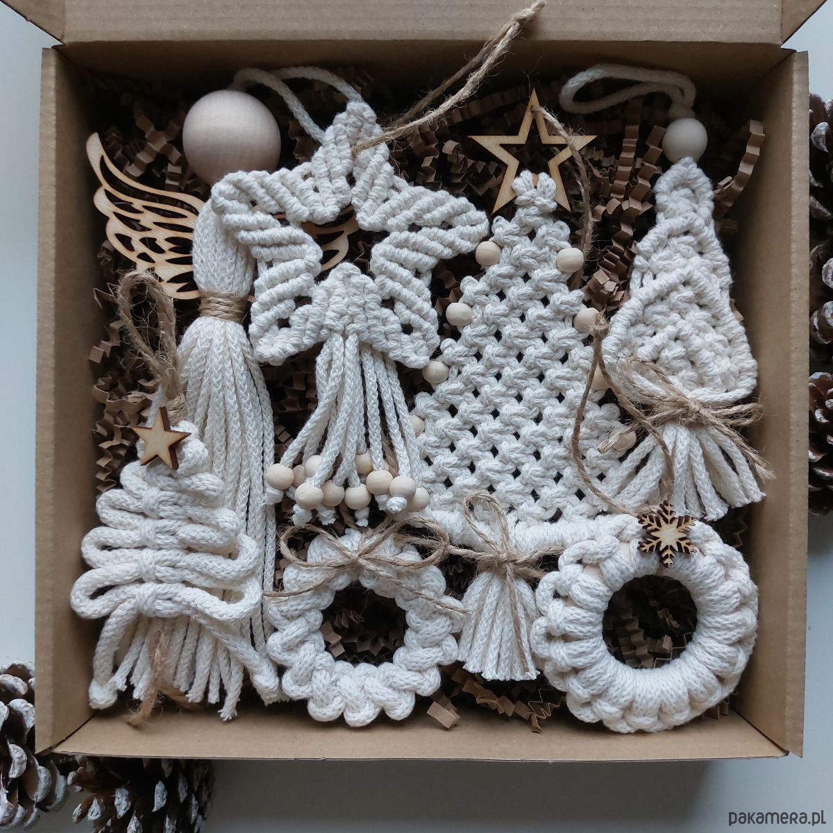 Zestaw 7 ozdób świątecznych wykonanych własnoręcznie techniką makramy.