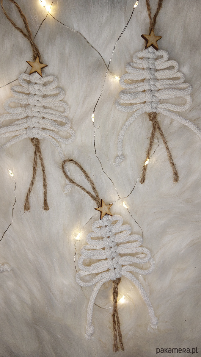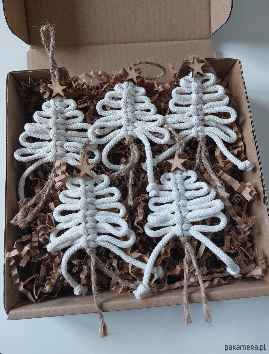 Zestaw 5 ozdób świątecznych wykonanych własnoręcznie w kolorze ecru z drewnianymi gwiazdkami z dodatkiem jutowego sznurka.