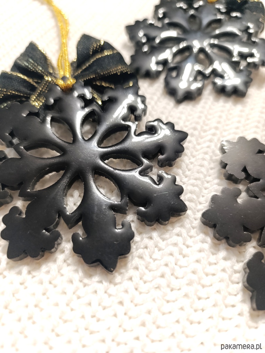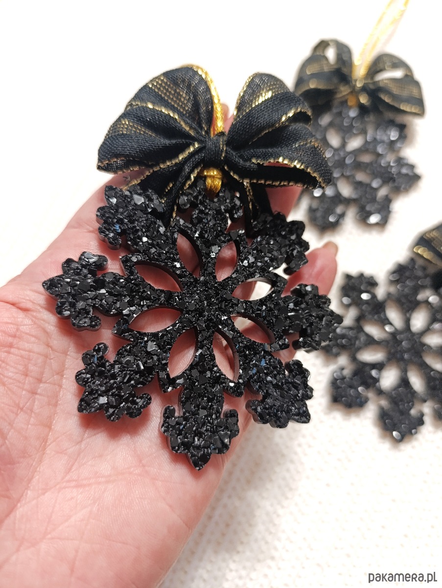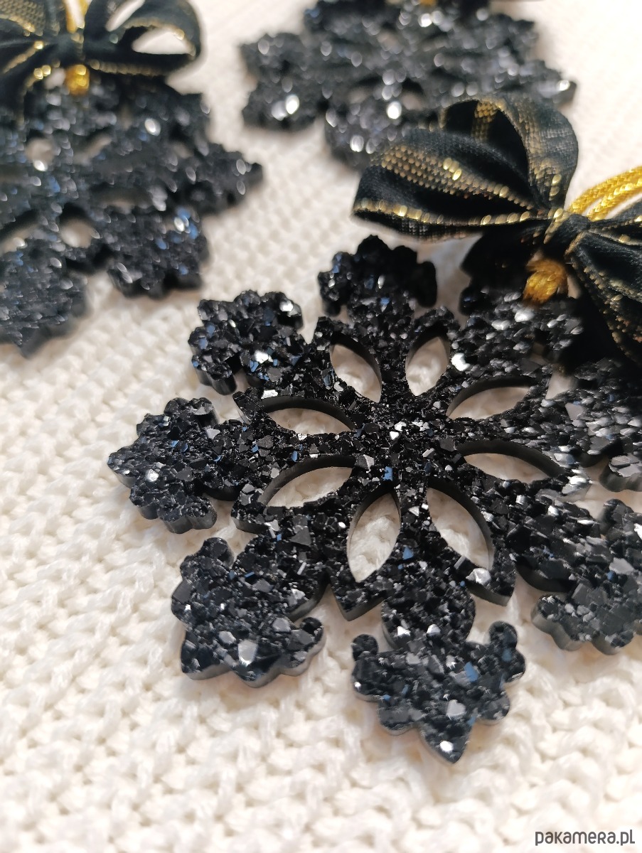 Wprowadź do swojego domu odrobinę magii dzięki unikalnym ozdobom w kształcie śnieżynek, wykonanym ręcznie z wysokiej jakości żywicy epoksydowej. Każda z nich zachwyca głęboką czernią, mieniącym się brokatem oraz subtelnymi złotymi akcentami – idealne połączenie klasyki i nowoczesności.