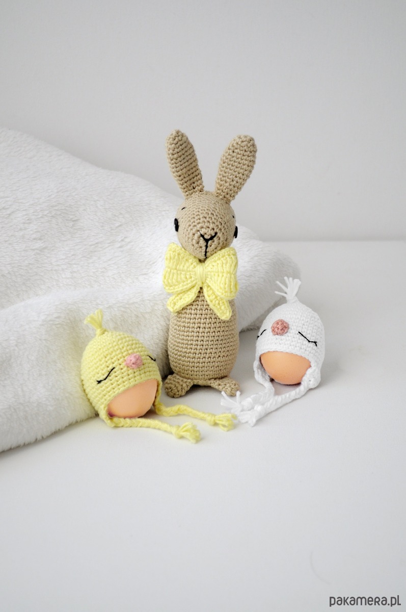 Zestaw składa się z zająca (wysokość 16cm) i dwóch czapeczek na jajka wielkanocne (na rozmiar jajek: M i S)