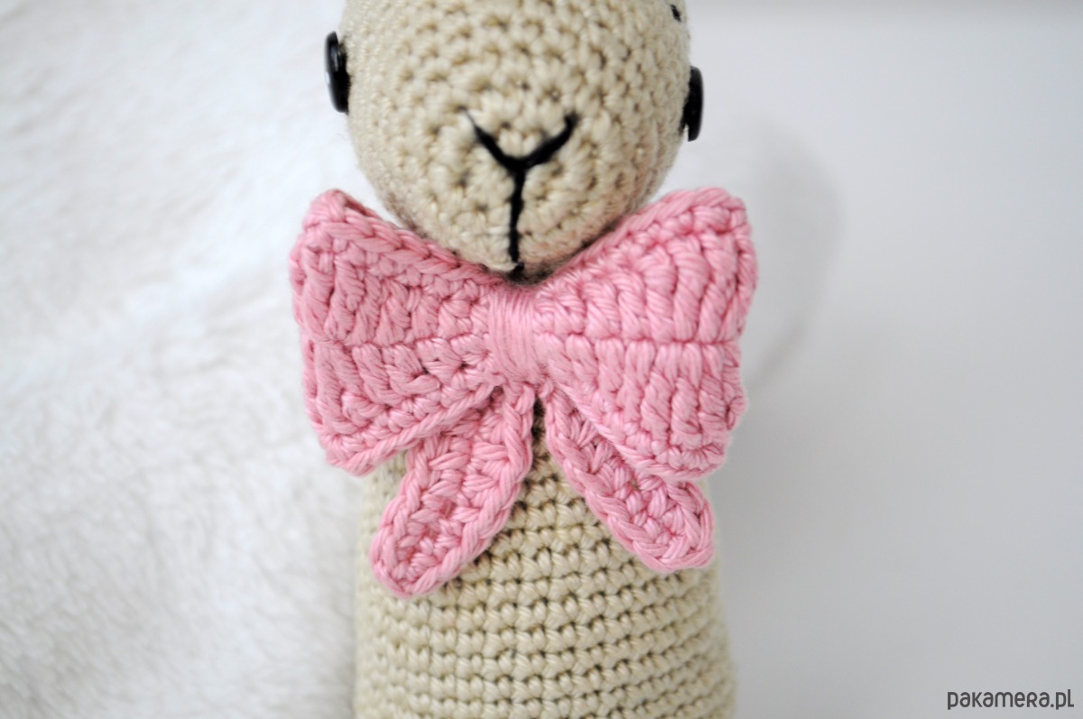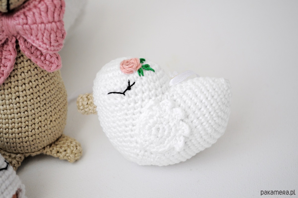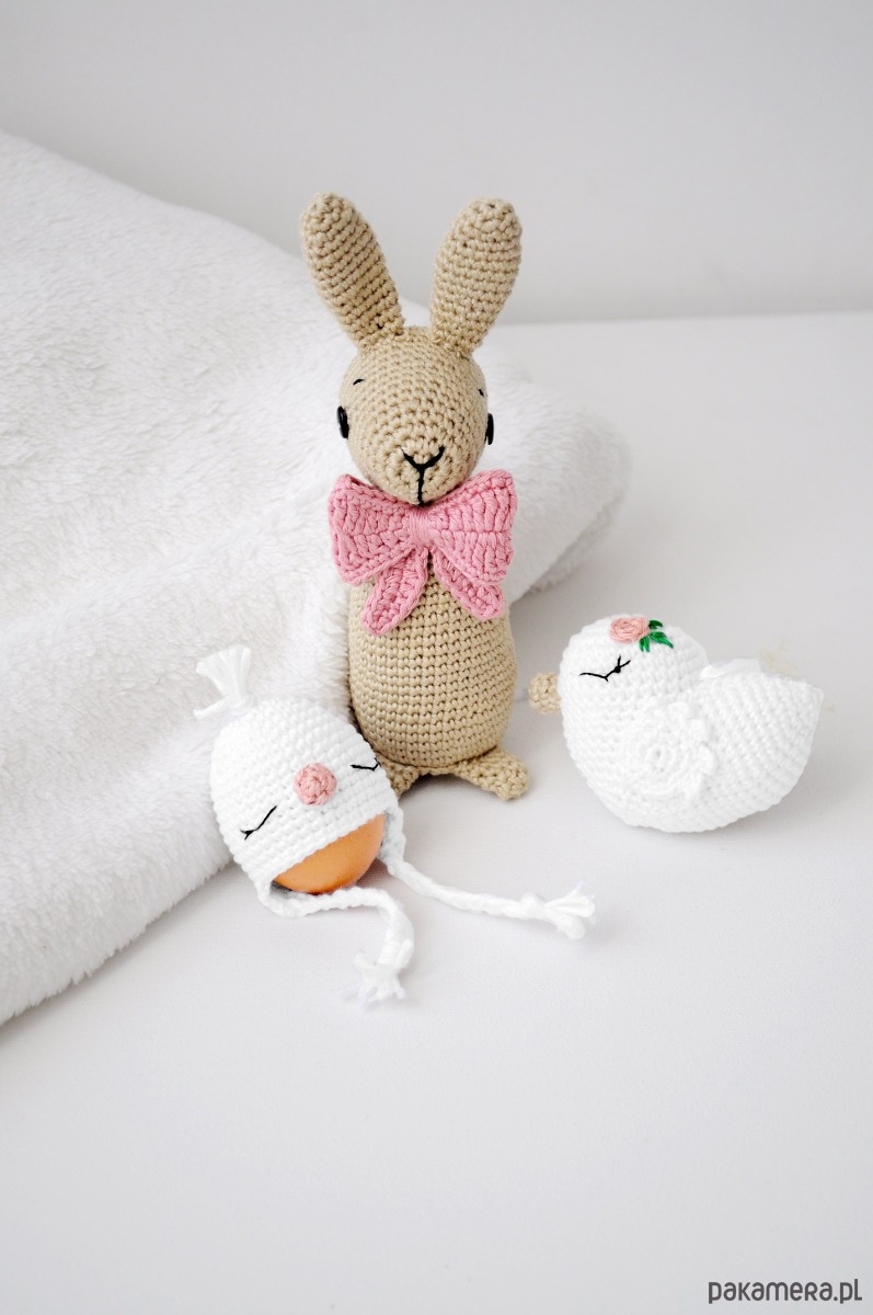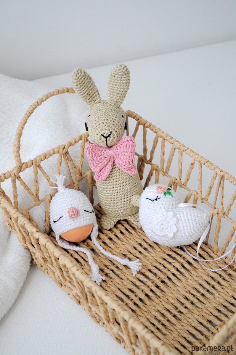 Zestaw składa się z zająca (wysokość 16cm), czapeczki na jajka wielkanocne (na rozmiar jajek: M i S) i szydełkowego ptaszka z aplikacją (wys. 6cm, szer. 8cm).